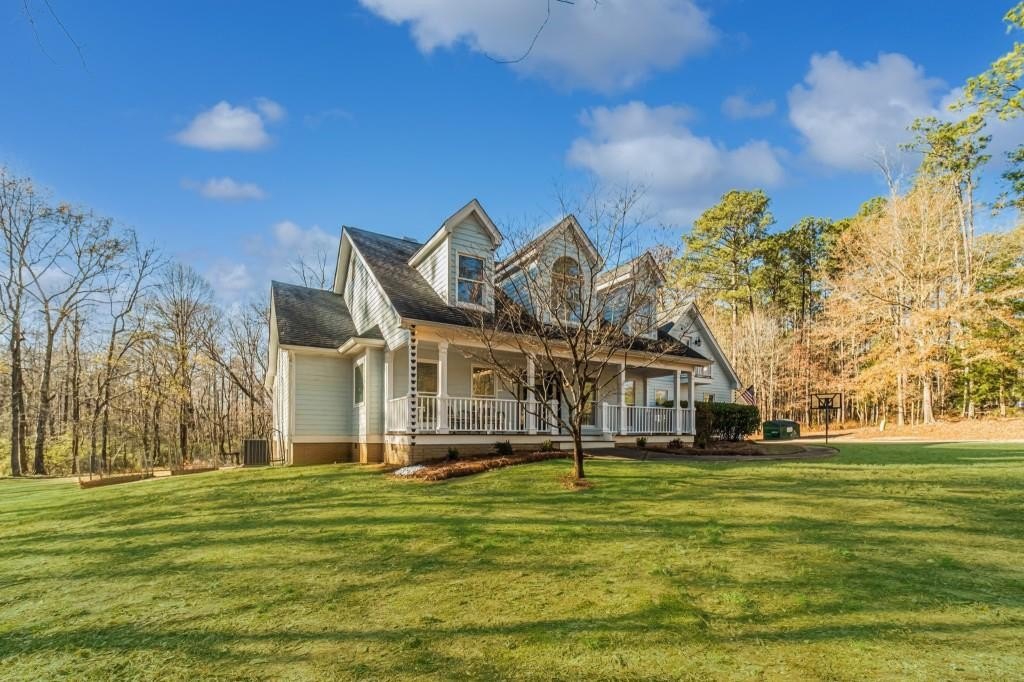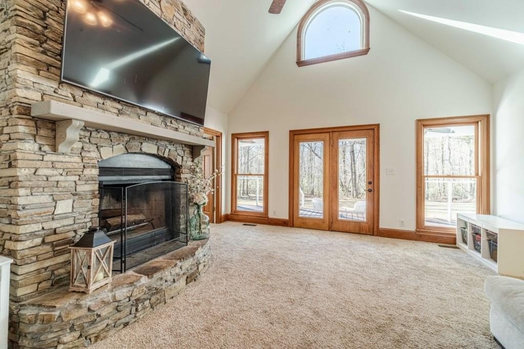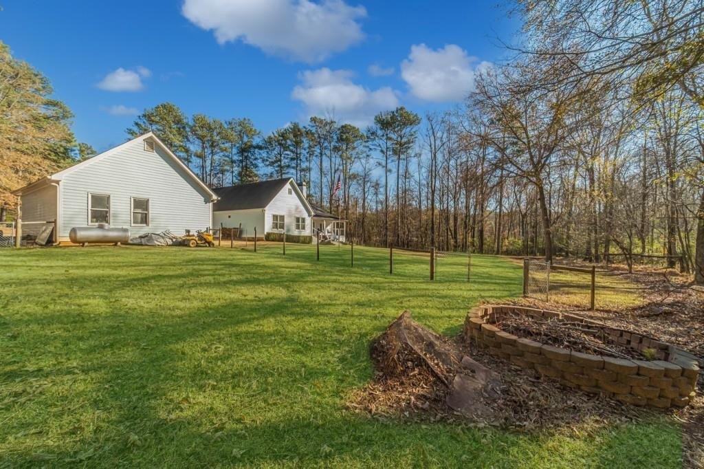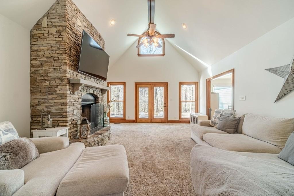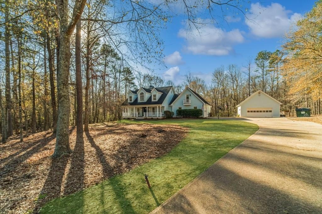 Have you been searching for a ranch home on acreage with no HOA? This is it. Situated on 4.8 gated acres of beautiful private property, this home offers space, versatility, and charm. The home features a two-car side-entry garage, plus a separate detached two-car garage with an office. Behind the detached garage is a fenced dog run and two chicken coops-perfect for chickens, goats, or other animals. Enjoy the large rocking-chair front porch and a covered rear deck with a new wide staircase leading to a level backyard. Mature trees provide wonderful privacy throughout the property. The main level offers three bedrooms and two full baths, both of which have been updated with tasteful, modern finishes. The oversized dining room easily accommodates a table for ten to twelve. The great room features a stacked-stone masonry fireplace with a propane starter and soaring vaulted ceilings. The kitchen includes abundant solid wood cabinetry, solid surface countertops, and a breakfast room with a bay window overlooking the backyard. The primary suite offers a large walk-in closet, double tray ceiling, and direct access to the rear deck. Built-in bookshelves are found in four rooms throughout the home. The main-level laundry room includes a sink and space to add an additional toilet. Upstairs is a bonus room with its own full bath, large walk-in closet, attic access, and a charming Romeo and Juliet balcony. Additional features include low utility costs with septic and well water, many Champion energy-efficient replacement windows, an 8-year-old roof, a new water heater, fresh neutral interior paint, HardiPlank exterior siding, and HVAC ductwork replaced in 2021. Plenty of storage throughout, plus a crawl space with a vapor barrier and a sump pump. The house is all electric; however, there are two propane tanks installed. One tank is for the range, and one is for the fireplace starter.