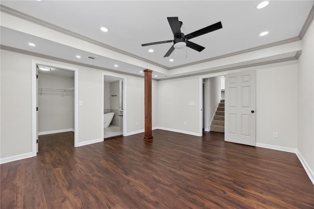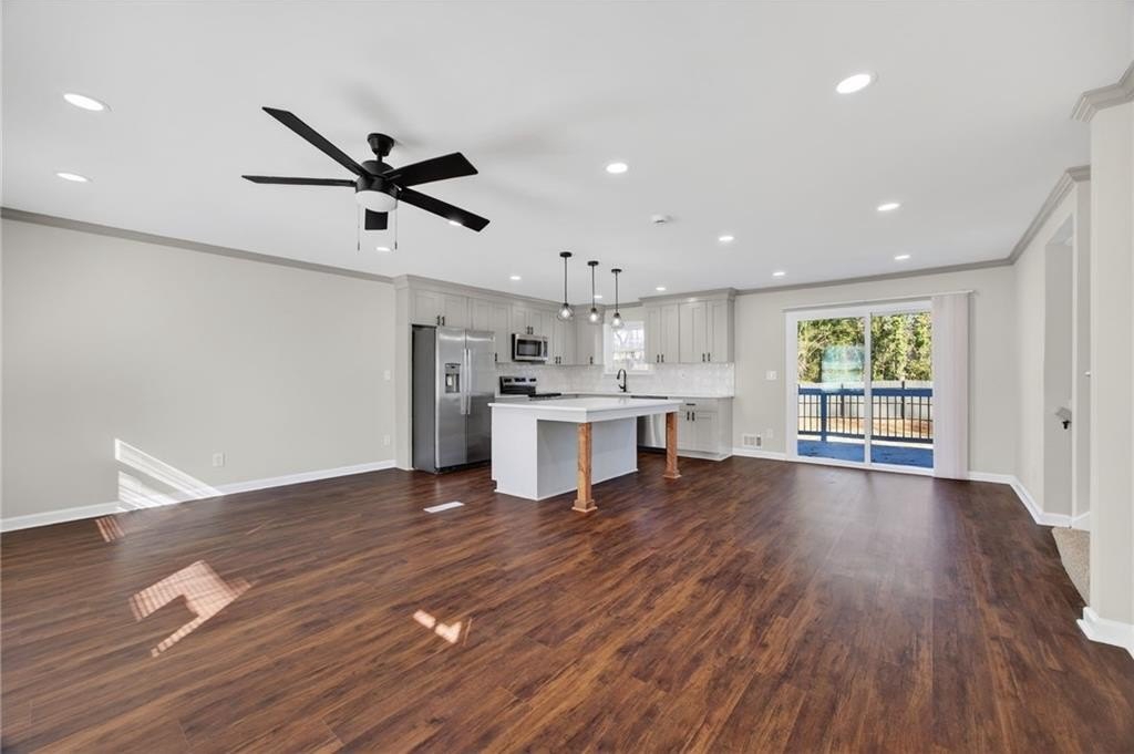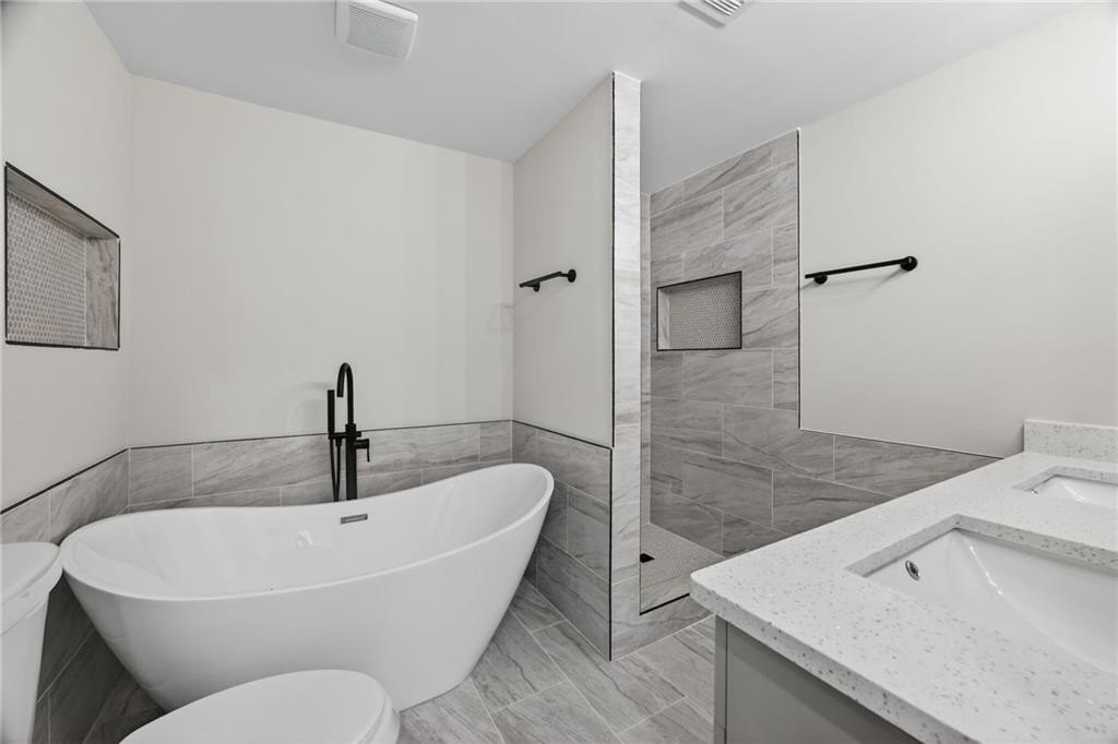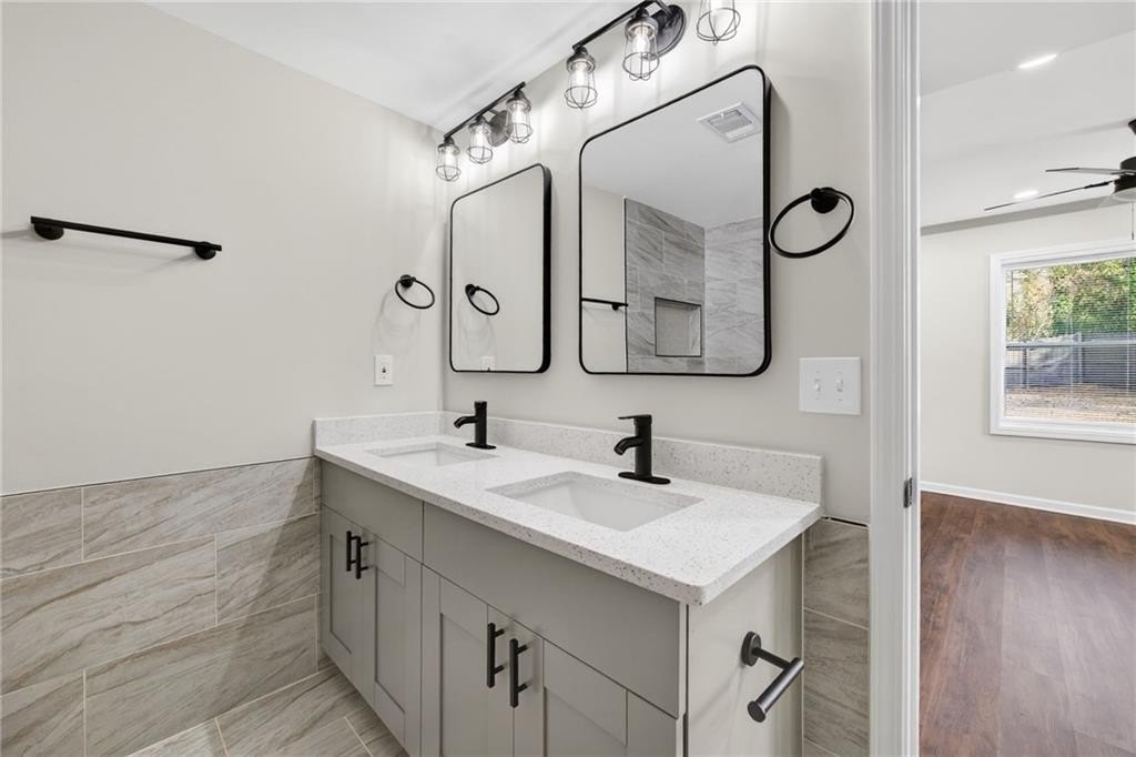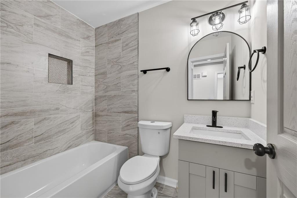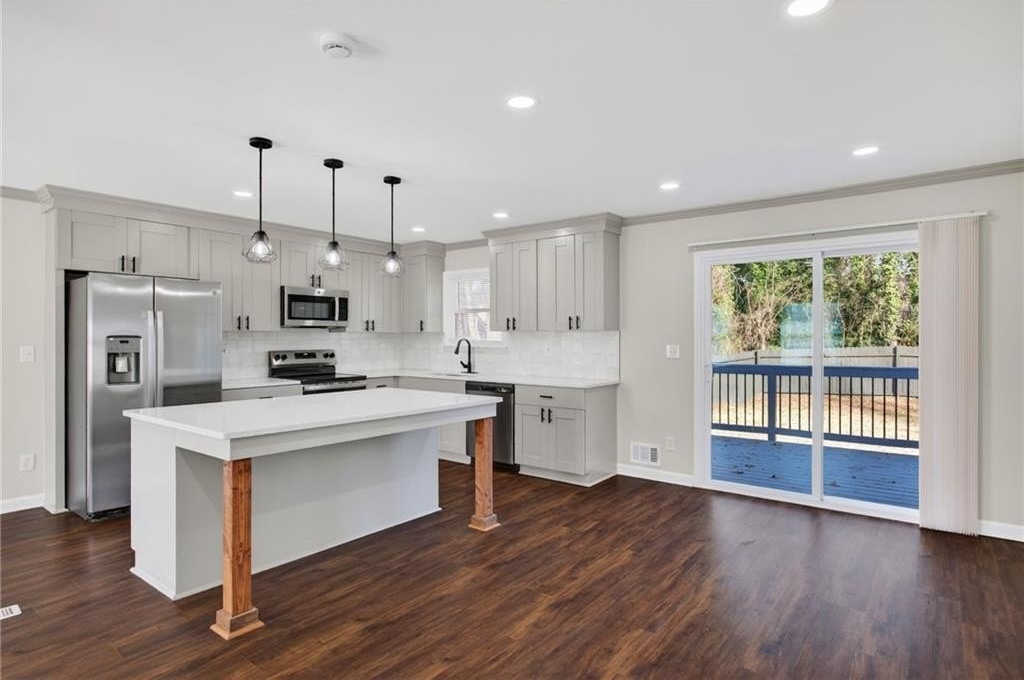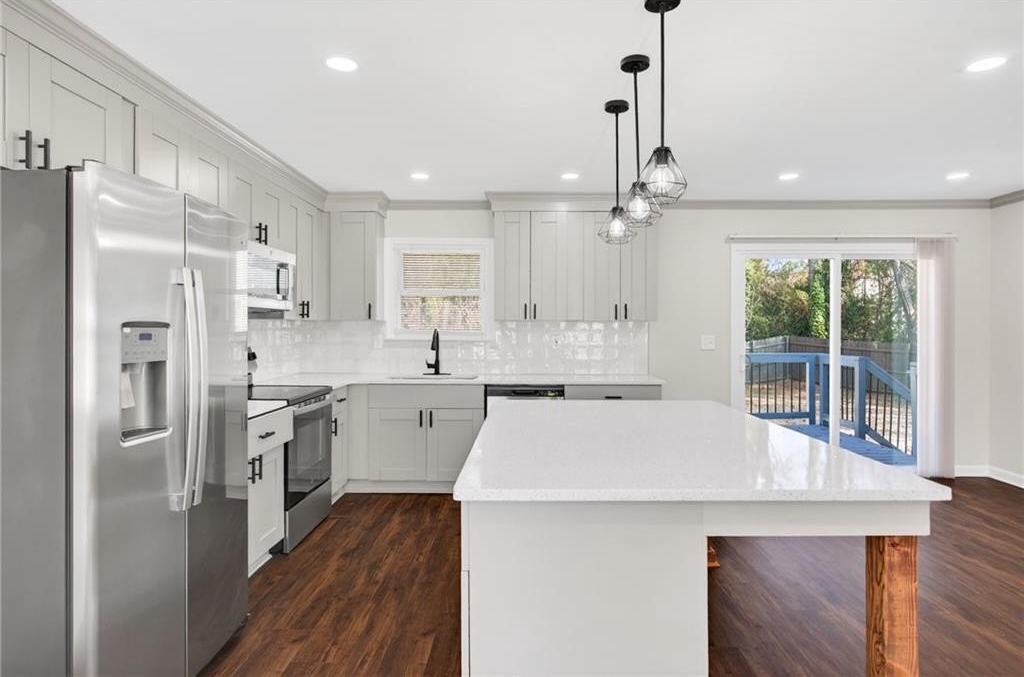 Modern Renovated Split-Level - Move-In Ready in Ellenwood - Great Commuter Location! Welcome home to this beautifully renovated 4-bedroom, 3-bathroom split-level home, offering a perfect blend of modern design, thoughtful functionality, and move-in-readiness. Recently remodeled from top to bottom, this home features new luxury vinyl plank flooring, new windows, fresh interior and exterior paint, updated bathrooms, a new HVAC system, upgraded electrical, a new roof, and new gutters. The main level boasts an open-concept living area designed for everyday comfort. A bright living room flows seamlessly into the tastefully updated kitchen, complete with stainless steel appliances, granite countertops, a decorative tile backsplash, a center island with pendant lighting, and a breakfast bar. A dedicated breakfast area offers additional space for casual meals. Retreat to the primary suite on the lower level, a private sanctuary with a spacious layout and a well-appointed ensuite bathroom featuring a double vanity, soaking tub, separate tile shower, and generous walk-in closet. Upstairs, three additional generously sized bedrooms provide flexible living options. One bedroom includes its own private bathroom with a tile shower, ideal for guests or a secondary suite. The remaining bedrooms share an updated full bathroom. Extend your living space outdoors with a large wood deck and concrete patio, perfect for grilling, entertaining, or simply relaxing in the fresh air. The fully fenced backyard offers privacy and plenty of space for pets, play, or gardening. An oversized driveway provides ample parking for multiple vehicles. Located in a quiet, established neighborhood, this home offers easy access to major commuter routes, including I-675 and I-285. It is just a short drive to Fort Gillem, Clayton State University, downtown Atlanta, and Hartsfield-Jackson Atlanta International Airport. Enjoy nearby conveniences, including Southlake Mall, grocery options such as Costco, Ingles Markets, and Walmart Supercenter, local spots like Mojo Coffee Company and Eggs Up Grill, and outdoor recreation at Reynolds Nature Preserve. Whether you're looking for comfortable everyday living, space for family and guests, or convenient access to shopping and dining, this property delivers exceptional value and lifestyle appeal. Don't miss the opportunity to make this beautifully updated home yours!