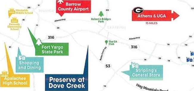 RATES AS LOW AS 4.99% AND SELLER PAID CLOSING COSTS ON SELECT INVENTORY!! BARROW COUNTY'S PREMIERE COMMUNITY features, a pool, tennis and pickle ball courts, walking trails, playground, and a clubhouse with serving kitchen and gathering room. Preserve at Dove Creek is a 100% USDA FINANCING qualified neighborhood. Must see the popular HAYDEN FLOOR PLAN 5 bedrooms, 3 FULL BATHS with owner suite and loft on the 2nd floor. Main floor features a guest bedroom with full bath along with 3 generous sized secondary bedrooms on 2nd floor. The Hayden offers a modern open concept layout beautiful kitchen with a large center island opens to the family room with a cozy fireplace. Separate flex room that can be used as a formal dining room or home office. Covered back patio, sharker soft close cabinet, quartz counter-top, and luxury vinyl flooring on the main level. Upstairs feature a large Owners suite with separate tub and shower and a big walk-in closet. Preserve at Dove Creek is located just 10 minutes from FORT YARGO STATE PARK and 20 minutes from ATHENS GA. We are located within 2.5 miles from 316, with easy access to the city and surrounding suburbs. ALL Homes are equipped with a Smart Home System and designed 3 Zoned Sprinklers Systems. Photos used for illustrative purposes and do not depict actual home. Incentives and prices are subject to change at any time. Contracts are submitted on Builders forms only.