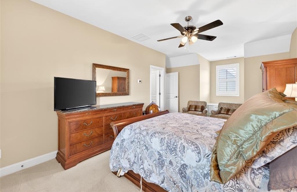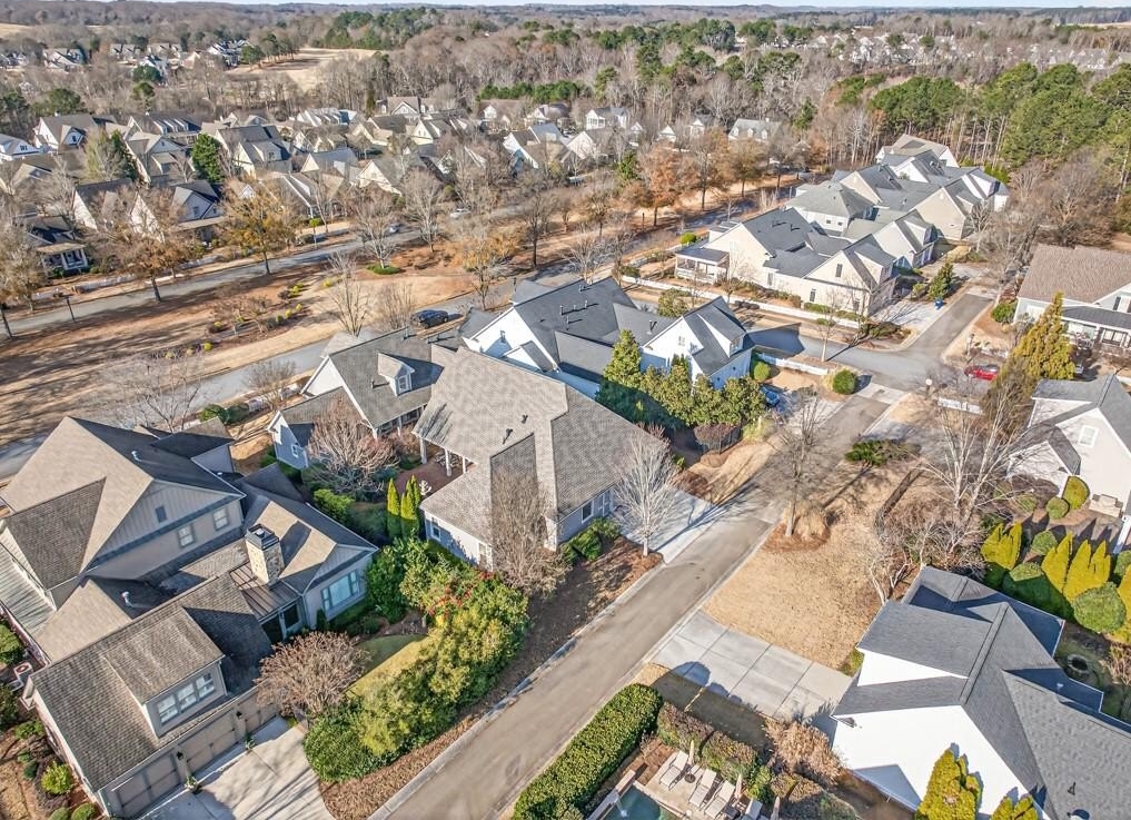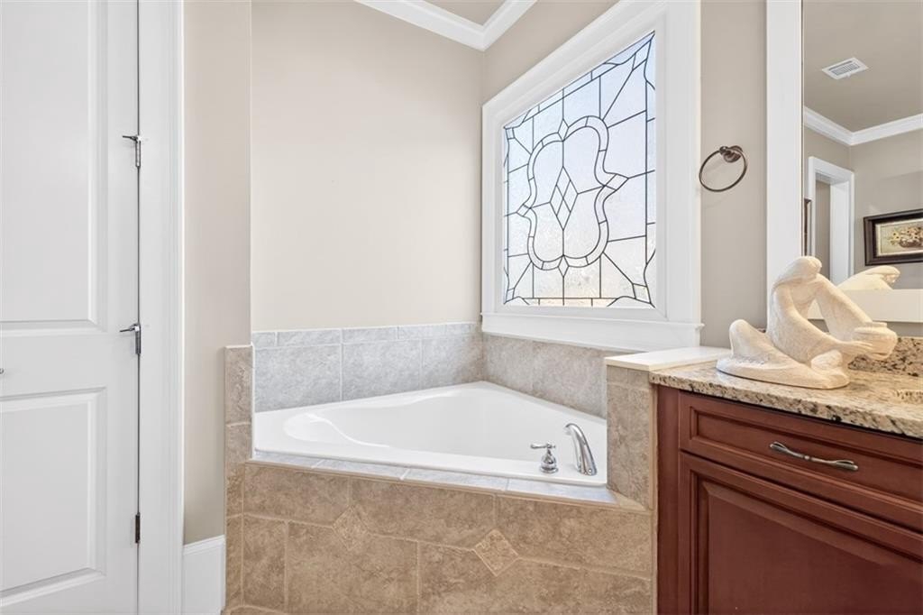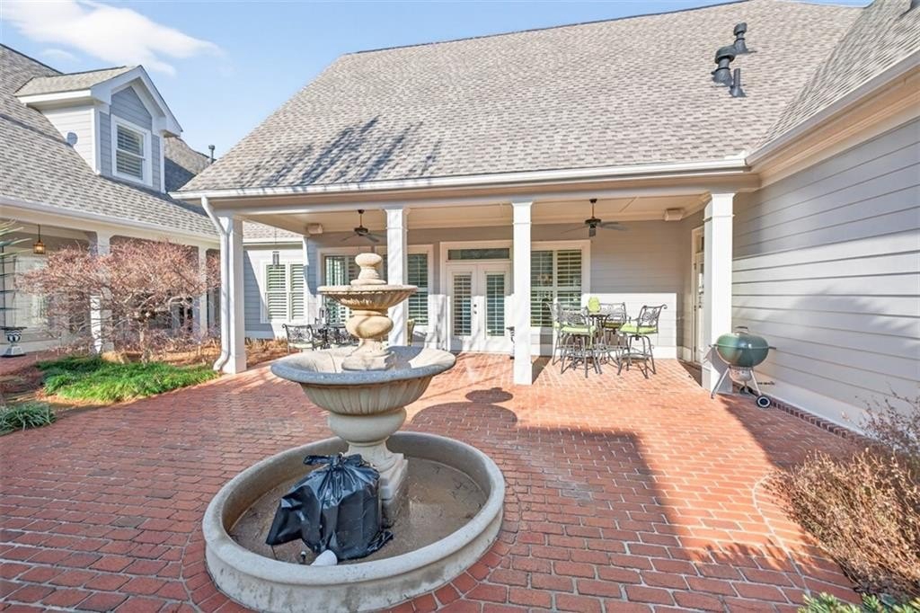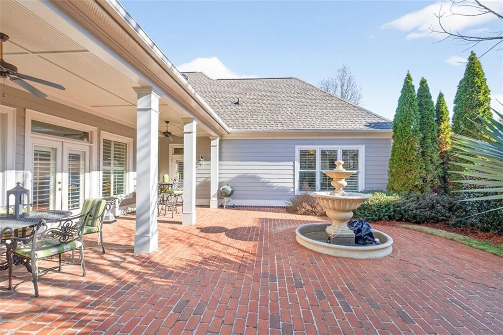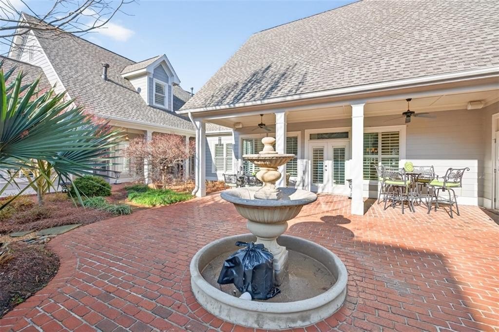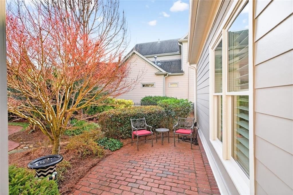 This elegantly decorated home is truly one of a kind located in the desired North Hill neighborhood of The Georgia Club. The welcoming brick rocking chair front porch overlooks a large neighborhood park and opens into a beautiful, private, fenced courtyard oasis. There are multiple entrances to the home off the courtyard with lots of natural light and beautiful views! All four bedrooms and four full baths are uniquely separate from each other, providing impressive privacy. Off the beautiful courtyard, you enter the front door to the main living area including an open concept kitchen, family room, and breakfast room that seamlessly share a spectacular cathedral ceiling and gas log fireplace. The kitchen features a large island with a farm sink and granite, a six-burner gas stovetop, double ovens, microwave and wine/beverage refrigerator, spacious walk-in pantry and tons of kitchen cabinets. There is also a cozy sitting area for conversation with the cook and a light and bright breakfast area. On the main level, you will also find a large separate elegant dining room and a large secondary family room that overlooks the community park and has a gorgeous stacked stone fireplace. A secondary bedroom with a built-in desk and a full bath are off the main entry foyer. The master suite is on the main level and is separated by a hallway which gives this area a lot of privacy. A large master is accompanied by a huge walk-in closet and a bathroom with two vanities, walk-in shower, jetted tub with a beautiful stain glass window and a large water closet. The master suite opens up and overlooks the courtyard. A lovely staircase leads upstairs to a large spacious bedroom and a full bath. A back entry foyer/mudroom opens to the spacious laundry room with sink and to the large garage with two full bays, a golf cart bay, lots of shelving, and even room for an additional refrigerator. There's plenty of outdoor living space and the home was designed to wrap around the gorgeous courtyard. The courtyard has several sitting areas and an outdoor covered veranda with ceiling fans for relaxing and/or dining. The center attraction is a fountain. This area is fenced and great for keeping track of kids or pets. Additionally, accessed off the courtyard, you will find a separate guest suite with bedroom, bath and kitchenette has its own private entrance. Home features and upgrades include new TRAN HVAC systems, new roof, and two newer water heaters. Home exterior painted in 2024. Hardwood floors in most of the main level. Plantation shutters in great room and guest bath and blinds on all other windows. Sound system with speakers in living room, dining room, master bedroom and bath and courtyard. Alarm system & sprinkler system. Washer and dryer and all kitchen appliances remain with the home. HOA weekly lawn maintenance includes mowing, pruning, weeding, and spraying and cutting. Located on the club side of The Georgia Club, an easy walk from the clubhouse, driving range, fitness center & aquatic complex. The Georgia Club is a gated community & private club with 27 holes championship golf, aquatic & fitness center, restaurant open 6 days/week, lighted tennis courts and more!