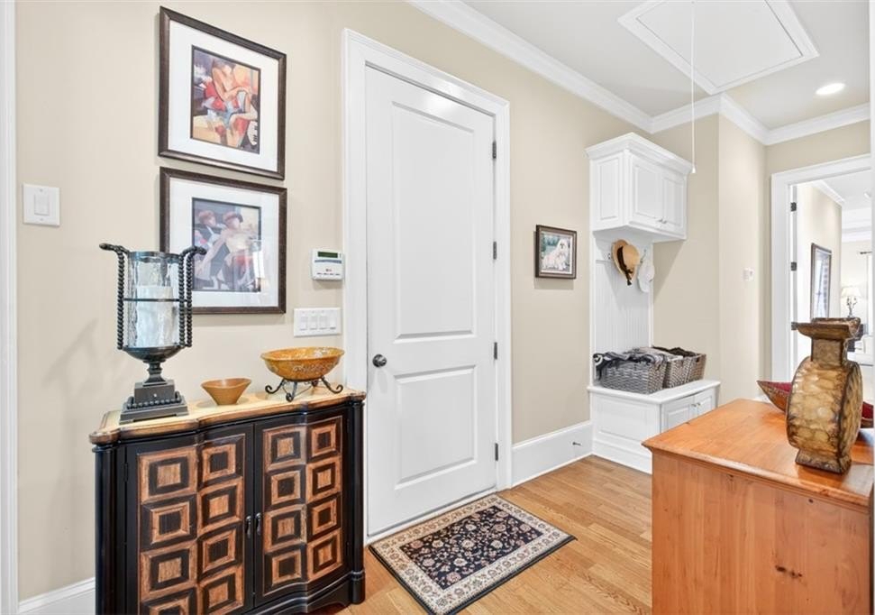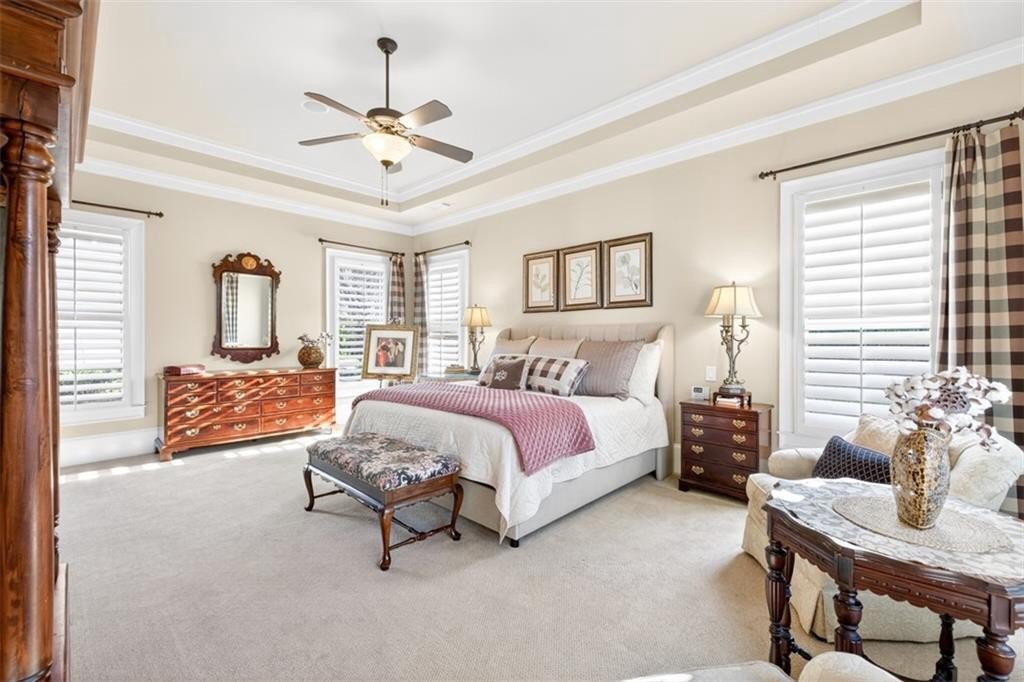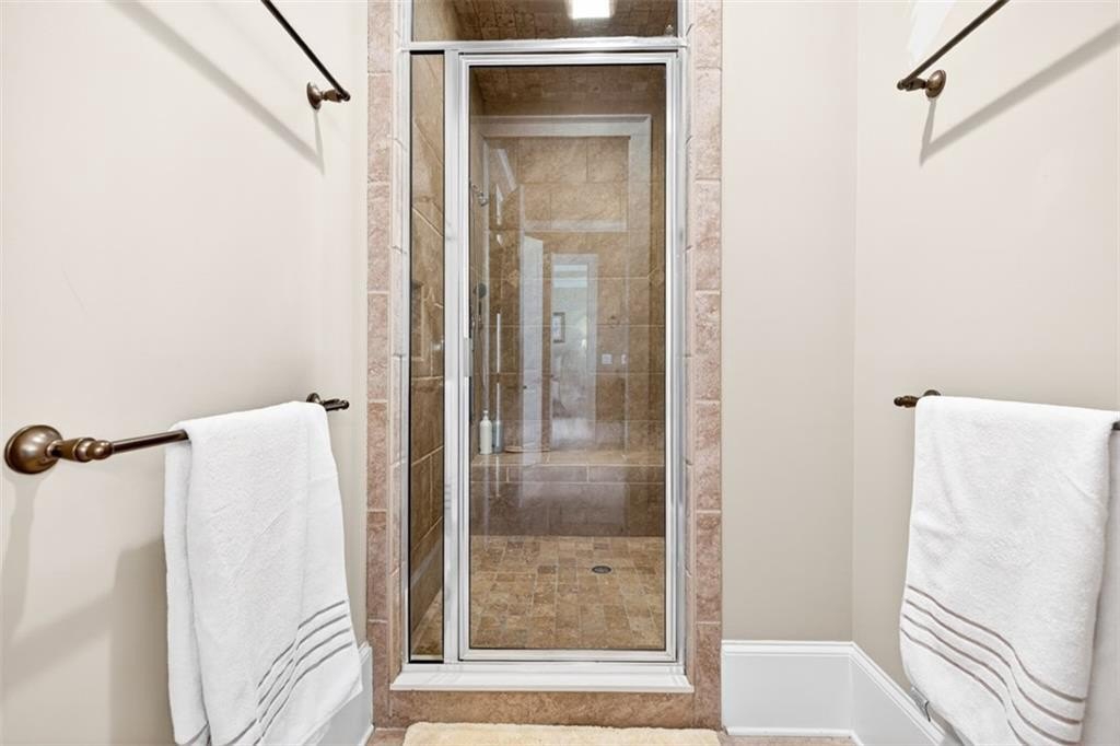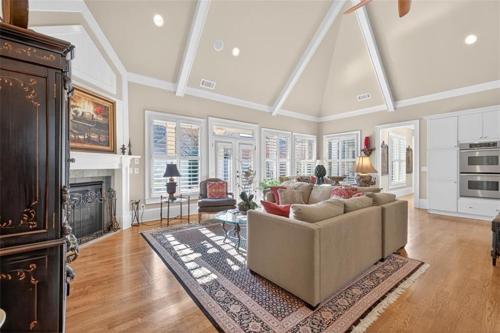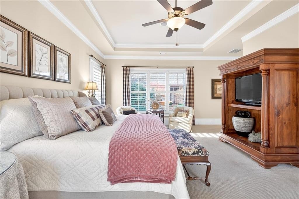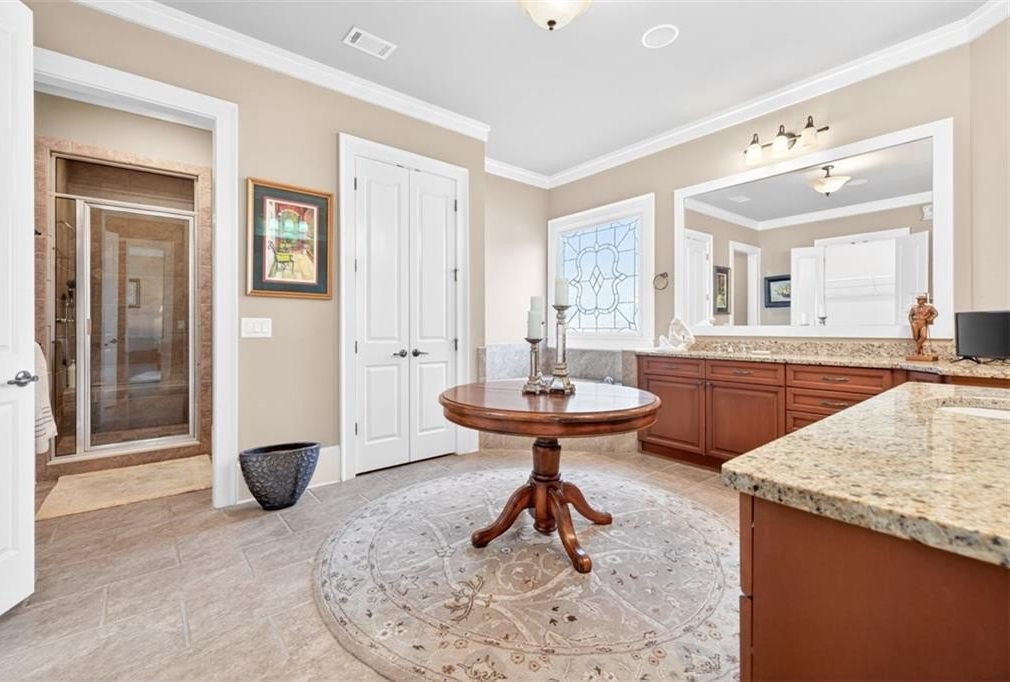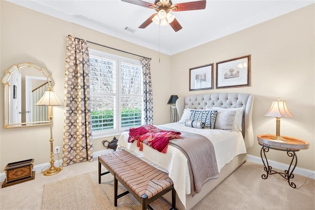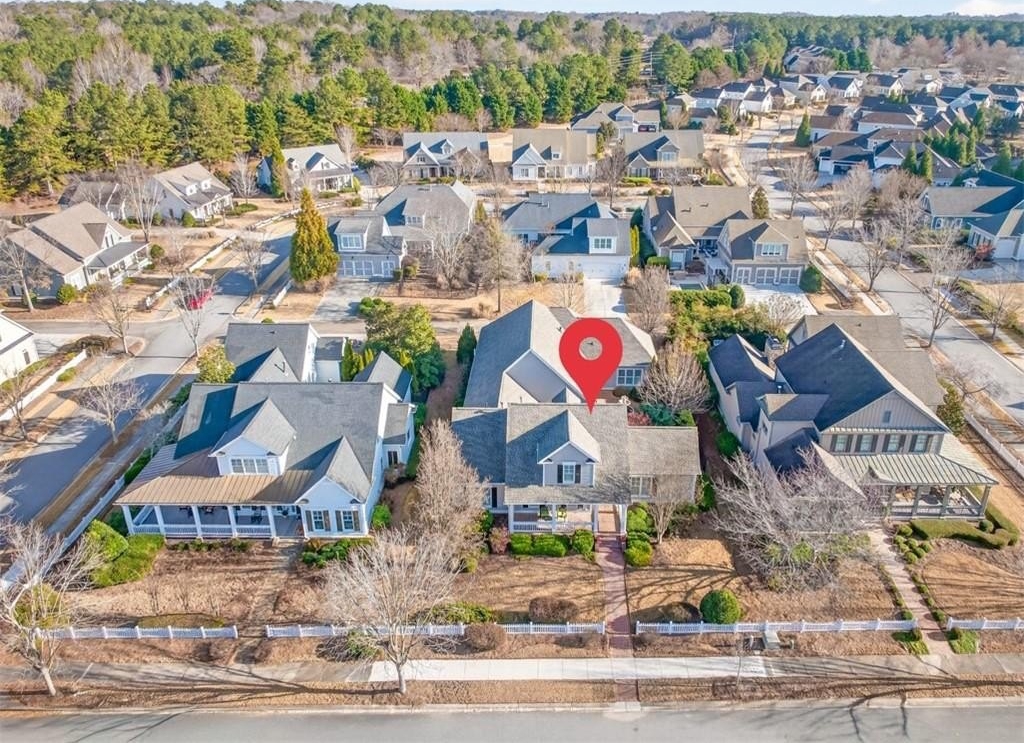 This elegantly decorated home is truly one of a kind located in the desired North Hill neighborhood of The Georgia Club. The welcoming brick rocking chair front porch overlooks a large neighborhood park and opens into a beautiful, private, fenced courtyard oasis. There are multiple entrances to the home off the courtyard with lots of natural light and beautiful views! All four bedrooms and four full baths are uniquely separate from each other, providing impressive privacy. Off the beautiful courtyard, you enter the front door to the main living area including an open concept kitchen, family room, and breakfast room that seamlessly share a spectacular cathedral ceiling and gas log fireplace. The kitchen features a large island with a farm sink and granite, a six-burner gas stovetop, double ovens, microwave and wine/beverage refrigerator, spacious walk-in pantry and tons of kitchen cabinets. There is also a cozy sitting area for conversation with the cook and a light and bright breakfast area. On the main level, you will also find a large separate elegant dining room and a large secondary family room that overlooks the community park and has a gorgeous stacked stone fireplace. A secondary bedroom with a built-in desk and a full bath are off the main entry foyer. The master suite is on the main level and is separated by a hallway which gives this area a lot of privacy. A large master is accompanied by a huge walk-in closet and a bathroom with two vanities, walk-in shower, jetted tub with a beautiful stain glass window and a large water closet. The master suite opens up and overlooks the courtyard. A lovely staircase leads upstairs to a large spacious bedroom and a full bath. A back entry foyer/mudroom opens to the spacious laundry room with sink and to the large garage with two full bays, a golf cart bay, lots of shelving, and even room for an additional refrigerator. There's plenty of outdoor living space and the home was designed to wrap around the gorgeous courtyard. The courtyard has several sitting areas and an outdoor covered veranda with ceiling fans for relaxing and/or dining. The center attraction is a fountain. This area is fenced and great for keeping track of kids or pets. Additionally, accessed off the courtyard, you will find a separate guest suite with bedroom, bath and kitchenette has its own private entrance. Home features and upgrades include new TRAN HVAC systems, new roof, and two newer water heaters. Home exterior painted in 2024. Hardwood floors in most of the main level. Plantation shutters in great room and guest bath and blinds on all other windows. Sound system with speakers in living room, dining room, master bedroom and bath and courtyard. Alarm system & sprinkler system. Washer and dryer and all kitchen appliances remain with the home. HOA weekly lawn maintenance includes mowing, pruning, weeding, and spraying and cutting. Located on the club side of The Georgia Club, an easy walk from the clubhouse, driving range, fitness center & aquatic complex. The Georgia Club is a gated community & private club with 27 holes championship golf, aquatic & fitness center, restaurant open 6 days/week, lighted tennis courts and more!