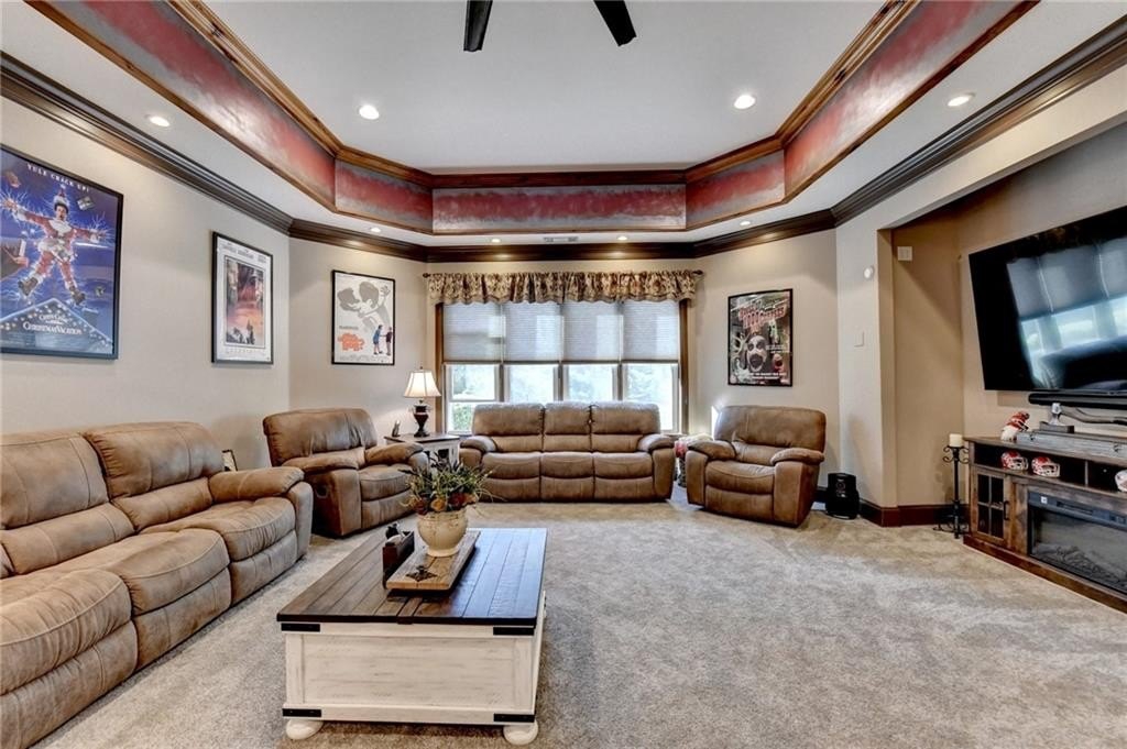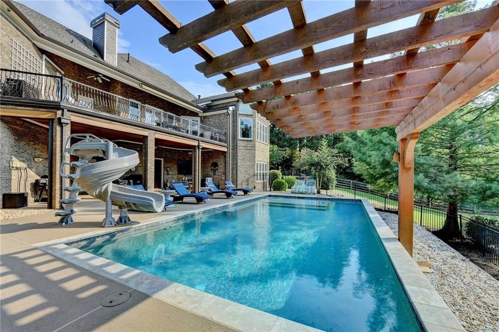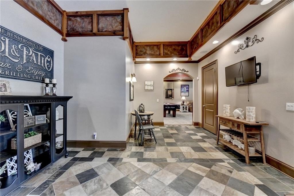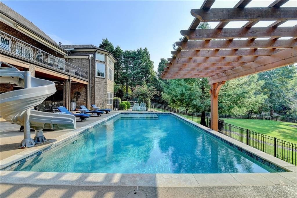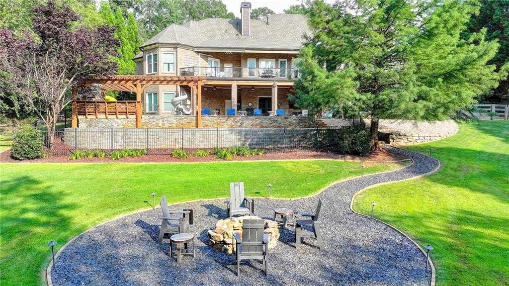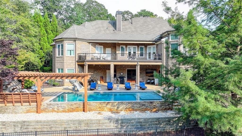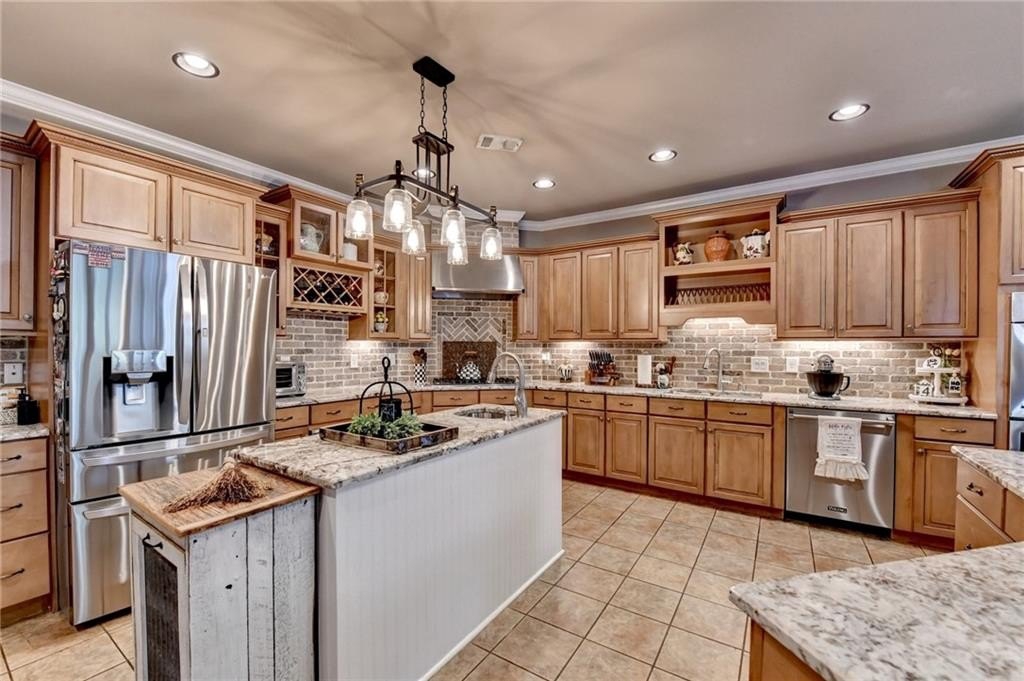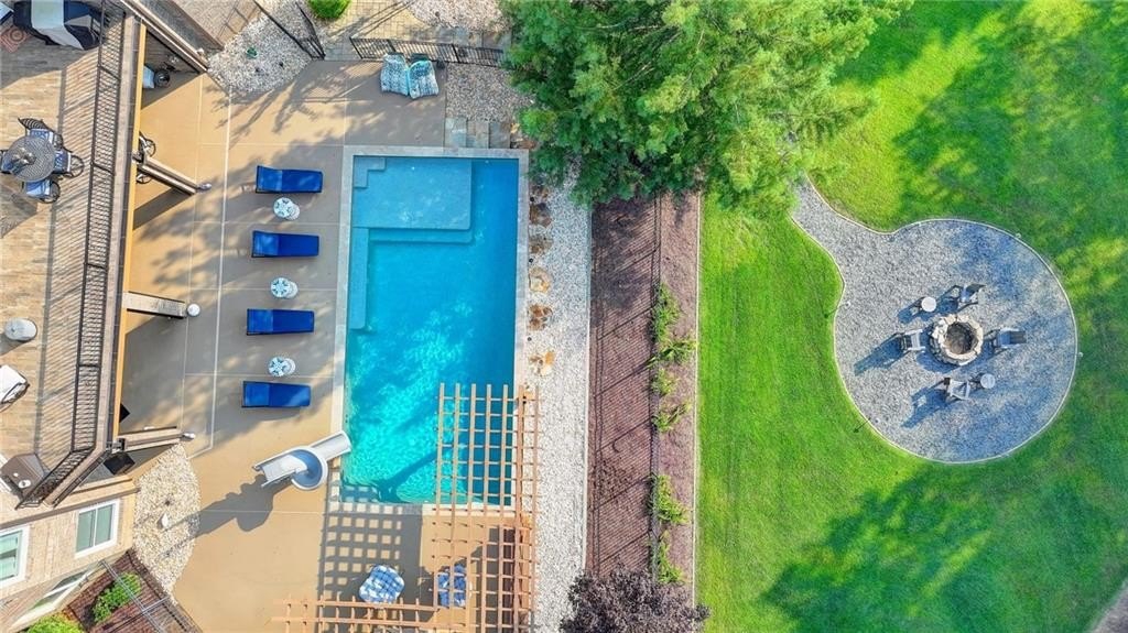 Rare four-sided brick, custom-built ranch situated on 2.38 acres on a community with no HOA and backing up to a private lake. This exceptional home offers a resort-style outdoor living experience, featuring a rectangular saltwater pool with a built-in Badujet Super-Sport II swim jet system, a tanning ledge and slide, a large stone fireplace beneath a pergola-covered sitting area, and a backyard fire pit perfect for stargazing and enjoying the peaceful lake views. (Property extends to the opposite side of the lake.) Additional exterior highlights include a four-car garage configuration, a three-car garage, a two-car pull-through, plus an additional rear garage for extra storage or workshop space. Step through the double front doors into a welcoming foyer, flanked by a spacious dining room on the left and a large executive office on the right. Toward the back of the home, you'll find one of two full kitchens this property offers. The gourmet kitchen features 2023 Viking appliances, a wall oven with convection oven/microwave, warming drawer, five-burner cooktop, faux-brick backsplash, large breakfast bar with seating for four, granite countertops, tile flooring, two sinks, a center island, and a walk-in pantry. The large family room impresses with soaring cathedral ceilings, a bay window, oversized ceiling fan, and custom built-ins. The owner's suite on the main level includes private deck access and a custom walk-in closet with its own laundry area. The spa-like primary bathroom features a jetted tub and a spacious walk-in shower. The terrace level offers ten-foot ceilings and eight-foot doors, creating an open and luxurious feel. This level includes a full second kitchen with a breakfast bar, stainless steel appliances, and a walk-in pantry. You'll also find an exercise room, media room, sauna, and two additional bedrooms with 1.5 baths. Step outside from the terrace level to a covered porch, perfect for grilling, entertaining, and enjoying views of the pool and lake. Owners paid $15K to run Comcast down the street to get business fiber to the house. This property has a stand-alone Generac Generator for peace of mind. Properties like this rarely come on the market, and when they do, they move fast.
