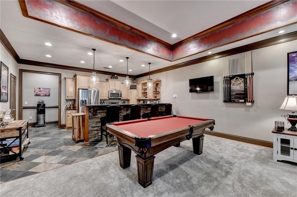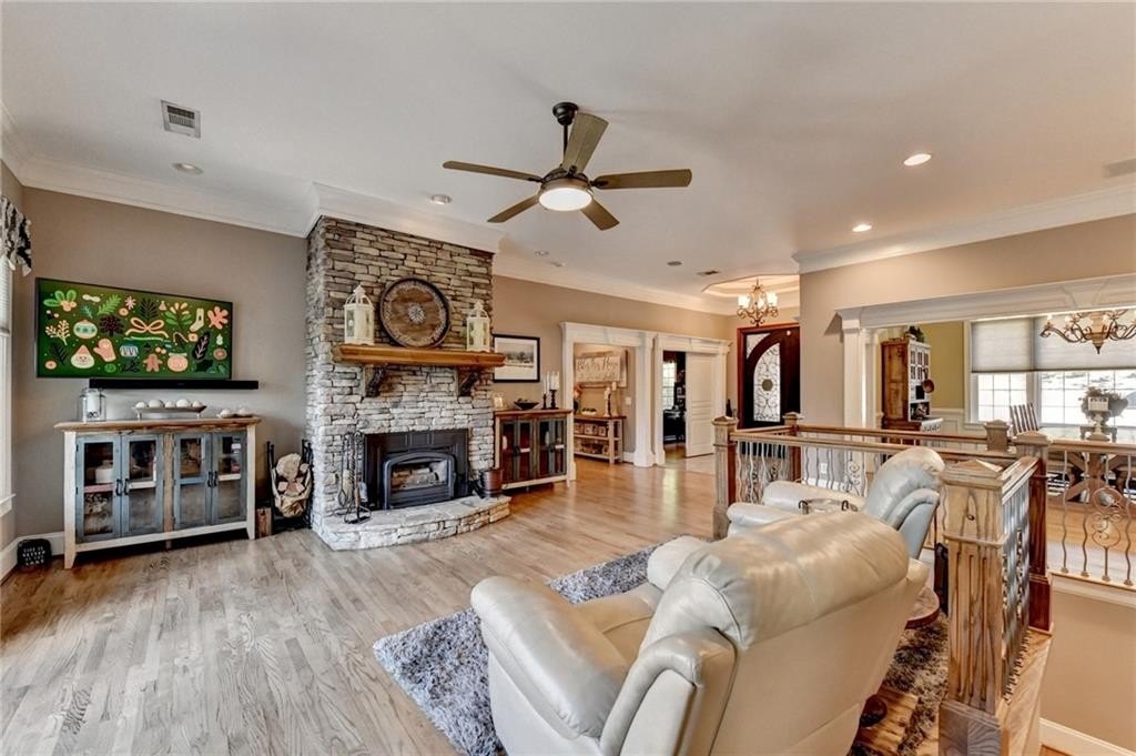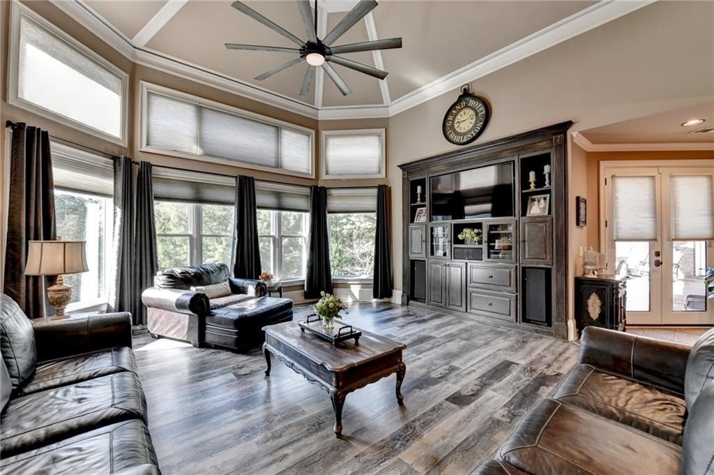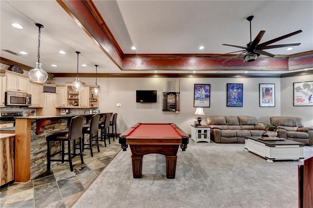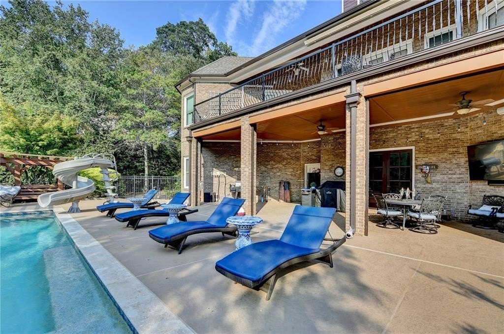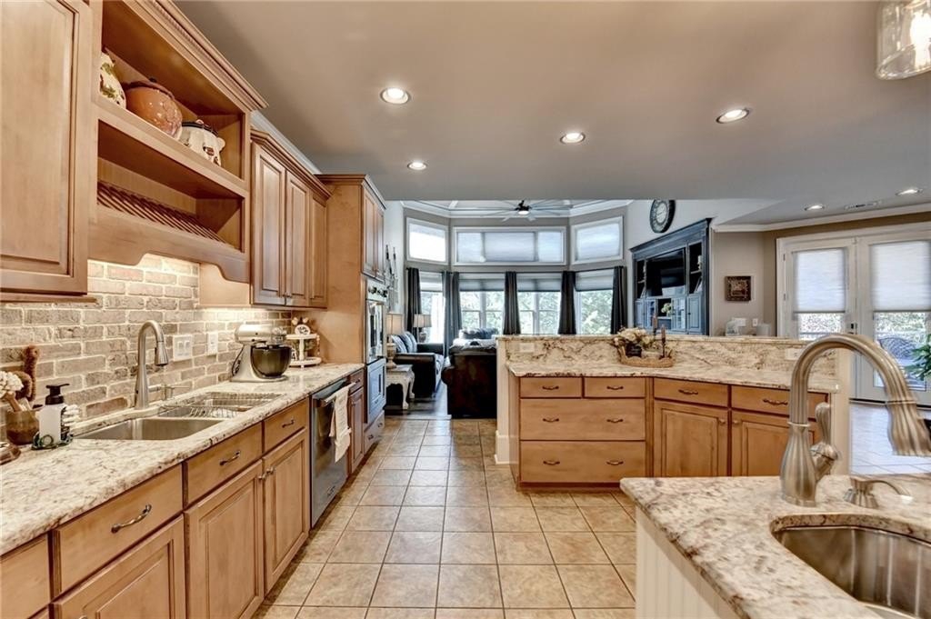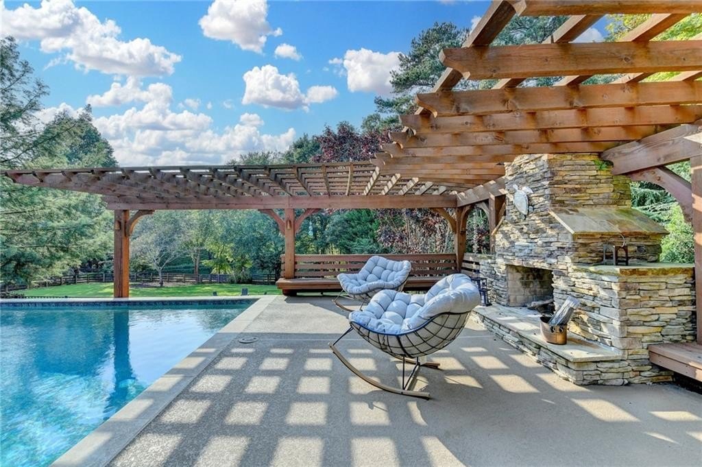 Rare four-sided brick, custom-built ranch situated on 2.38 acres on a community with no HOA and backing up to a private lake. This exceptional home offers a resort-style outdoor living experience, featuring a rectangular saltwater pool with a built-in Badujet Super-Sport II swim jet system, a tanning ledge and slide, a large stone fireplace beneath a pergola-covered sitting area, and a backyard fire pit perfect for stargazing and enjoying the peaceful lake views. (Property extends to the opposite side of the lake.) Additional exterior highlights include a four-car garage configuration, a three-car garage, a two-car pull-through, plus an additional rear garage for extra storage or workshop space. Step through the double front doors into a welcoming foyer, flanked by a spacious dining room on the left and a large executive office on the right. Toward the back of the home, you'll find one of two full kitchens this property offers. The gourmet kitchen features 2023 Viking appliances, a wall oven with convection oven/microwave, warming drawer, five-burner cooktop, faux-brick backsplash, large breakfast bar with seating for four, granite countertops, tile flooring, two sinks, a center island, and a walk-in pantry. The large family room impresses with soaring cathedral ceilings, a bay window, oversized ceiling fan, and custom built-ins. The owner's suite on the main level includes private deck access and a custom walk-in closet with its own laundry area. The spa-like primary bathroom features a jetted tub and a spacious walk-in shower. The terrace level offers ten-foot ceilings and eight-foot doors, creating an open and luxurious feel. This level includes a full second kitchen with a breakfast bar, stainless steel appliances, and a walk-in pantry. You'll also find an exercise room, media room, sauna, and two additional bedrooms with 1.5 baths. Step outside from the terrace level to a covered porch, perfect for grilling, entertaining, and enjoying views of the pool and lake. Owners paid $15K to run Comcast down the street to get business fiber to the house. This property has a stand-alone Generac Generator for peace of mind. Properties like this rarely come on the market, and when they do, they move fast.
