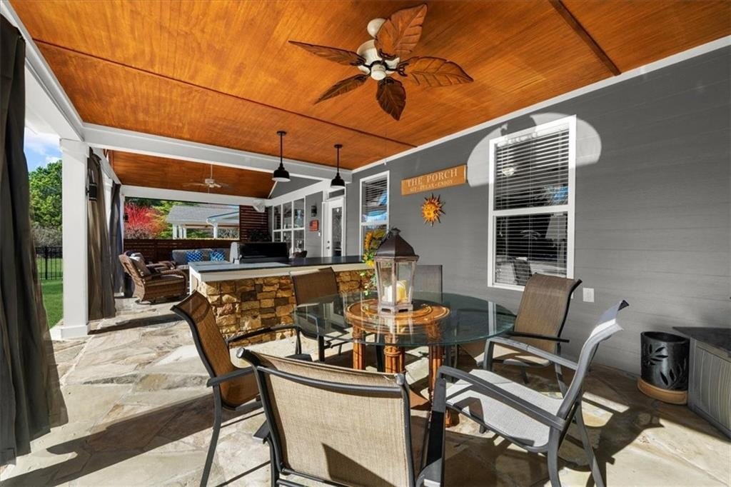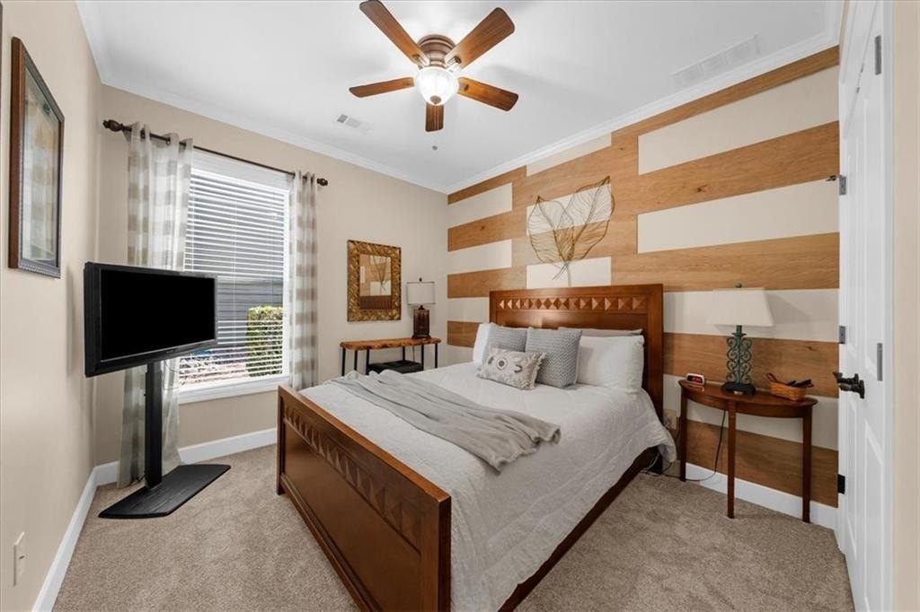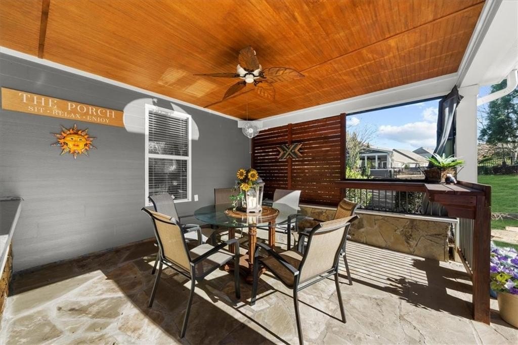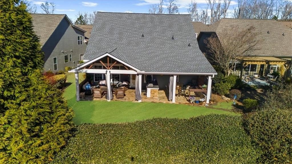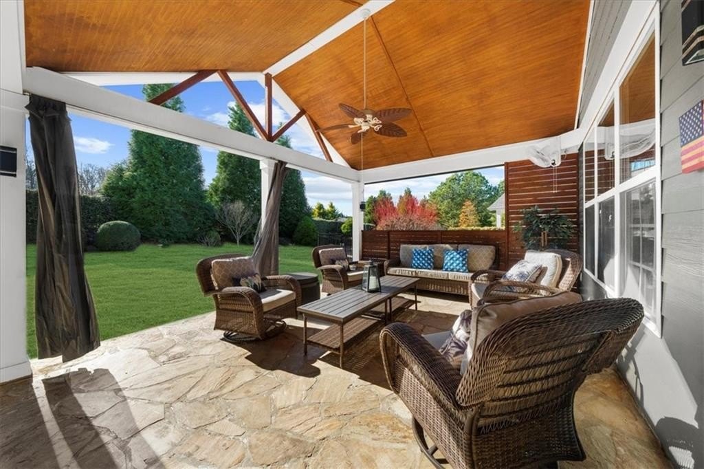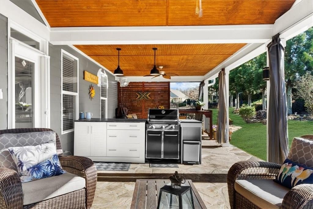 Discover Cresswind at Lake Lanier, an award-winning community located on Lake Lanier's shores, designed with active adults in mind. The CYPRESS model provides 2,390 square feet of living space, including three bedrooms, two bathrooms, an office, an all-season enclosed sunroom, and a custom backyard retreat ideal for entertaining. Recent upgrades include a NEW ROOF, WATER HEATER, and HVAC system (all installed in 2025), so essential maintenance is taken care of. The home features hardwood floors and plantation shutters throughout the main living areas, plush carpets in the bedrooms, recessed lighting, crown molding, ceiling fans, bronze hardware, a security system, an irrigation system, and a sought-after EXTENDED garage. The showpiece of this property is its expansive 15 x 37 ft COVERED FLAGSTONE PATIO, perfect for outdoor gatherings. The CEDAR-PLANK pitched roof adds architectural interest, while a generously sized granite island offers storage, a built-in Weber grill, stone accents, and pendant lights, making it an entertainer's dream. There is also a stand-up bar, a dining area, and ample seating, with two privacy walls, side roll-down screens, and four ceiling fans enhancing the space's comfort. Step inside the front door of the home through the eight-pane glass door with built-in blinds to the living area, showcasing hardwood floors, plantation shutters, a CUSTOM STONE ACCENT WALL, and a unique FAUX WINDOW opening to the sunroom. Enjoy a spacious dining area and a breakfast bar for casual meals. The eat-in kitchen is equipped with a CUSTOM six-drawer buffet and overhead glass-front cabinets, an island with ample storage, a sizable pantry, richly stained cabinetry, granite countertops, a stylish tiled backsplash, a stainless-steel double sink, a five-burner gas range, a microwave, and a new refrigerator purchased in 2025. The enclosed sunroom-with its striking cedar-plank ceiling, tile flooring, rattan blinds, and tropical ceiling fan-is an inviting spot for morning coffee or relaxing with a book. The primary suite features two walk-in closets, a CUSTOM accent wall, and a remodeled bath with a spacious shower, beautiful contemporary tile, twin vanities with framed mirrors, and updated fixtures. The secondary bedroom also includes a CUSTOM accent wall. A versatile office or den can serve as a hobby room, while the laundry room provides convenient cabinetry. The second bathroom offers a tile-surround bath/shower combo. Upstairs, a third bedroom can be used as another hobby space or as a private retreat for visiting family. Climate control is easy with a remote-controlled split HVAC and ceiling fan. For extra storage, there's an expanded, two-tiered walk-in storage area, crawl space, and a closet-access storage door. Cresswind at Lake Lanier is located on the shores of picturesque Lake Lanier and offers a comprehensive array of amenities, including a 43,000-square-foot, three-story clubhouse featuring indoor and outdoor pools, kayaking, fishing, boat docks, over 120 clubs, arts and crafts, pickleball, tennis, fitness facilities, dance classes, poker, games, billiards, live performances, concerts, dances, and more. The community benefits from a dedicated activities director, property manager, and maintenance staff. Residents are known for their welcoming nature and strong sense of community integration. Tours of the property and facilities can be arranged upon request. I have lived here for 12+ years, and I know you would love it here!