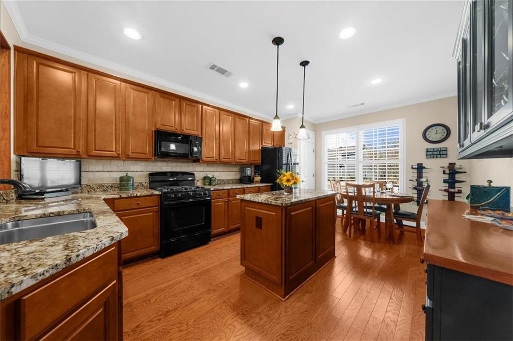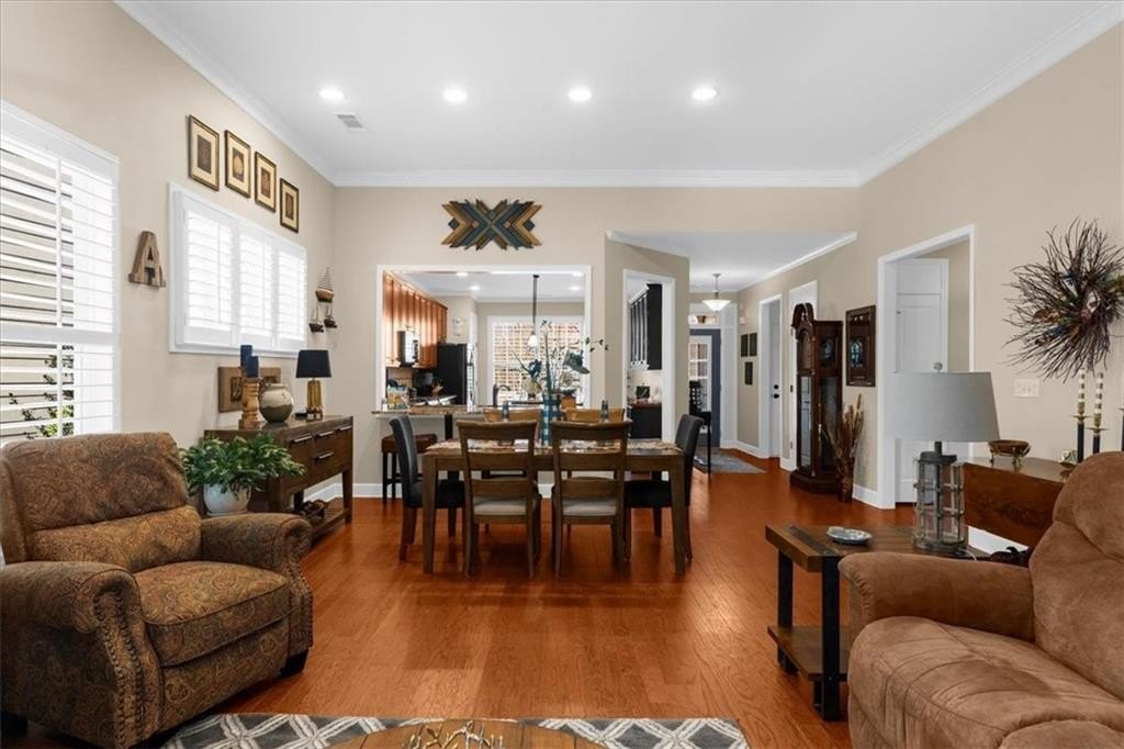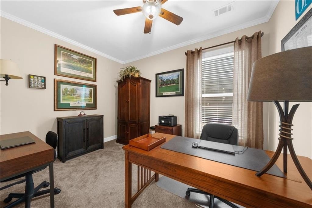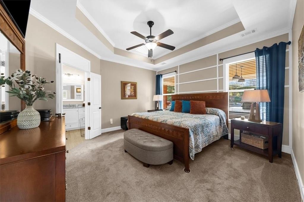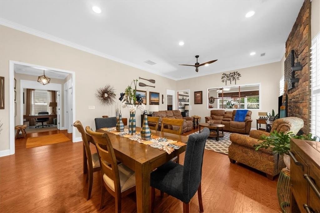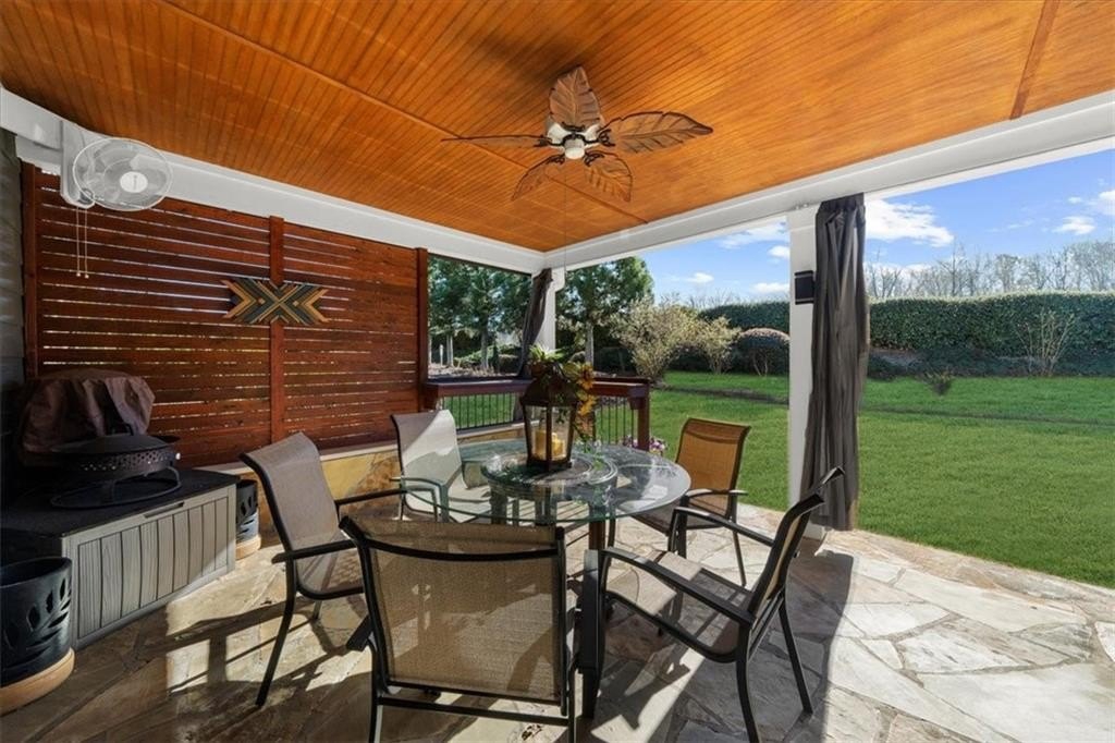 Discover Cresswind at Lake Lanier, an award-winning community located on Lake Lanier's shores, designed with active adults in mind. The CYPRESS model provides 2,390 square feet of living space, including three bedrooms, two bathrooms, an office, an all-season enclosed sunroom, and a custom backyard retreat ideal for entertaining. Recent upgrades include a NEW ROOF, WATER HEATER, and HVAC system (all installed in 2025), so essential maintenance is taken care of. The home features hardwood floors and plantation shutters throughout the main living areas, plush carpets in the bedrooms, recessed lighting, crown molding, ceiling fans, bronze hardware, a security system, an irrigation system, and a sought-after EXTENDED garage. The showpiece of this property is its expansive 15 x 37 ft COVERED FLAGSTONE PATIO, perfect for outdoor gatherings. The CEDAR-PLANK pitched roof adds architectural interest, while a generously sized granite island offers storage, a built-in Weber grill, stone accents, and pendant lights, making it an entertainer's dream. There is also a stand-up bar, a dining area, and ample seating, with two privacy walls, side roll-down screens, and four ceiling fans enhancing the space's comfort. Step inside the front door of the home through the eight-pane glass door with built-in blinds to the living area, showcasing hardwood floors, plantation shutters, a CUSTOM STONE ACCENT WALL, and a unique FAUX WINDOW opening to the sunroom. Enjoy a spacious dining area and a breakfast bar for casual meals. The eat-in kitchen is equipped with a CUSTOM six-drawer buffet and overhead glass-front cabinets, an island with ample storage, a sizable pantry, richly stained cabinetry, granite countertops, a stylish tiled backsplash, a stainless-steel double sink, a five-burner gas range, a microwave, and a new refrigerator purchased in 2025. The enclosed sunroom-with its striking cedar-plank ceiling, tile flooring, rattan blinds, and tropical ceiling fan-is an inviting spot for morning coffee or relaxing with a book. The primary suite features two walk-in closets, a CUSTOM accent wall, and a remodeled bath with a spacious shower, beautiful contemporary tile, twin vanities with framed mirrors, and updated fixtures. The secondary bedroom also includes a CUSTOM accent wall. A versatile office or den can serve as a hobby room, while the laundry room provides convenient cabinetry. The second bathroom offers a tile-surround bath/shower combo. Upstairs, a third bedroom can be used as another hobby space or as a private retreat for visiting family. Climate control is easy with a remote-controlled split HVAC and ceiling fan. For extra storage, there's an expanded, two-tiered walk-in storage area, crawl space, and a closet-access storage door. Cresswind at Lake Lanier is located on the shores of picturesque Lake Lanier and offers a comprehensive array of amenities, including a 43,000-square-foot, three-story clubhouse featuring indoor and outdoor pools, kayaking, fishing, boat docks, over 120 clubs, arts and crafts, pickleball, tennis, fitness facilities, dance classes, poker, games, billiards, live performances, concerts, dances, and more. The community benefits from a dedicated activities director, property manager, and maintenance staff. Residents are known for their welcoming nature and strong sense of community integration. Tours of the property and facilities can be arranged upon request. I have lived here for 12+ years, and I know you would love it here!