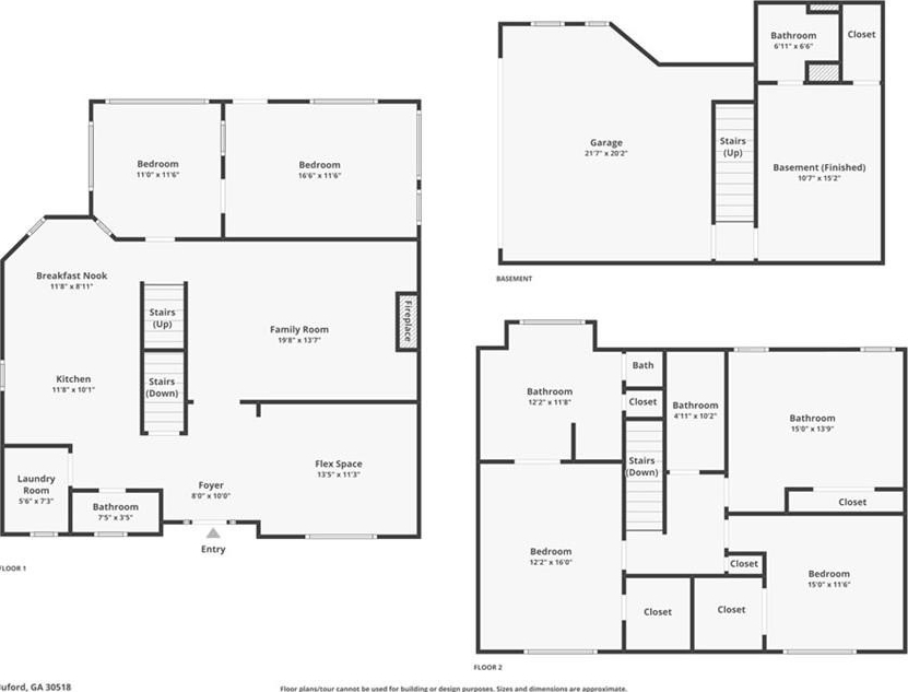 Located in the highly sought-after Buford City School District, this spacious three-story home offers flexibility, convenience, and an unbeatable location within walking distance to Downtown Buford. On the main level, you'll find a traditional layout with a generous living room featuring built-in cabinetry, a separate formal dining room, a convenient half bath, and a dedicated laundry room. The main level also includes two enclosed and covered rear rooms, perfect for a home office, 4-season sunroom, hobby space, or workshop-giving you plenty of options to customize the home to your lifestyle. Upstairs, the top floor features three bedrooms and two full bathrooms, including a comfortable primary suite and well-sized secondary bedrooms. The terrace level/basement provides incredible versatility with a full bedroom and bathroom that can function as a private in-law suite or a rentable space. While this bedroom does not have a window, it offers privacy and easy accessibility. The basement level also includes an oversized two-car garage, making it ideal for separate entry if used as a rental, or simply great convenience for parking and storage. Outside, the property offers a large fenced backyard with plenty of usable space, plus an extra-long driveway with room for multiple vehicles, guests, and even a boat. There is also a producing fig tree and homegrown blueberry bushes for those who love gardening or fresh fruit right at home. With no HOA, you have the freedom to use the property your way. Homes with this much flexibility, space, and walkability to Downtown Buford are rare-don't miss this opportunity!