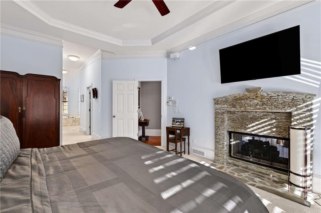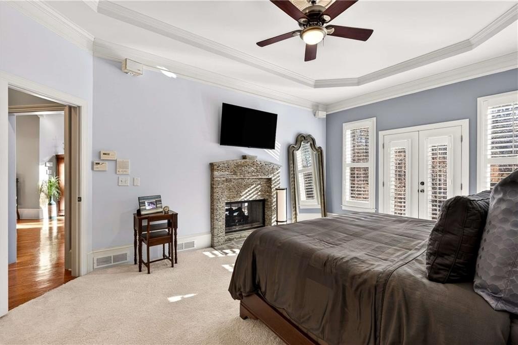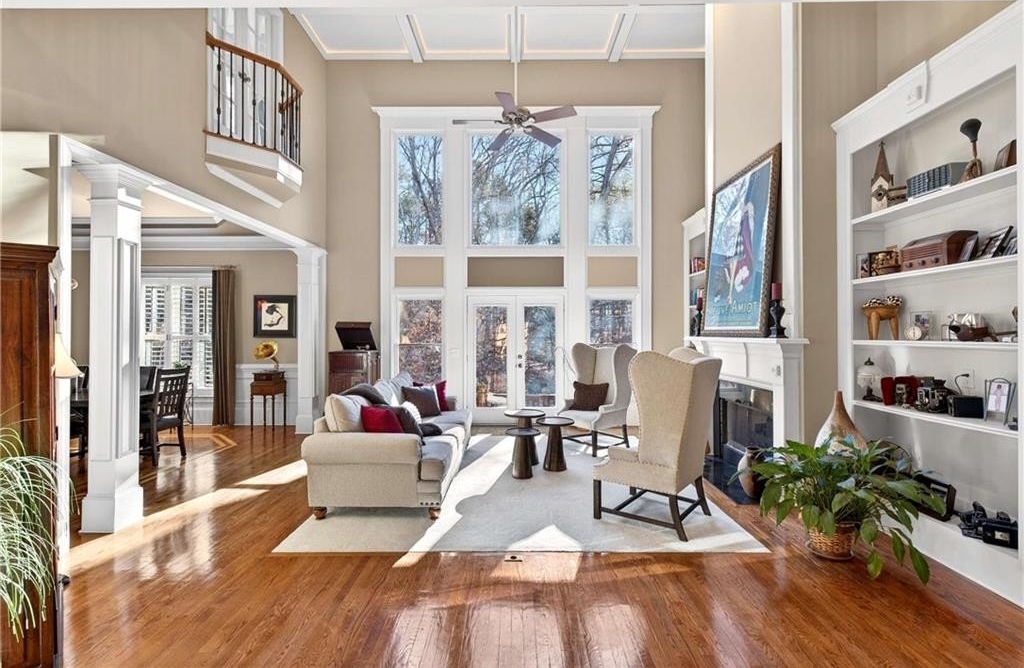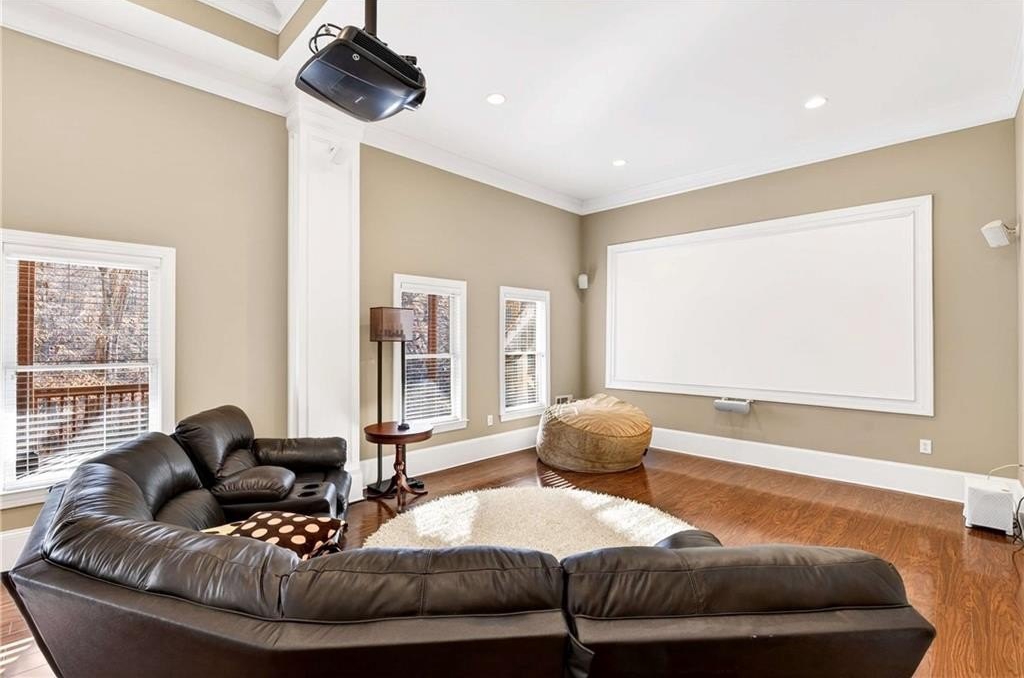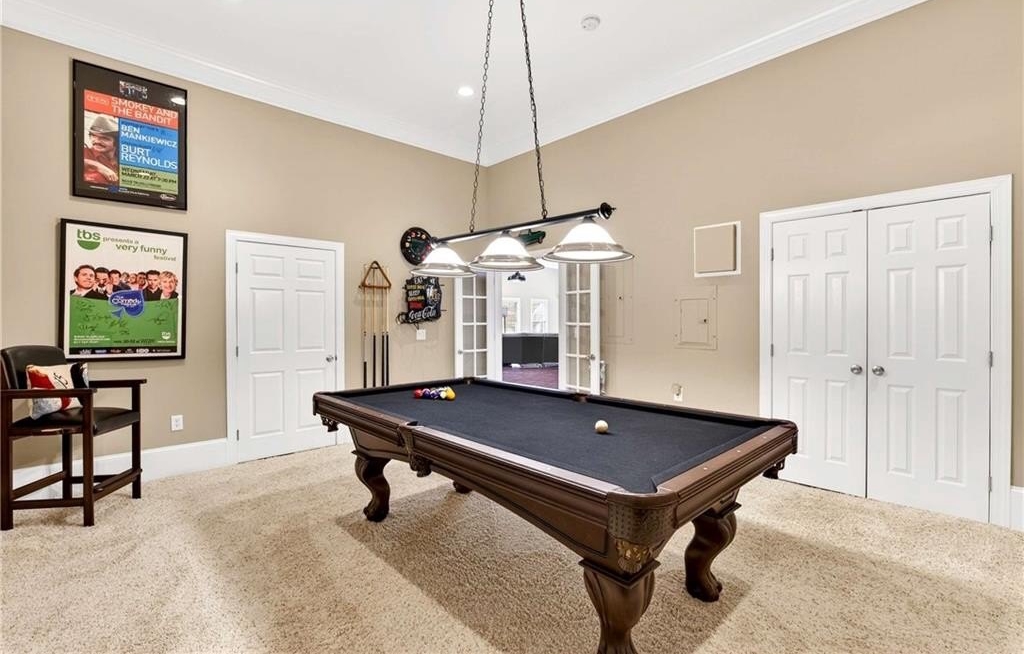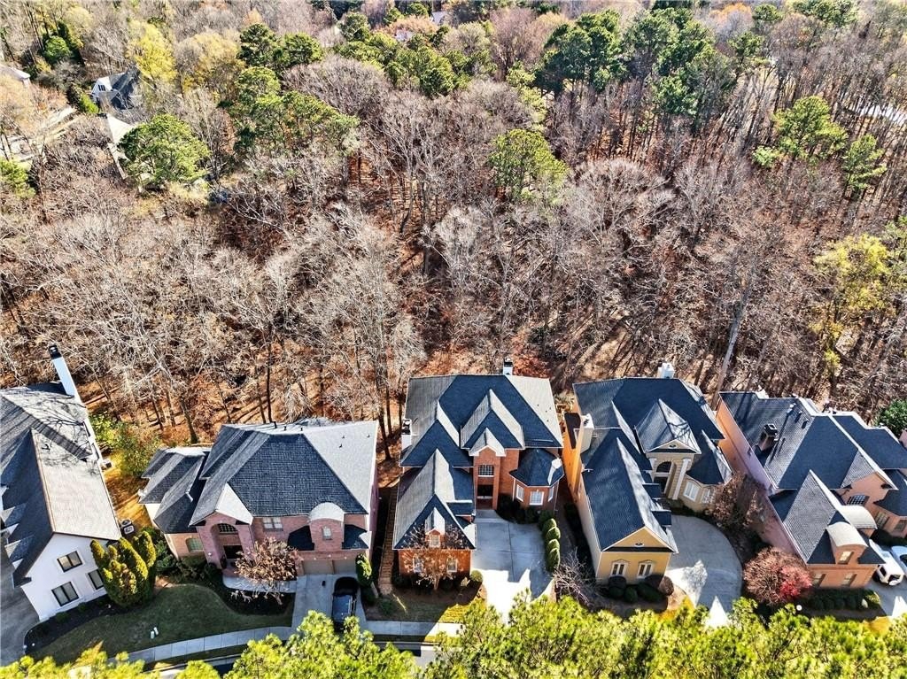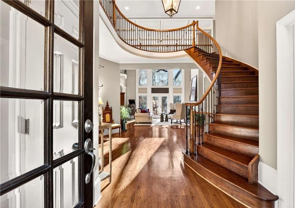 Welcome to 2075 River Falls Drive, a beautifully maintained executive home nestled in the highly sought-after gated River Falls community in Roswell. This elegant residence blends classic Southern charm with modern updates, offering the perfect combination of comfort, style, and livability. Double beveled front doors open to a dramatic 2 story circular foyer featuring an elegant spiral staircase. Beautiful 2-story great room features a wall of windows, cove lighted coffered ceiling & bookcases flanking the double-sided gas log fireplace. The gracious oversized dining room features architectural columns, exquisite moldings, hardwood floors with a custom inlay & wainscoted walls. A gourmet chef's kitchen with designer cherry cabinetry, granite countertops, Jenn-Air stainless steel appliances, island with vegetable sink, stacked stone breakfast bar & separate pantry. The spacious 2-story keeping room opens from the kitchen & highlights the charming stacked stone fireplace. Luxurious primary suite on main with tray ceiling boasts dual closets & an elegant spa bath with double vanities, double shower heads + handheld & heated marble floors. Two private bedroom suites upstairs - one is a 2nd primary suite with oversized marble bath & double closets - with high ceilings & cove lighting. A wonderful bonus room/4th bedroom upstairs has ample lighting & storage. The fully finished terrace level is an entertainer's dream, featuring 14' ceilings, a billiards room, an impressive home theatre with 144" screen & projector, a cozy office area with fireplace, a spacious guest suite/5th bedroom, and a full bath showcasing an exquisite stone sink & travertine finishes. The space also includes a plumbed & wired area ready for a future kitchen or bar, offering incredible potential for customization. Gorgeous decks overlook magnificent views of protected woodlands & creek. Additional features include designer lighting, intercom & stereo system, 7 zone programmable thermostats, security & irrigation systems & yard maintenance. Located in a prime Roswell location just minutes from Historic Downtown Roswell, the Chattahoochee River, East Roswell park, schools, shopping & dining. This home combines the best of convenience and tranquility.