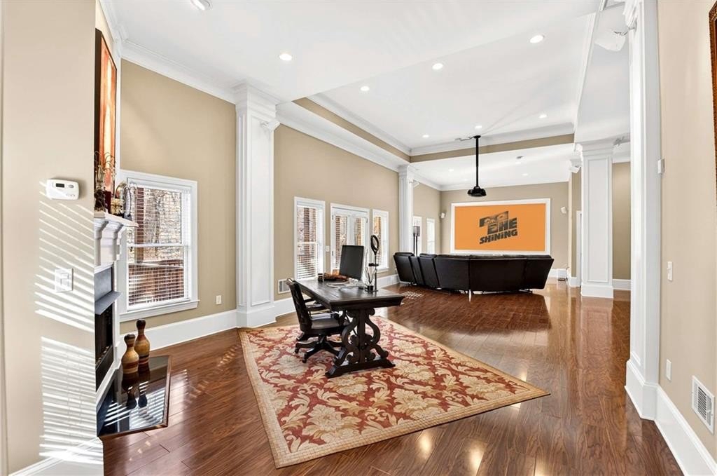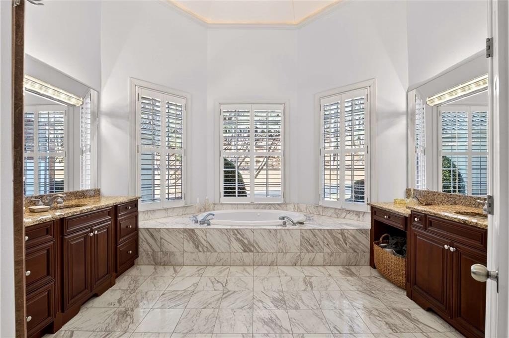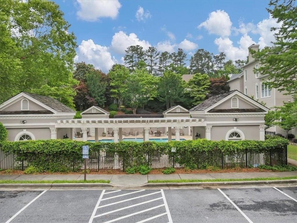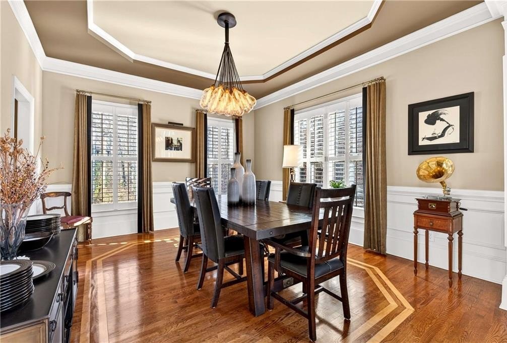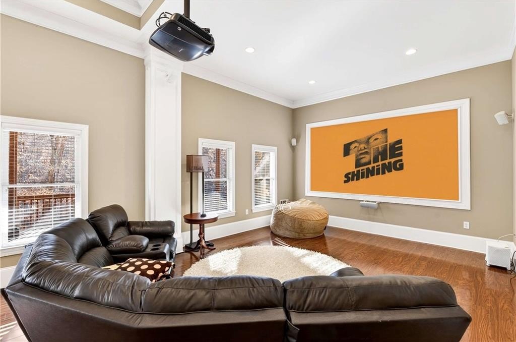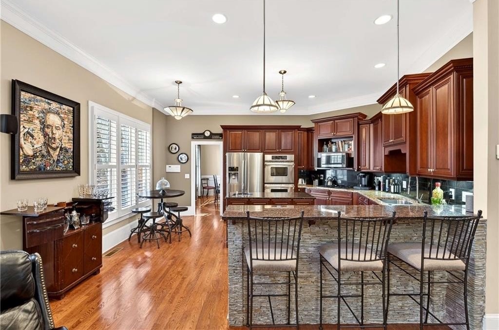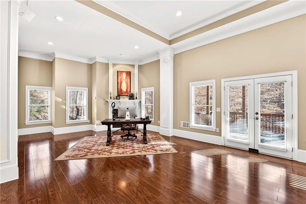 Welcome to 2075 River Falls Drive, a beautifully maintained executive home nestled in the highly sought-after gated River Falls community in Roswell. This elegant residence blends classic Southern charm with modern updates, offering the perfect combination of comfort, style, and livability. Double beveled front doors open to a dramatic 2 story circular foyer featuring an elegant spiral staircase. Beautiful 2-story great room features a wall of windows, cove lighted coffered ceiling & bookcases flanking the double-sided gas log fireplace. The gracious oversized dining room features architectural columns, exquisite moldings, hardwood floors with a custom inlay & wainscoted walls. A gourmet chef's kitchen with designer cherry cabinetry, granite countertops, Jenn-Air stainless steel appliances, island with vegetable sink, stacked stone breakfast bar & separate pantry. The spacious 2-story keeping room opens from the kitchen & highlights the charming stacked stone fireplace. Luxurious primary suite on main with tray ceiling boasts dual closets & an elegant spa bath with double vanities, double shower heads + handheld & heated marble floors. Two private bedroom suites upstairs - one is a 2nd primary suite with oversized marble bath & double closets - with high ceilings & cove lighting. A wonderful bonus room/4th bedroom upstairs has ample lighting & storage. The fully finished terrace level is an entertainer's dream, featuring 14' ceilings, a billiards room, an impressive home theatre with 144" screen & projector, a cozy office area with fireplace, a spacious guest suite/5th bedroom, and a full bath showcasing an exquisite stone sink & travertine finishes. The space also includes a plumbed & wired area ready for a future kitchen or bar, offering incredible potential for customization. Gorgeous decks overlook magnificent views of protected woodlands & creek. Additional features include designer lighting, intercom & stereo system, 7 zone programmable thermostats, security & irrigation systems & yard maintenance. Located in a prime Roswell location just minutes from Historic Downtown Roswell, the Chattahoochee River, East Roswell park, schools, shopping & dining. This home combines the best of convenience and tranquility.