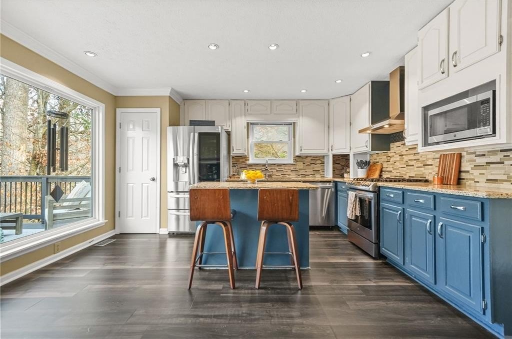 Just Listed in Mableton, this beautifully updated 5 bedroom, 3 full bathroom home offers over 3,000 square feet of living space and a truly unique open-style split-level layout designed to maximize light, views, and connection to nature. Soaring vaulted ceilings and expansive picture windows frame peaceful views of the park-like, almost half-acre lot, creating a tranquil, treehouse-inspired living experience rarely found in today's market. The home backs up to Nickajack Creek and protected greenspace along the Heritage Trail, ensuring lasting privacy with no homes behind and a setting that feels both secluded and serene. Meticulously maintained and thoughtfully upgraded throughout, improvements include a new roof, new gutters with leaf guards, new garage doors and motors, a new front porch, fully painted and repaired exterior, updated electrical panel, and a new HVAC system installed in 2021 with regular professional servicing. Inside, the primary suite features a fully remodeled bathroom with heated floors and a spacious walk-in closet, while a remodeled secondary bathroom, high-end LVP flooring, updated fixtures, and an open, flowing layout make the home ideal for both everyday living and entertaining. Outdoor spaces are equally impressive with a newly installed patio, refreshed back deck with new railings, updated landscaping, mature trees professionally trimmed, a fenced yard, and a quiet creekside backdrop that feels like a private retreat. Located just steps from Heritage Park and the Heritage Trail with direct access to the Silver Comet Trail, this home offers a rare combination of natural beauty, extensive updates, and a distinctive layout that simply cannot be replicated. This is a special opportunity to own a well-cared-for home where privacy, character, and thoughtful improvements come together seamlessly.
