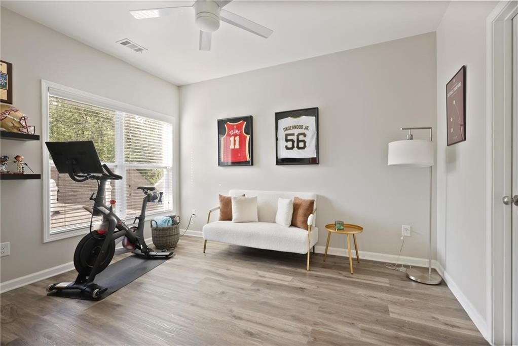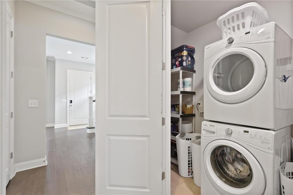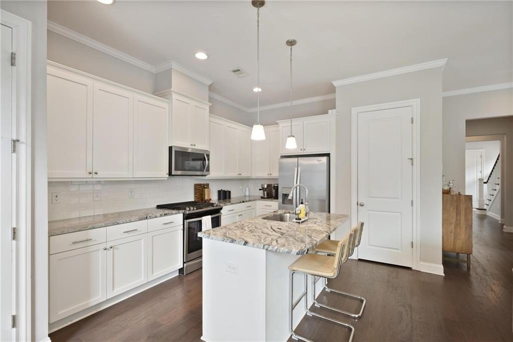 Beautiful, very large end-unit townhome in West Highlands with the primary bedroom on the main floor. Entry level living with a gourmet kitchen featuring granite countertops, stainless steel appliances, and 10 ft high ceilings on main level. The open floor plan from the kitchen to the family room is ideal for entertaining family and friends. From the family room you can head outside to a fenced and big, private courtyard. Upstairs are three bedrooms and a large loft area, ideal for a home office, media room or lounge. Step outside and enjoy a cup of coffee sitting on a huge wrap around balcony. This home features hardwood floors in all rooms and crown molding throughout. West Highlands neighborhood offers a resort style neighborhood pool, playground, dog park, gazebo, green space, plus many more amenities. West Highlands is convenient to many great restaurants and entertainment, GA Tech and GA State, Mercedes Benz Stadium, West Midtown, the Beltline, and Proctor Creek Trail.