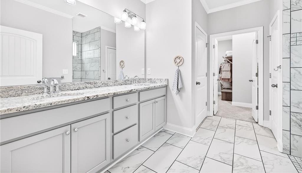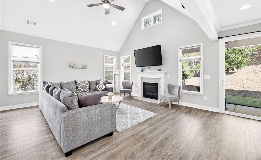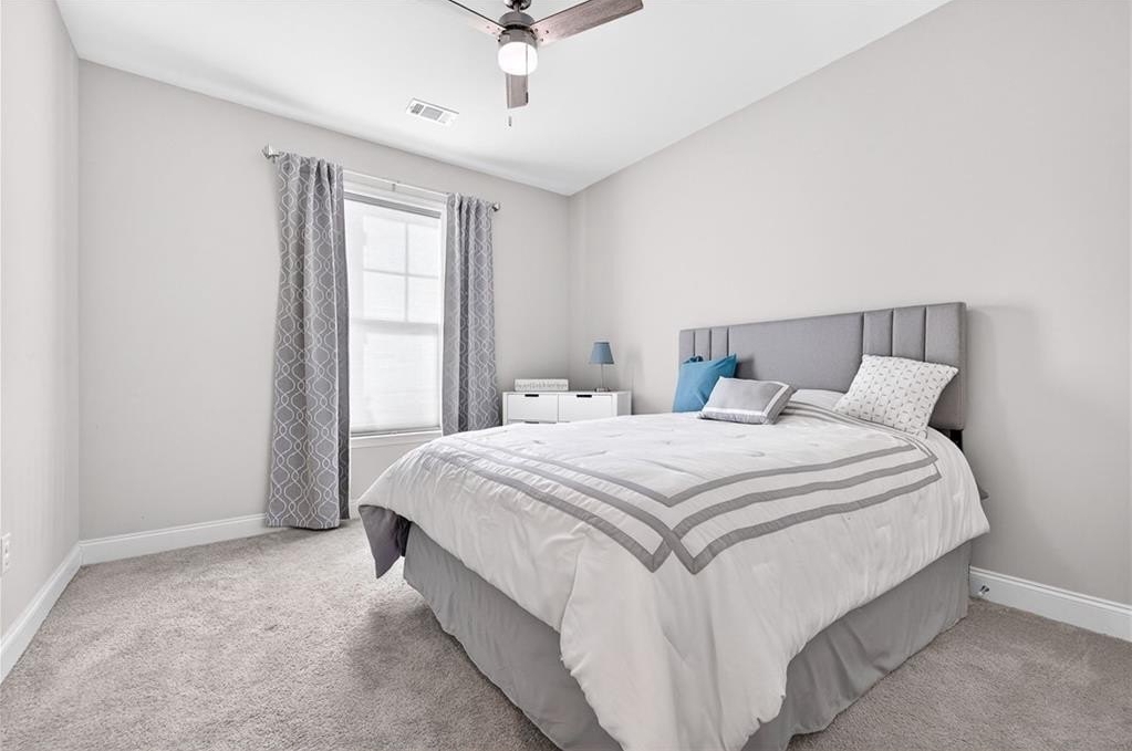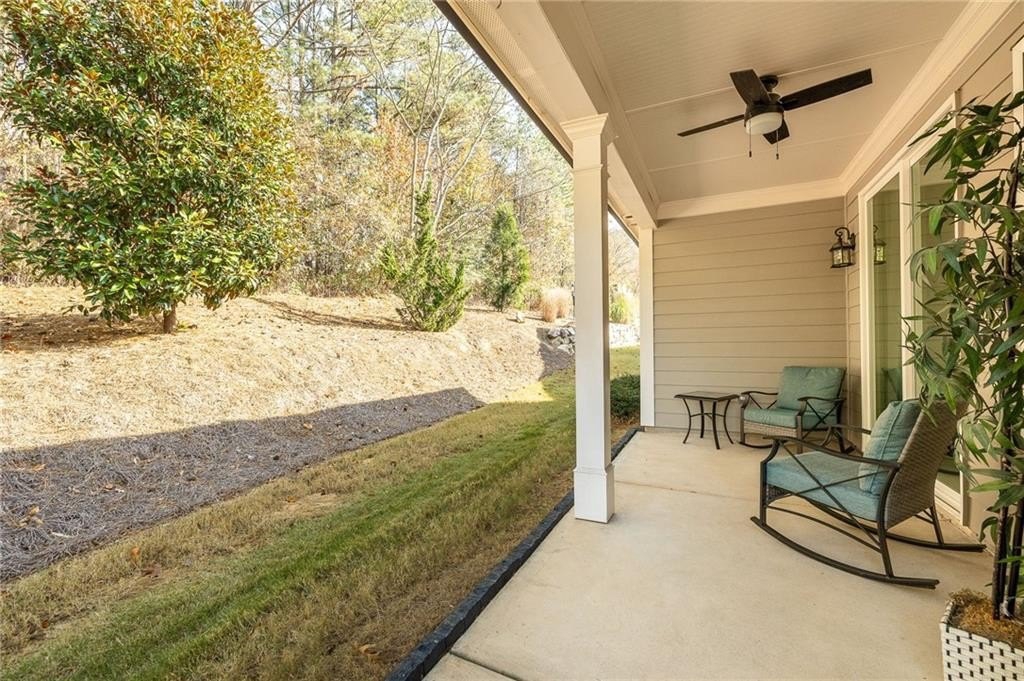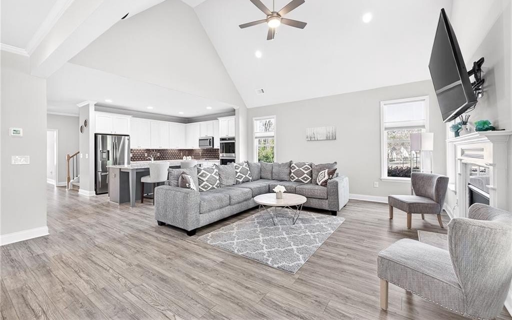 Welcome home to this stunning residence located in a desirable 55+ Active Adult Gated Community offering a dog park, clubhouse, and community garden. Perfectly maintained, spotless, and beautifully designed, this home shows like New Construction. A light-filled two-story foyer welcomes you into an open-concept layout featuring a vaulted great room with a cozy fireplace, seamlessly flowing into the dining area and gourmet kitchen. Elegant gray wood-style flooring and a soothing gray-and-white color palette create a designer-inspired aesthetic throughout. The well-appointed kitchen boasts stainless steel appliances, double ovens, a gas cooktop, granite countertops, a large walk-in pantry, and a center island with breakfast bar - ideal for both everyday living and entertaining. Step outside to a covered patio and enjoy this unique UPGRADED lot, located in the back of the community, providing a private wooded serene view, perfect for relaxing. The spacious main-level owner's suite features tray ceilings, a double-sink vanity, separate water closet, oversized walk-in shower, and an impressive double-sided "his and hers" walk-in closet. Also on the main level are a second bedroom, full bath, and a convenient laundry room with sink. The garage entry includes a charming mudroom area with built-in seating and storage. Upstairs, you'll find two generously sized guest bedrooms, a full bath, and additional walk-in attic storage. This exceptional home offers the perfect blend of comfort, style, and low-maintenance living in a vibrant community.