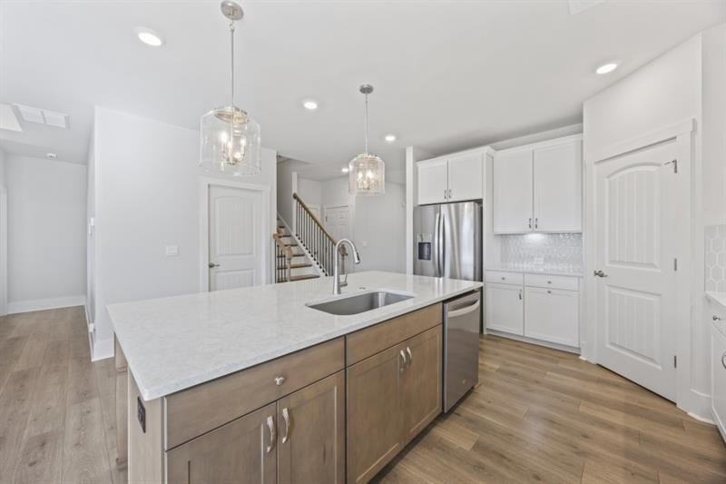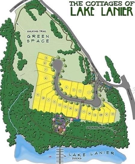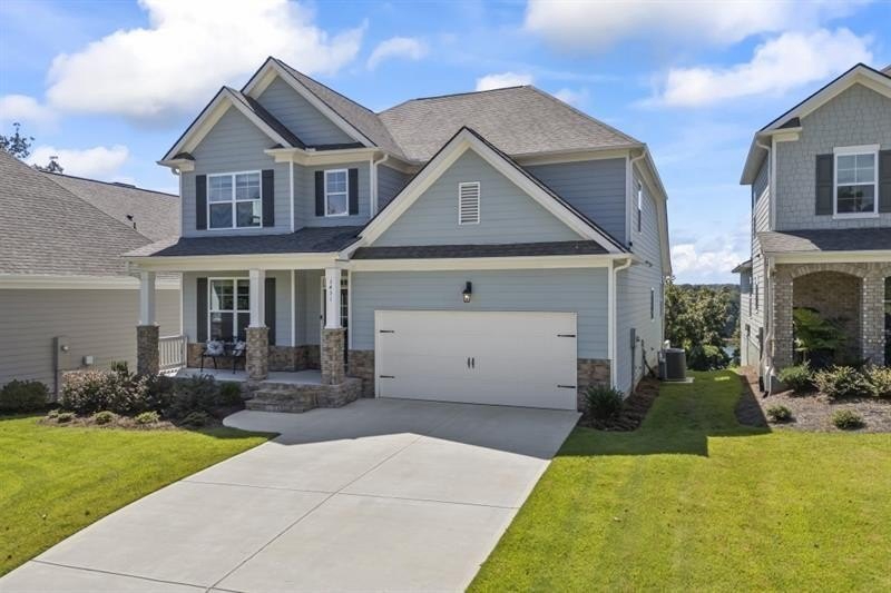 Deeded Boat Slip Included in Price! Welcome to The Cottages of Lake Lanier, a Charming Gated community offering a true Lakeside Lifestyle. Residents enjoy Resort-style Amenities including a Two-Story Clubhouse, Firepit, Scenic walking trails, and a 6+ Acre Park -- perfect for relaxing and entertaining. This stunning Windsor floor plan features a thoughtfully designed open layout beginning with a dramatic Two-Story Foyer. The Formal Dining room showcases elegant, Coffered Ceilings and French Doors and can easily function as a Home Office or Flex space. The Chef's Kitchen is beautifully appointed with a large Island, Quartz Countertops, stylish backsplash, gas cooktop, 42" white cabinetry, wall-mounted microwave and oven, designer range hood, and pantry. The kitchen flows seamlessly into the family room, highlighted by a stone wood-burning fireplace with a cedar mantle. The primary suite is conveniently located on the main level and features a wall of windows overlooking the lake. The spa-inspired bathroom offers a soaking tub, oversized shower, double vanity, and walk-in closet. A laundry room on the main level adds everyday convenience. Upstairs, you'll find an open loft, a bedroom with a private bath and walk-in closet, plus two additional spacious bedrooms sharing a hall bath. Modern upgrades include smart home technology for enhanced security and efficiency, along with luxury plank vinyl flooring throughout the main level. The unfinished basement provides endless opportunities for customization. Enjoy exceptional indoor/outdoor living with a screened porch and a newly installed open deck offering sweeping lake views, complete with steps leading to the backyard. A newly extended brick and stone patio, along with a new fence, creates the perfect setting for gatherings and outdoor enjoyment. With breathtaking lake and marina views and a deeded boat slip, this home is more than just a place to live -- it's a tranquil lakeside lifestyle.