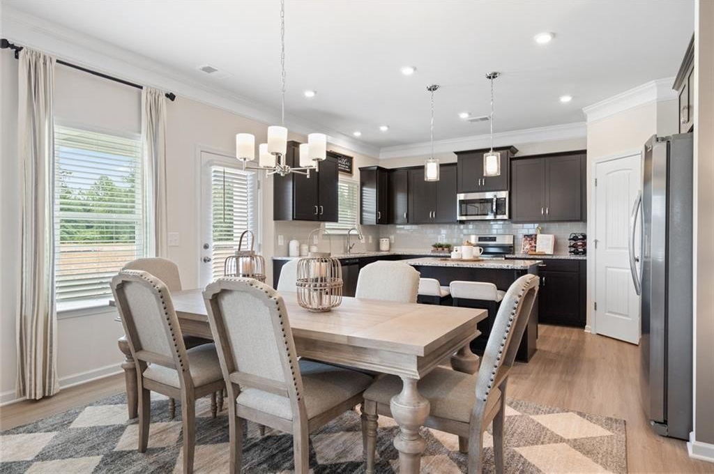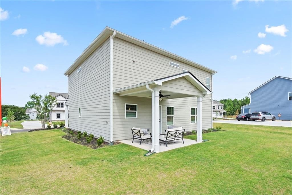 Move-In Ready! Welcome to The McGinnis plan, a beautifully appointed former model home by Smith Douglas Homes, located in the highly desirable Morgan Landing community in Carrollton, Georgia. This move-in ready new construction home offers exceptional craftsmanship, thoughtful design, and a prime location in a top-ranking school district. Ideally situated less than 3.5 miles from Downtown Carrollton and only 6.5 miles from the University of West Georgia, this home provides convenient access to shopping, dining, entertainment, and major commuter routes, making it perfect for families, professionals, and university affiliates alike. A wide entry foyer welcomes you into the home and opens to a formal dining room enhanced with chair rail and shadowbox trim, creating an elegant first impression. The foyer flows seamlessly into the open-concept living space, where the gourmet kitchen features a center island with granite countertops, stainless steel appliances including refrigerator, walk-in corner pantry, and a spacious breakfast area, all overlooking the fireside family room with a sleek linear fireplace-ideal for both entertaining and everyday living. Enjoy outdoor relaxation on the covered rear porch, perfect for morning coffee or evening gatherings. The primary Suite includes a luxurious spa-inspired bath with dual vanities and a large tiled shower with a bench, along with the added convenience of a private door from the owner's closet to the laundry room that has additional cabinetry and included washer and dryer. Three additional bedrooms, a shared full bath, and a centrally located laundry room with cabinets and included appliances complete the upper level. Both stories showcase Smith Douglas Homes' signature 9-foot ceilings, enhancing the home's open and airy feel. Additional upgrades include all window blinds included and thoughtful model-home finishes throughout.