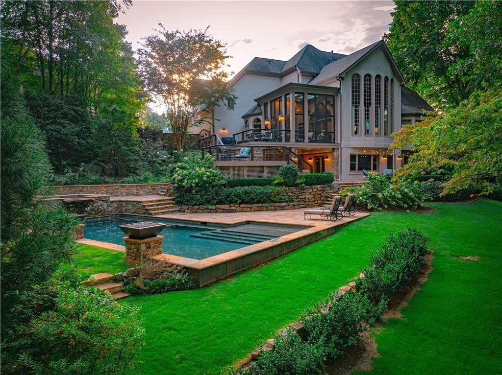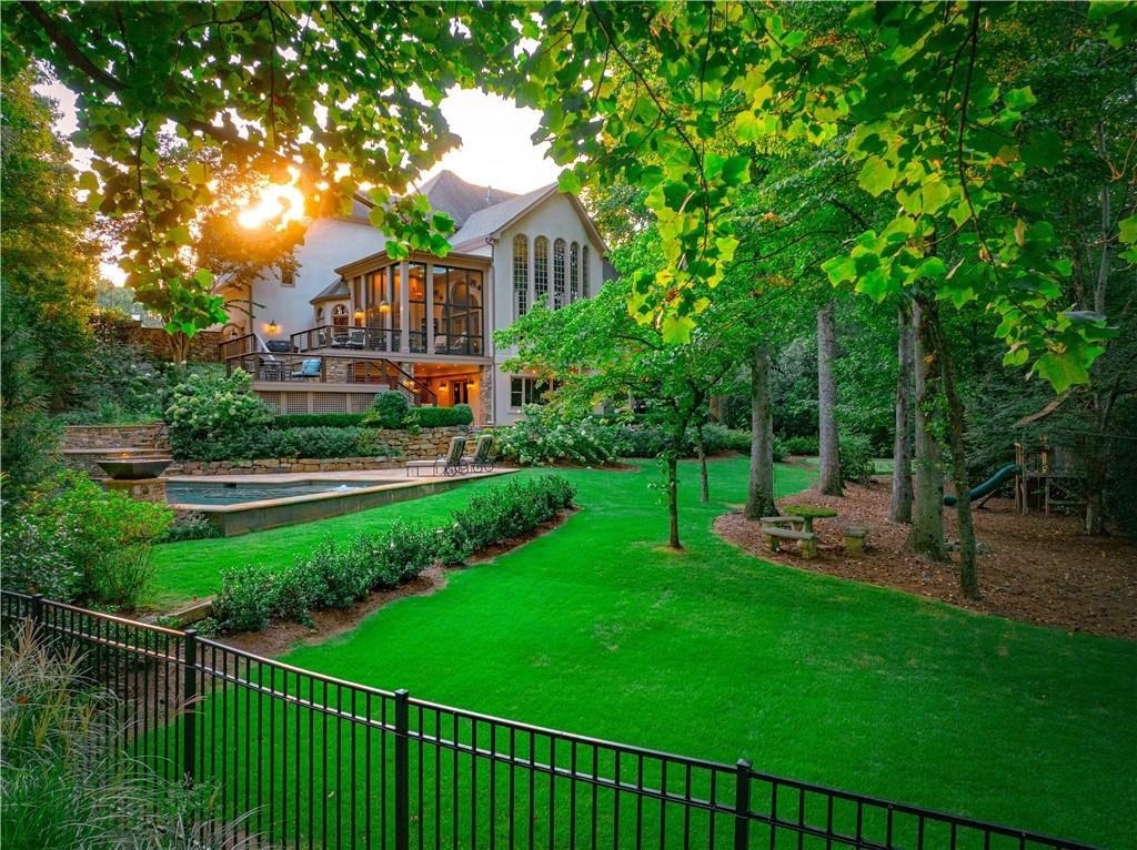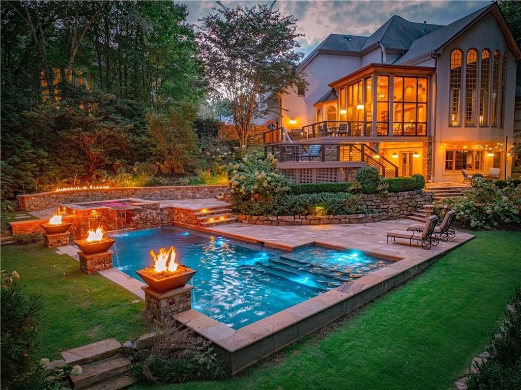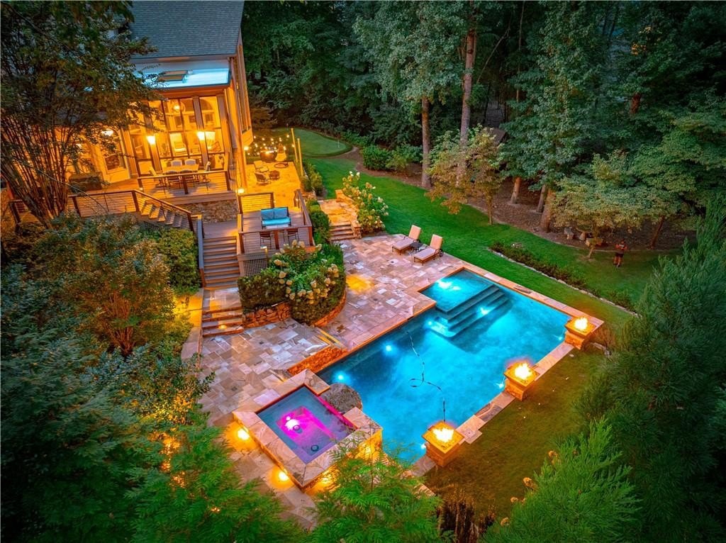 An Exceptional Family Retreat with Resort-Style Living. Welcome to 520 Harbour Gate Circle, a truly rare opportunity to own a private, luxury single-family residence tucked away at the end of a quiet cul-de-sac in the highly desirable The Falls of Autry Mill community. Thoughtfully updated and meticulously maintained, this home blends upscale finishes with everyday comfort-perfect for families who love to gather, entertain, and unwind at home. The backyard is nothing short of extraordinary. Completely reimagined in 2021, it feels like your own private resort. A heated saltwater pool anchors the space, surrounded by expansive stonework, dramatic fire features, and elegant evening lighting. Enjoy the hot tub, fire bowls, fire bench, and putting green, creating year-round opportunities for relaxation and fun. Multiple Trex terraces and deck walkways cascade down to the pool, offering both durability and refined design. Entertain effortlessly under the covered patio with fireplace and TV, enjoy music throughout the outdoor Sonos system, relax in the enclosed patio, or watch the kids play on the zip line. A professionally installed mosquito mist system (2025) ensures comfortable outdoor living in every season. Each spring, the property comes alive as vibrant azaleas bloom, adding breathtaking color to this already stunning setting. Inside, the home is equally impressive. The main-level primary suite offers a beautifully updated bath, providing a private retreat. Formal living and dining rooms add classic elegance, while the updated family room with fireplace and Sonos system creates a welcoming space for everyday living. In 2024, the main level and basement were refreshed with new cabinetry, updated half bath, modern lighting, and fresh paint, enhancing both style and function. Upstairs, you'll find three spacious bedrooms and two full baths, including a convenient shared-bath suite-ideal for family or guests. A three-car garage provides ample room for vehicles, storage, or even a golf cart. This is more than a home-it's a lifestyle opportunity. Private, polished, and designed for making memories, 520 Harbour Gate Circle is a must-see for buyers seeking the perfect blend of luxury and family living.