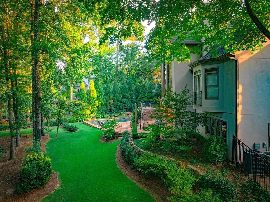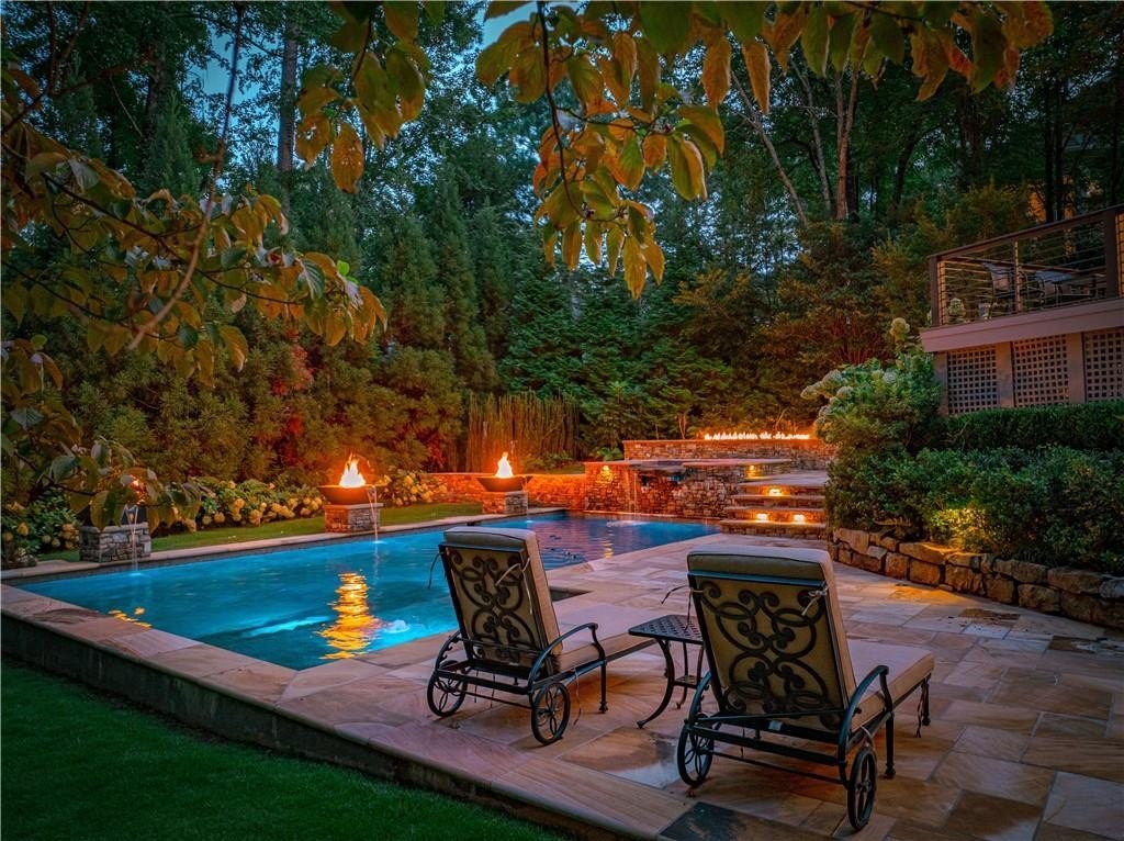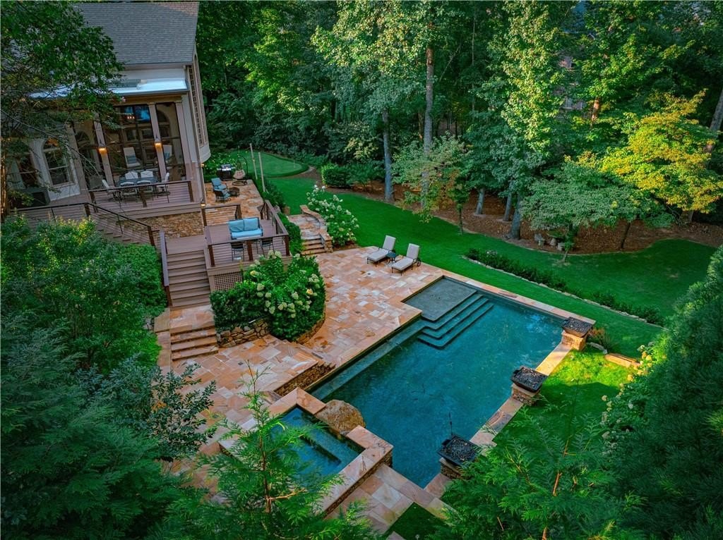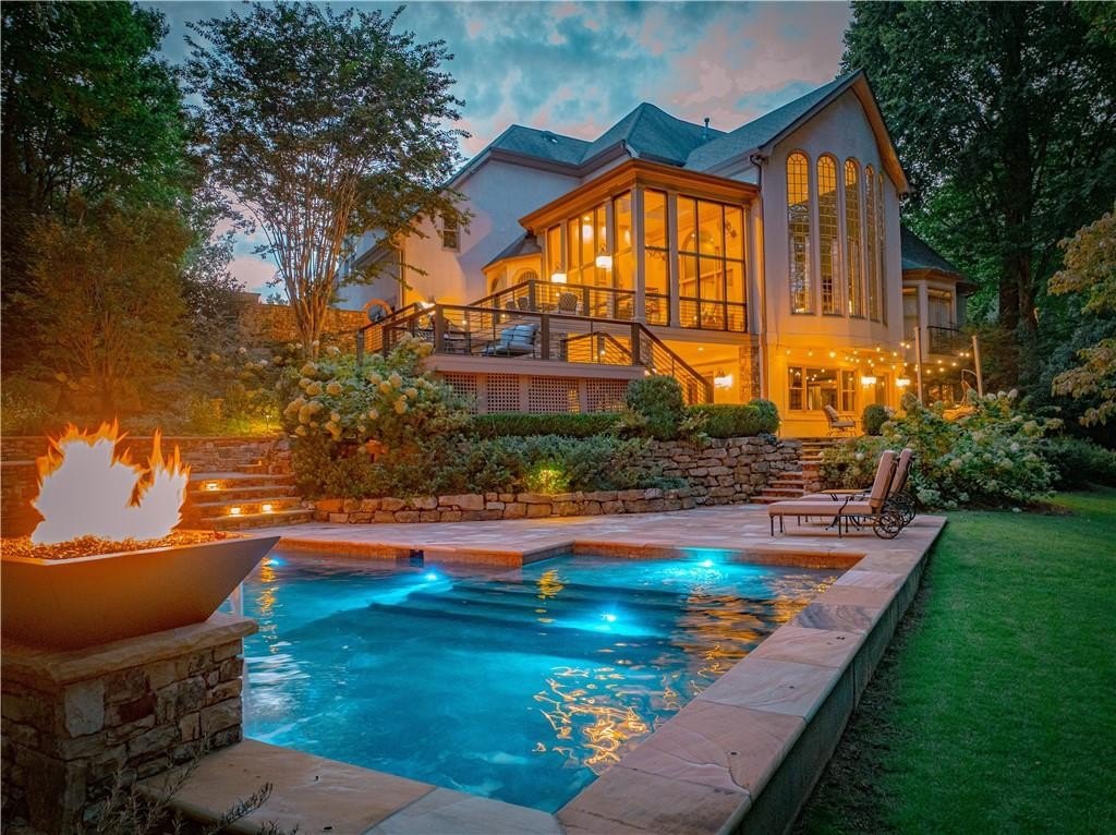 An Exceptional Family Retreat with Resort-Style Living. Welcome to 520 Harbour Gate Circle, a truly rare opportunity to own a private, luxury single-family residence tucked away at the end of a quiet cul-de-sac in the highly desirable The Falls of Autry Mill community. Thoughtfully updated and meticulously maintained, this home blends upscale finishes with everyday comfort-perfect for families who love to gather, entertain, and unwind at home. The backyard is nothing short of extraordinary. Completely reimagined in 2021, it feels like your own private resort. A heated saltwater pool anchors the space, surrounded by expansive stonework, dramatic fire features, and elegant evening lighting. Enjoy the hot tub, fire bowls, fire bench, and putting green, creating year-round opportunities for relaxation and fun. Multiple Trex terraces and deck walkways cascade down to the pool, offering both durability and refined design. Entertain effortlessly under the covered patio with fireplace and TV, enjoy music throughout the outdoor Sonos system, relax in the enclosed patio, or watch the kids play on the zip line. A professionally installed mosquito mist system (2025) ensures comfortable outdoor living in every season. Each spring, the property comes alive as vibrant azaleas bloom, adding breathtaking color to this already stunning setting. Inside, the home is equally impressive. The main-level primary suite offers a beautifully updated bath, providing a private retreat. Formal living and dining rooms add classic elegance, while the updated family room with fireplace and Sonos system creates a welcoming space for everyday living. In 2024, the main level and basement were refreshed with new cabinetry, updated half bath, modern lighting, and fresh paint, enhancing both style and function. Upstairs, you'll find three spacious bedrooms and two full baths, including a convenient shared-bath suite-ideal for family or guests. A three-car garage provides ample room for vehicles, storage, or even a golf cart. This is more than a home-it's a lifestyle opportunity. Private, polished, and designed for making memories, 520 Harbour Gate Circle is a must-see for buyers seeking the perfect blend of luxury and family living.