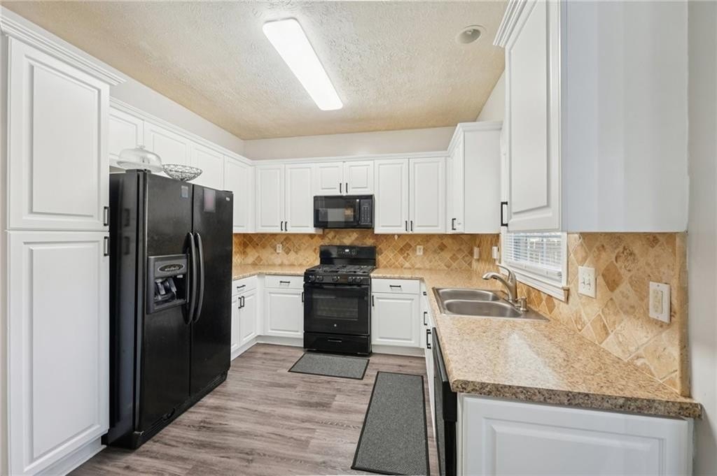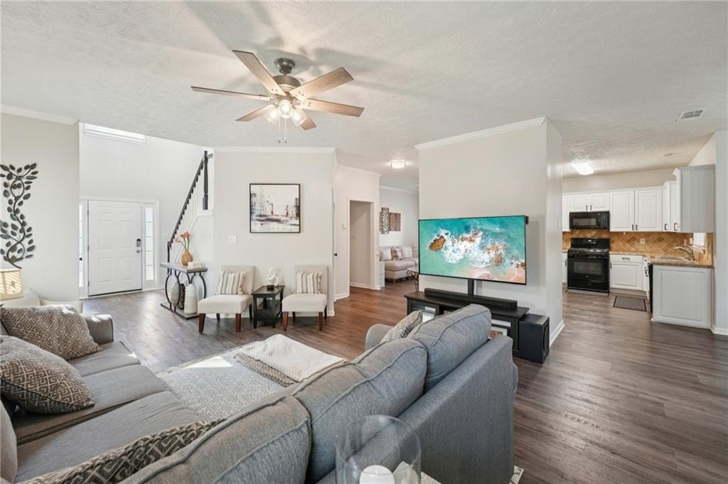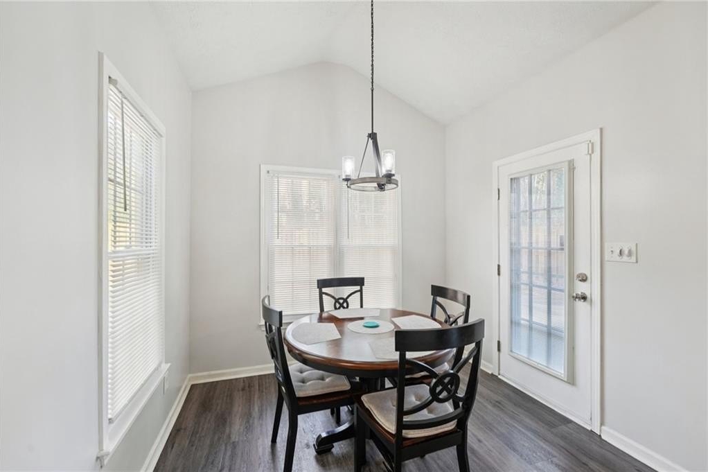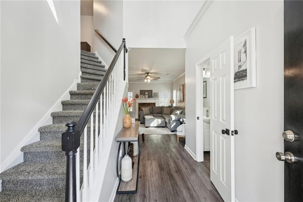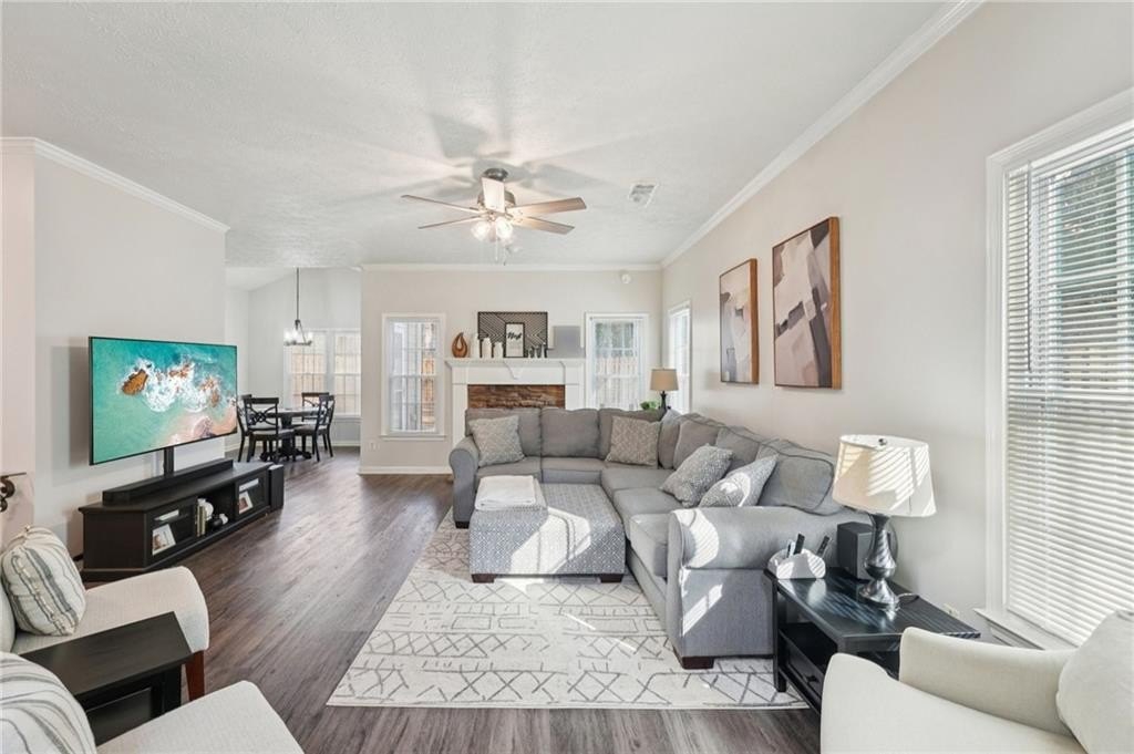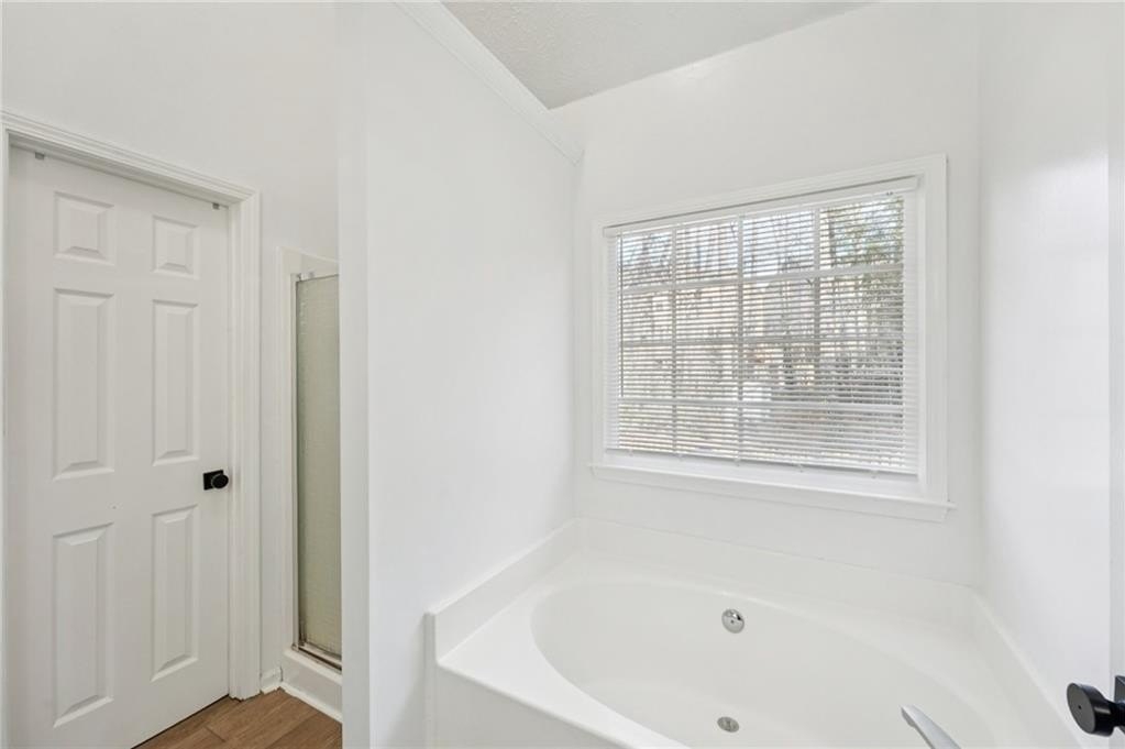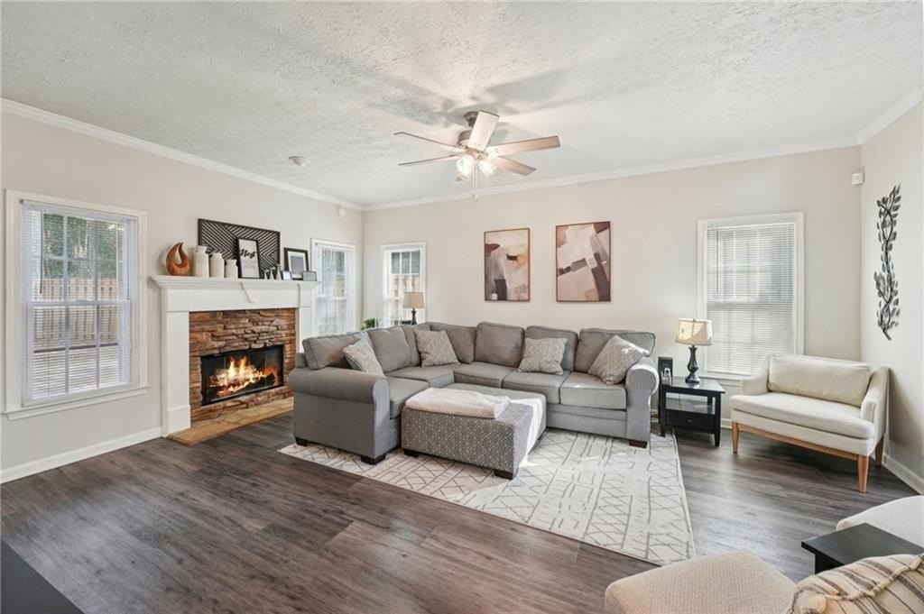 Don't miss this beautifully updated home, thoughtfully enhanced with an impressive list of major upgrades for peace of mind and modern living. Recent improvements include a new roof, windows, two HVAC systems, water heater, flooring, interior and exterior paint, fully updated full and half bathrooms, composite deck, gutter guards, and a refreshed kitchen with refaced cabinetry-allowing you to move in and enjoy with confidence. Welcoming curb appeal sets the tone with a sweeping front lawn and charming front porch. Inside, durable and stylish vinyl wood flooring flows seamlessly throughout the main-level living spaces. The spacious living room is filled with natural light and features elegant crown molding and a cozy stone fireplace-perfect for both everyday living and entertaining. The bright, modern kitchen showcases on-trend white cabinetry, tile backsplash, and a sun-filled breakfast area with serene views of the backyard. A conveniently located laundry closet adds everyday functionality. A versatile flex space with crown molding offers endless possibilities as a formal dining room, formal living room, home office, or playroom. A well-appointed half bath completes the main level. Upstairs, the primary suite is a true retreat with a tray ceiling, walk-in closet, and en-suite bath featuring dual vanities, a soaking tub, and a glass-enclosed shower. Three generously sized secondary bedrooms and a full bath provide ample space for family and guests. Outdoor living shines with an oversized composite deck ideal for grilling and entertaining. The fenced backyard backs to wooded greenspace, offering exceptional privacy and a tranquil setting. Ideally located near shopping, dining, parks and major highways, this home is zoned for top-rated Kell High School and offers easy access to the I-75 Express Lanes-combining comfort, convenience, and lifestyle in one exceptional property.