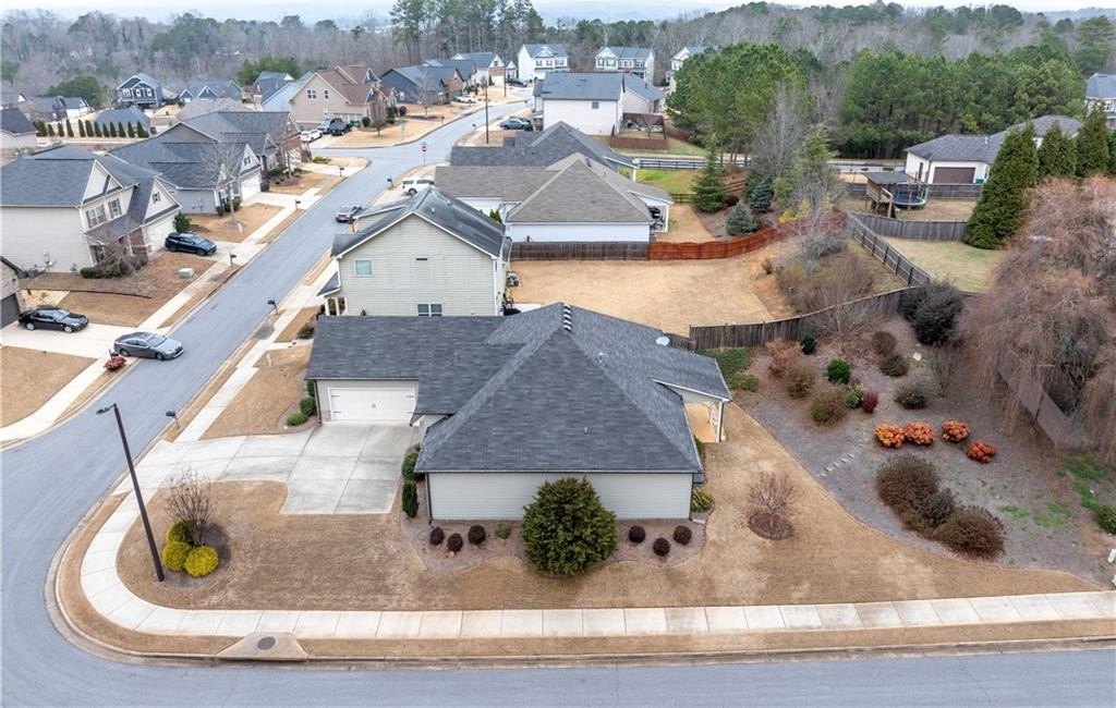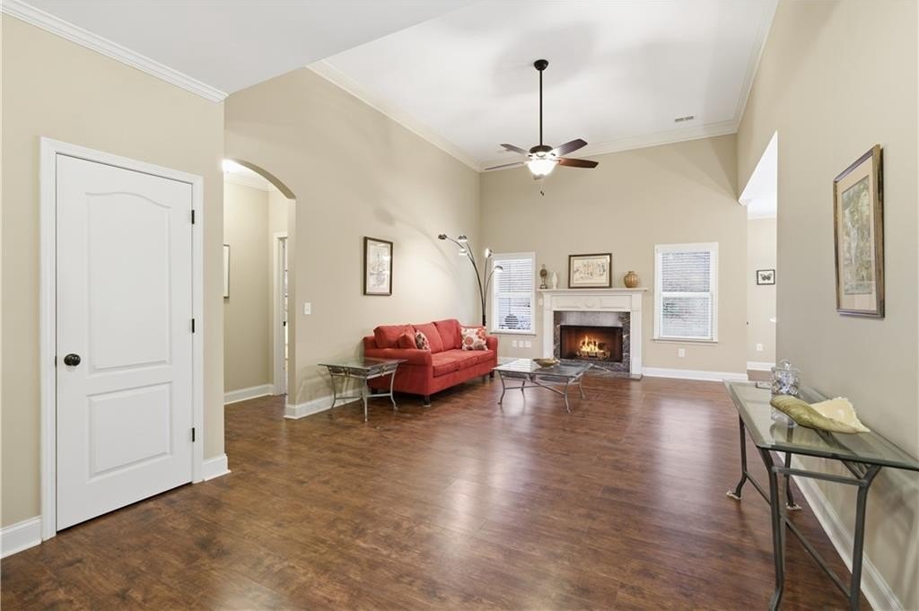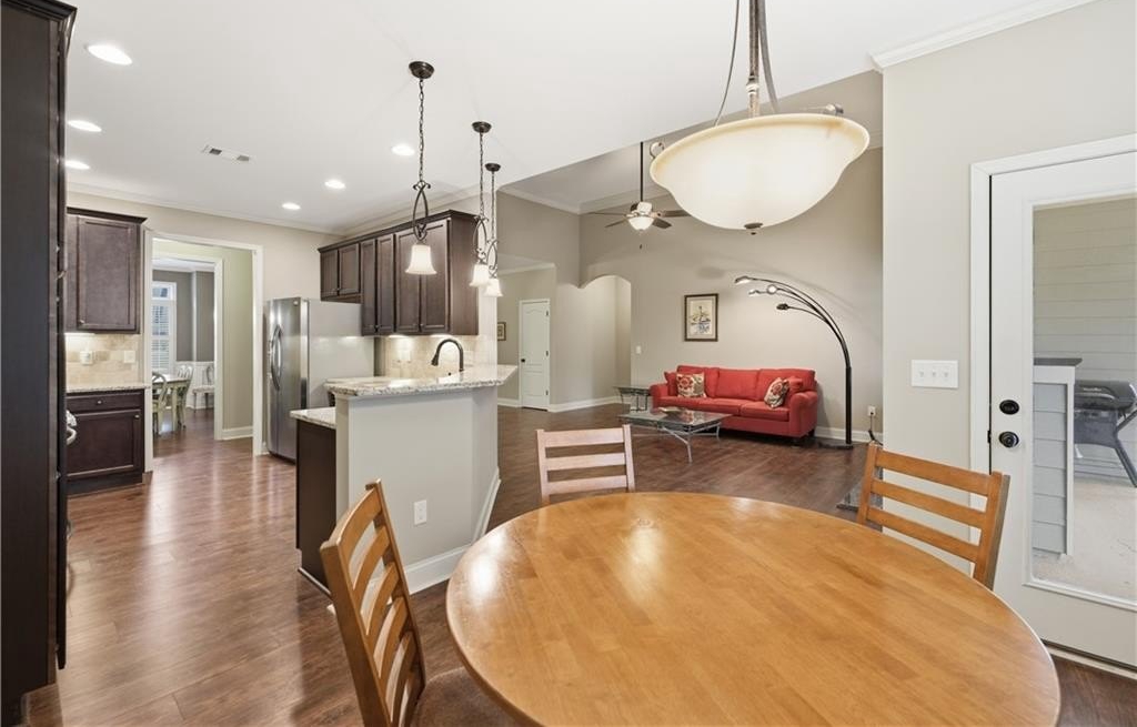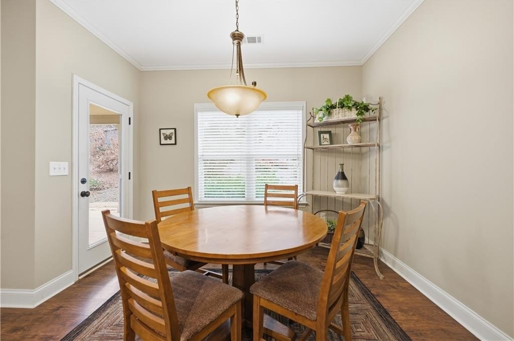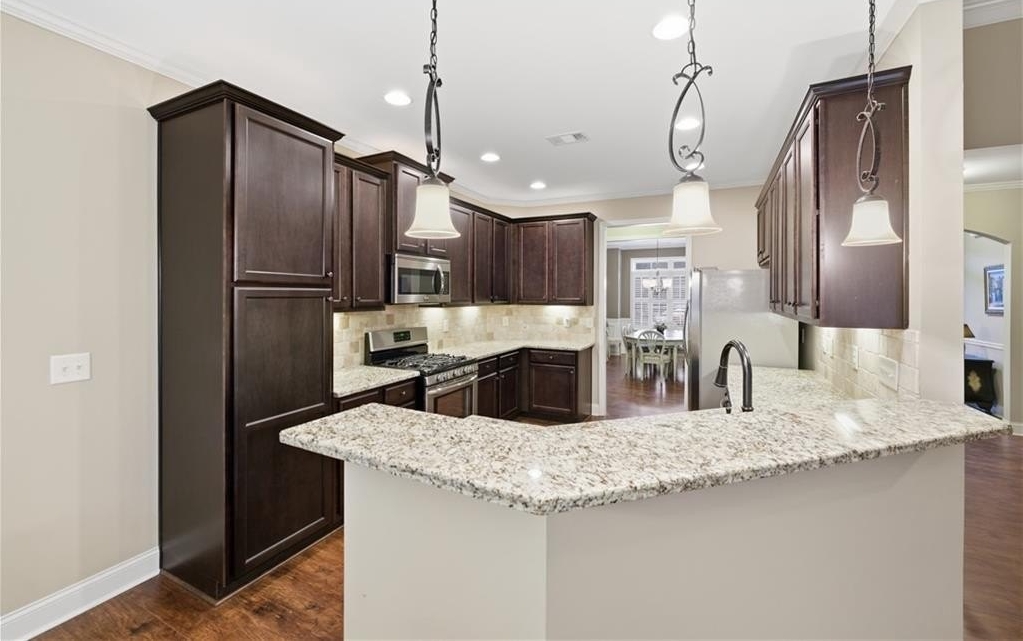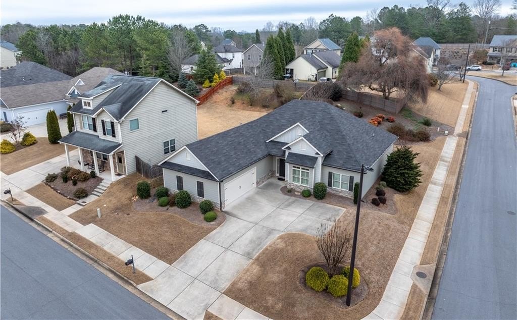 Welcome to this beautifully maintained 3 bedroom, 2.5 bath Craftsman style ranch situated on a desirable corner lot. From the moment you arrive, you'll appreciate the inviting curb appeal with shake siding accents, stone details, and a flat driveway leading to the garage. Step inside to an open and airy floor plan filled with natural light and warm toned hardwood flooring throughout the main living areas. Just off the foyer, the formal dining room impresses with a tray ceiling, crown molding, and direct access to the kitchen, making it ideal for entertaining. The spacious family room features large windows, a cozy fireplace, high ceilings, and a ceiling fan, creating a comfortable and welcoming gathering space. The chef inspired kitchen is loaded with upgrades including granite countertops, stone tile backsplash, stainless steel appliances, under cabinet lighting, abundant wood cabinetry, and a breakfast bar. Adjacent to the kitchen is a casual dining area with views into both the family room and backyard, perfect for everyday meals or morning coffee. The oversized primary suite offers a relaxing retreat with a tray ceiling and an en suite bath featuring double sinks, a vanity station, soaking tub, separate shower and a huge walk in closet. Two additional bedrooms are generously sized, each with walk in closets, and share a full bath with a tub/shower combination. A convenient half bath for guests and a spacious laundry room-smartly connected to the primary closet-add to the home's thoughtful layout. Enjoy outdoor living on the covered back patio overlooking an easy to maintain backyard, perfect for relaxing or hosting friends and family. Conveniently located near shopping, dining, and local amenities, this home offers comfort, style, and everyday convenience.