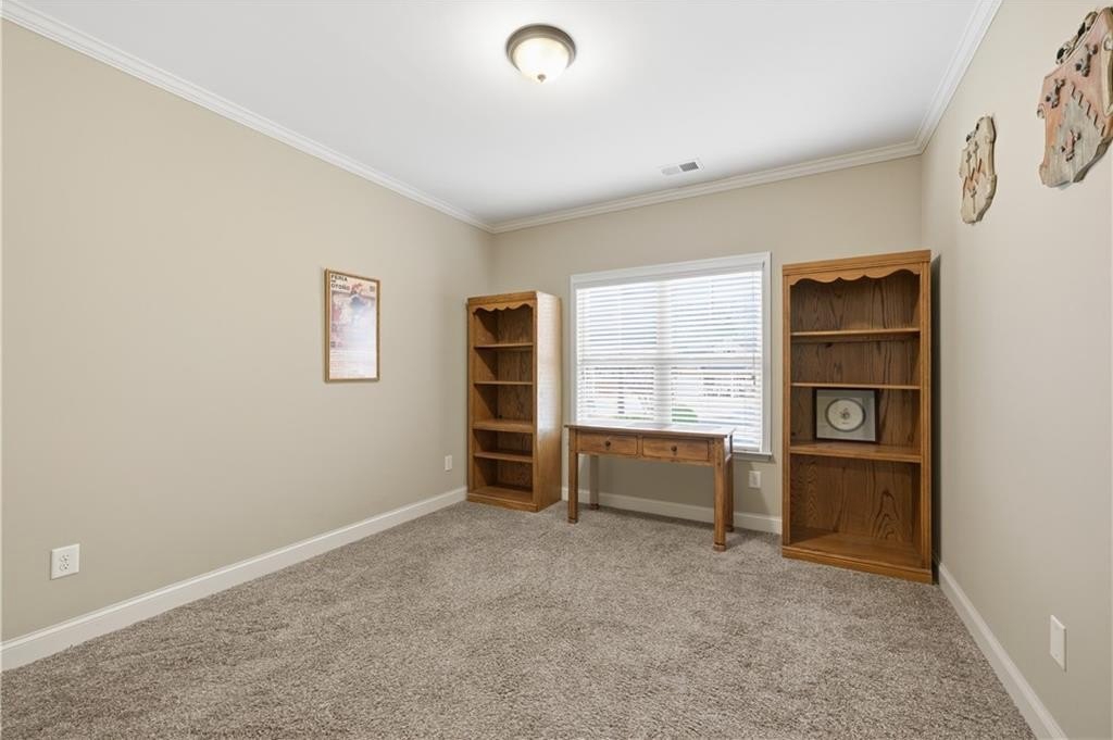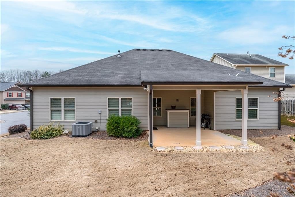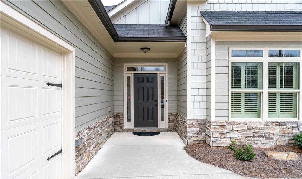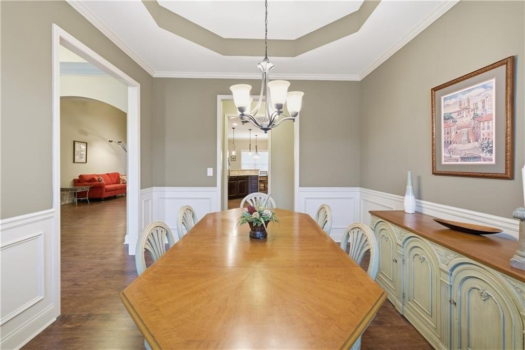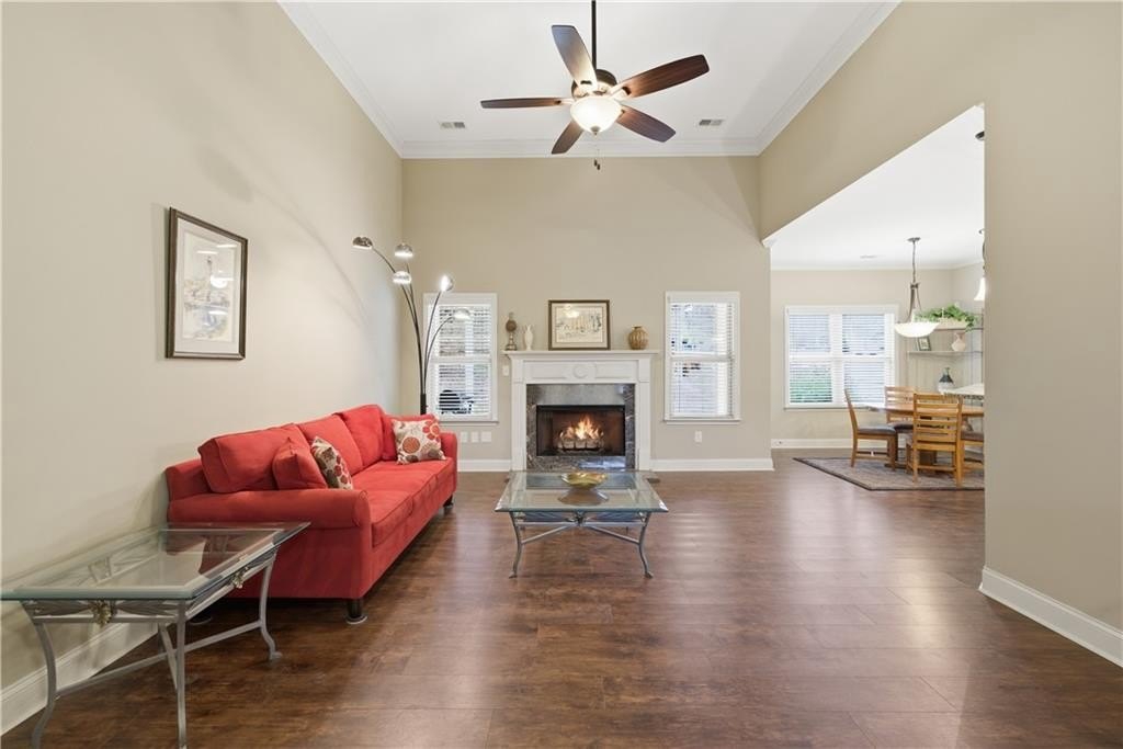 Welcome to this beautifully maintained 3 bedroom, 2.5 bath Craftsman style ranch situated on a desirable corner lot. From the moment you arrive, you'll appreciate the inviting curb appeal with shake siding accents, stone details, and a flat driveway leading to the garage. Step inside to an open and airy floor plan filled with natural light and warm toned hardwood flooring throughout the main living areas. Just off the foyer, the formal dining room impresses with a tray ceiling, crown molding, and direct access to the kitchen, making it ideal for entertaining. The spacious family room features large windows, a cozy fireplace, high ceilings, and a ceiling fan, creating a comfortable and welcoming gathering space. The chef inspired kitchen is loaded with upgrades including granite countertops, stone tile backsplash, stainless steel appliances, under cabinet lighting, abundant wood cabinetry, and a breakfast bar. Adjacent to the kitchen is a casual dining area with views into both the family room and backyard, perfect for everyday meals or morning coffee. The oversized primary suite offers a relaxing retreat with a tray ceiling and an en suite bath featuring double sinks, a vanity station, soaking tub, separate shower and a huge walk in closet. Two additional bedrooms are generously sized, each with walk in closets, and share a full bath with a tub/shower combination. A convenient half bath for guests and a spacious laundry room-smartly connected to the primary closet-add to the home's thoughtful layout. Enjoy outdoor living on the covered back patio overlooking an easy to maintain backyard, perfect for relaxing or hosting friends and family. Conveniently located near shopping, dining, and local amenities, this home offers comfort, style, and everyday convenience.