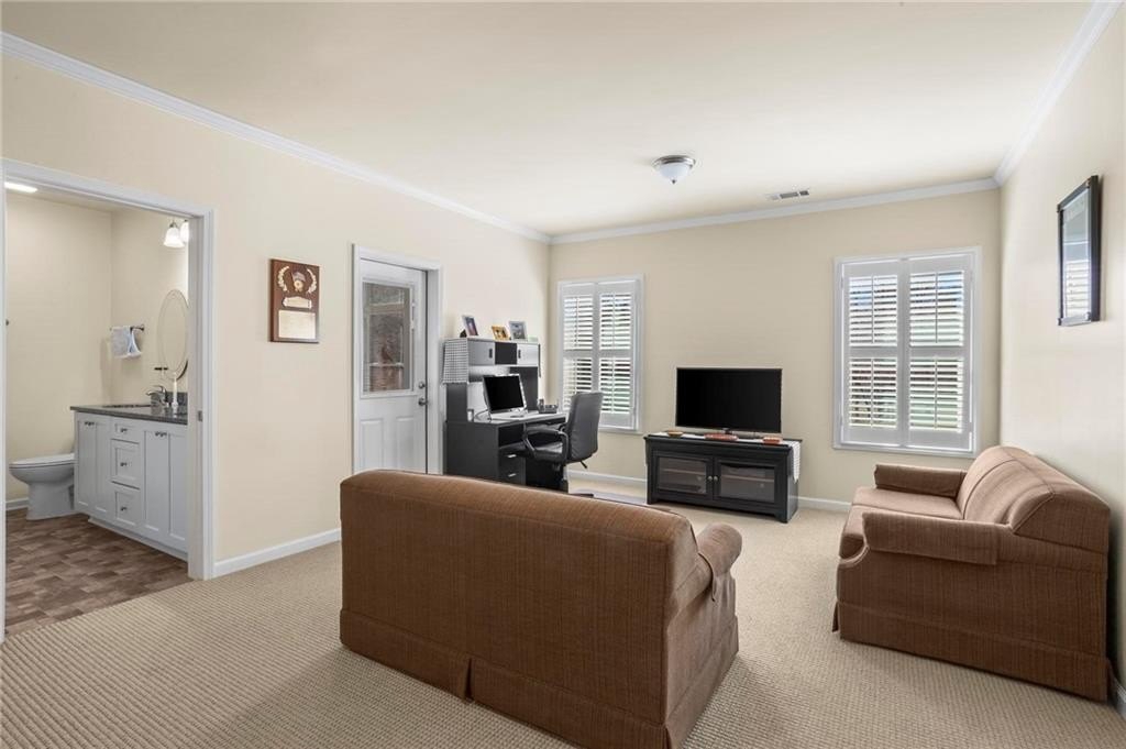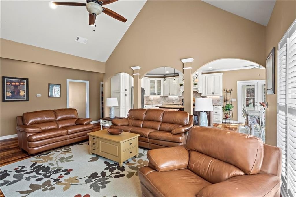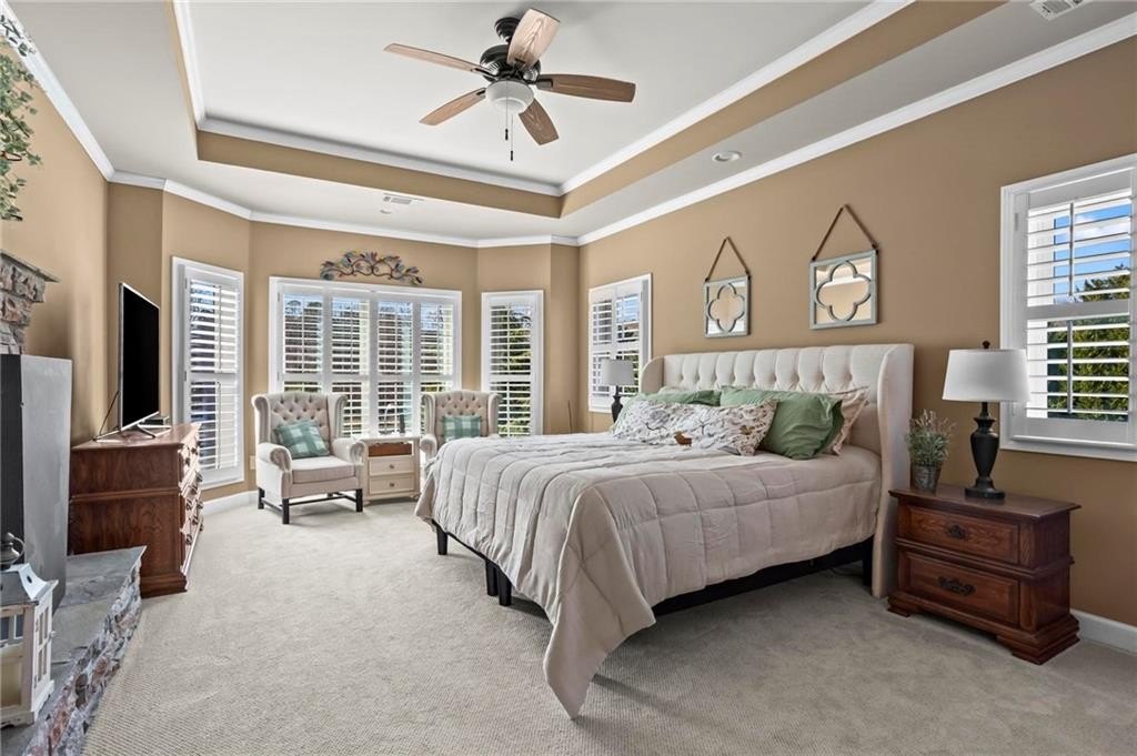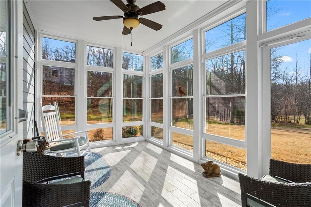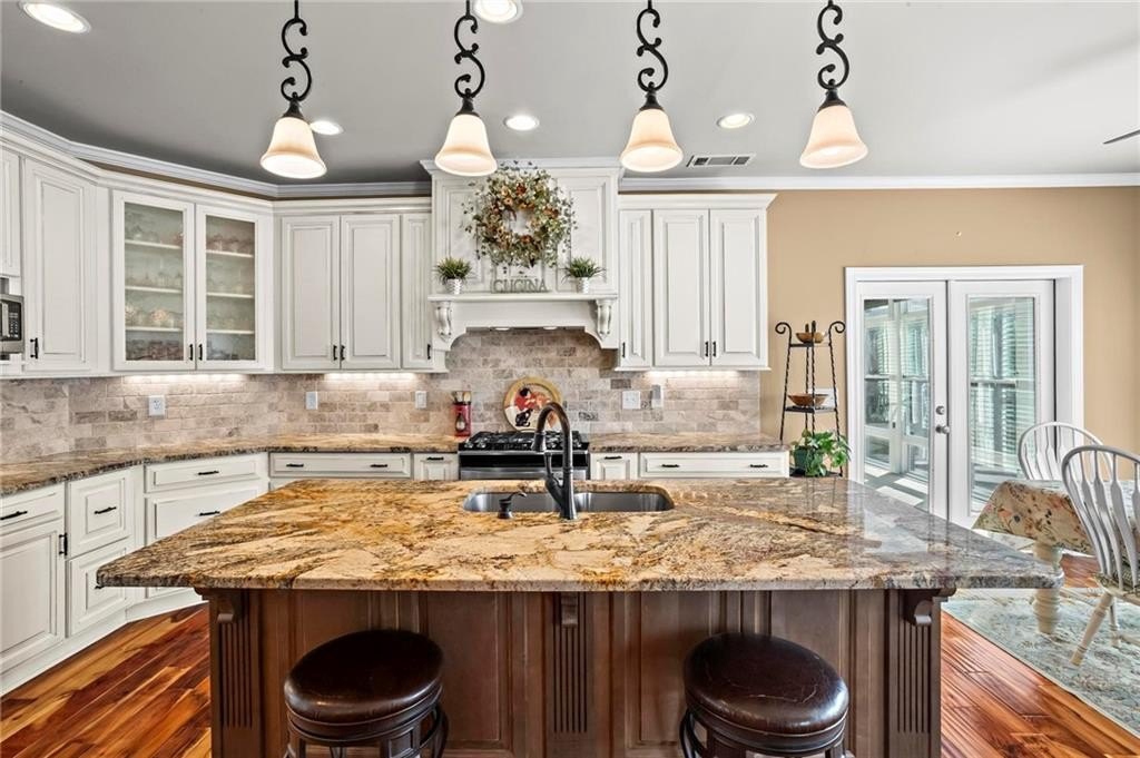 Nestled on over three acres of private, park-like grounds with beautiful frontage along Sharp Mountain Creek. This dream home in Ball Ground blends timeless Traditional charm with elevated rustic comfort. Designed for both relaxed living and welcoming gatherings. The home offers four bedrooms and four bathrooms, including a peaceful primary suite on the main level featuring a spa-like bath with a soaking tub. Open-concept family living centers around a warm, inviting kitchen with gorgeous granite countertops, rich hardwood floors, and a striking see-through fireplace that adds character and coziness to the living spaces. Two inviting all-weather rooms provide year-round enjoyment of the surrounding natural beauty. The upper level features one private bedroom with a full bath, ideal for guests or a quiet retreat. The fully finished basement, complete with a full kitchen, provides exceptional flexibility for multigenerational living or private guest accommodations. Additional highlights include a whole-house water softener, a 5 car garage (two on main level, one basement level and two detached spaces), and a custom irrigation system. Ideally located just two miles from charming downtown Ball Ground, minutes from the interstate, and approximately 20 minutes from downtown Woodstock and Jasper, this peaceful retreat is situated within the sought-after Creekland and Creekview top-rated school district. More than a home, this is a sanctuary-where nature, comfort, and craftsmanship come together. Don't let this one get away!