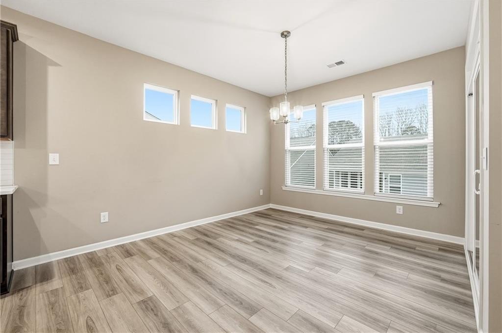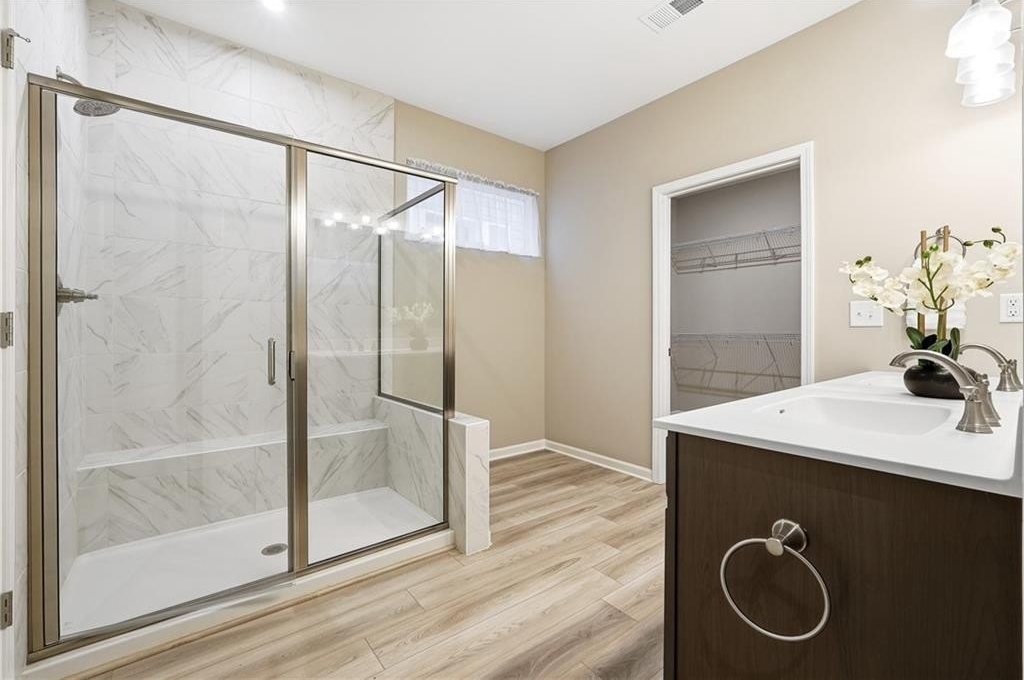 This beautifully maintained home in the gated Poplar Place 55+ community offers the perfect blend of modern comfort and easy living. You'll love the open, thoughtfully designed floor plan. A welcoming foyer leads into a bright, spacious great room that flows seamlessly into the kitchen and dining area. Light LVP flooring runs throughout the main living areas, with carpeted bedrooms and tiled baths. The gas log fireplace features a stunning tile surround, creating a warm focal point in the great room. The chef's kitchen features quartz countertops, a huge island, stained cabinetry, stainless steel appliances (including refrigerator), a gas cooktop, microwave, walk-in pantry, and a sunny breakfast area. Enjoy your morning coffee or evening relaxation on the screened porch. The primary suite offers a private retreat with a spacious tiled shower, dual vanities, safety bars, and a walk-in closet. Two additional bedrooms with generous closets share a well-appointed hall bath. Storage is abundant throughout the home, with multiple large closets, linen storage, and a roomy laundry room. Additional highlights include a two-car garage and a convenient location just minutes to Dallas Hwy/120, Hwy 92, Walmart, and Costco. The community features a clubhouse, pickleball court, and a full calendar of activities designed for active, low-maintenance living.
