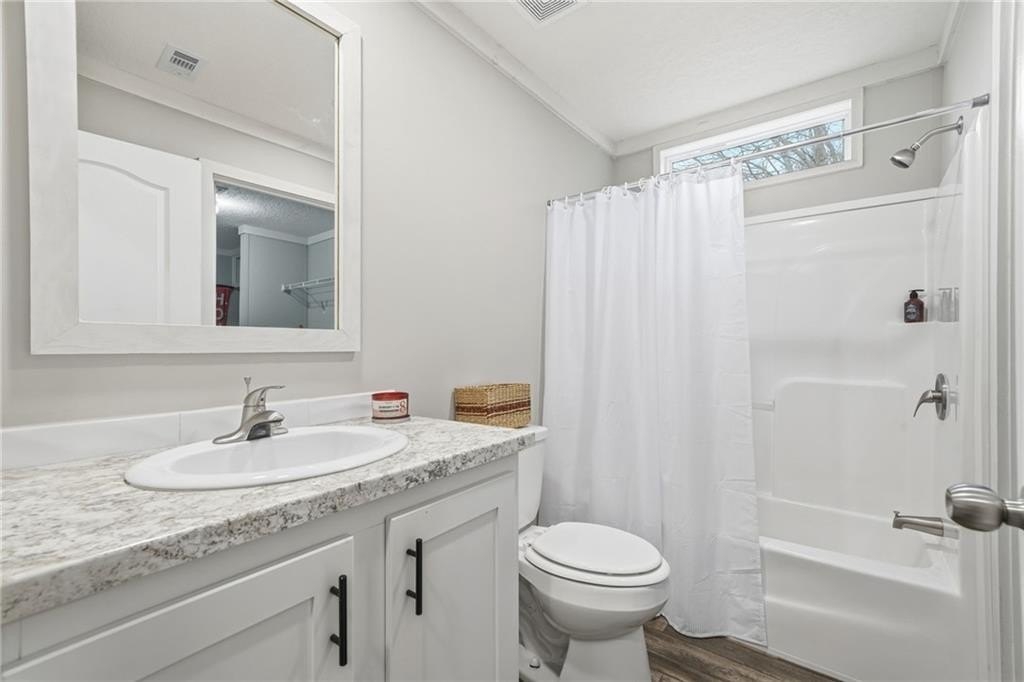 Brand new 3-bedroom, 2-bath home on a permanent foundation, located in the highly sought-after Creekview School District and close to downtown Ball Ground all with no HOA. Set on nearly a full acre of level land, this home features an open-concept kitchen, dining, and living area with wood beams, luxury vinyl plank flooring, and top-of-the-line finishes throughout. The kitchen offers brand-new stainless-steel Frigidaire appliances, ample cabinetry, and a walk-in pantry, making it ideal for both everyday living and entertaining. All three bedrooms are generously sized, including a spacious primary suite with a full private bath. Outside, enjoy the flat lot with plenty of room to expand, garden, or relax. A brand-new galvanized steel 2-car carport provides covered parking, while nice sized storage shed offers excellent storage or workshop space. This move-in ready property combines modern comfort, quality construction, and freedom with no HOA restrictions.