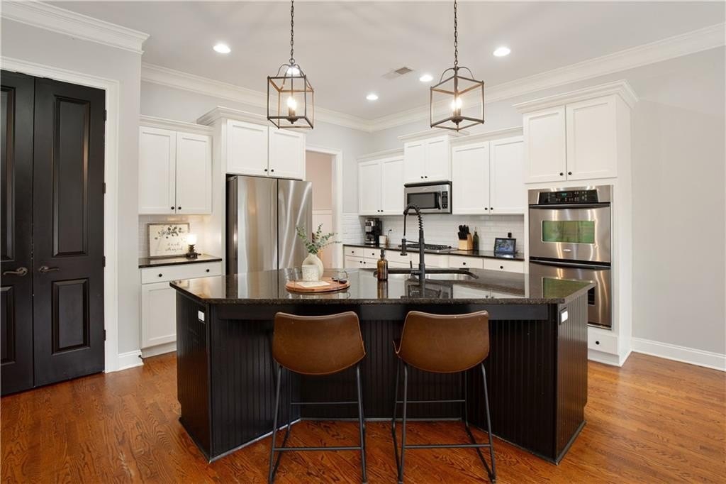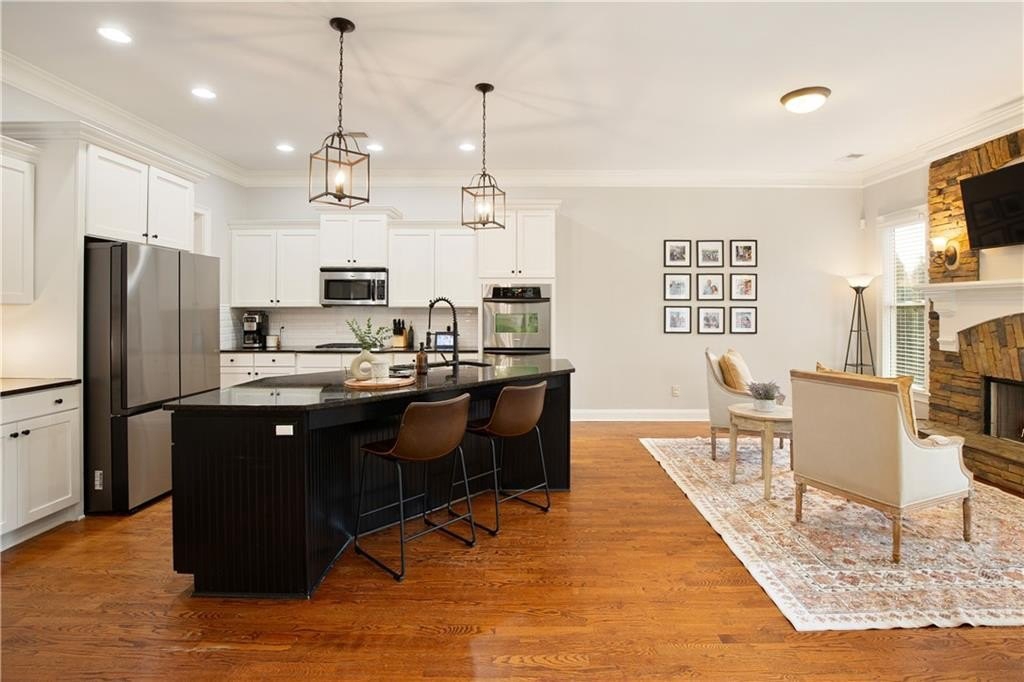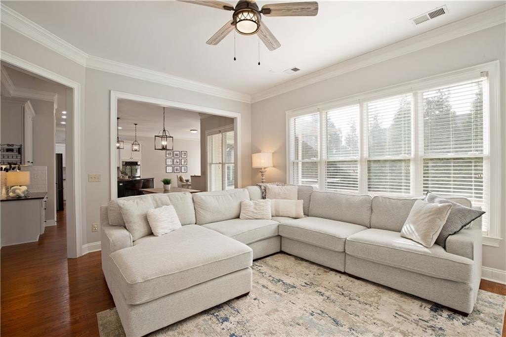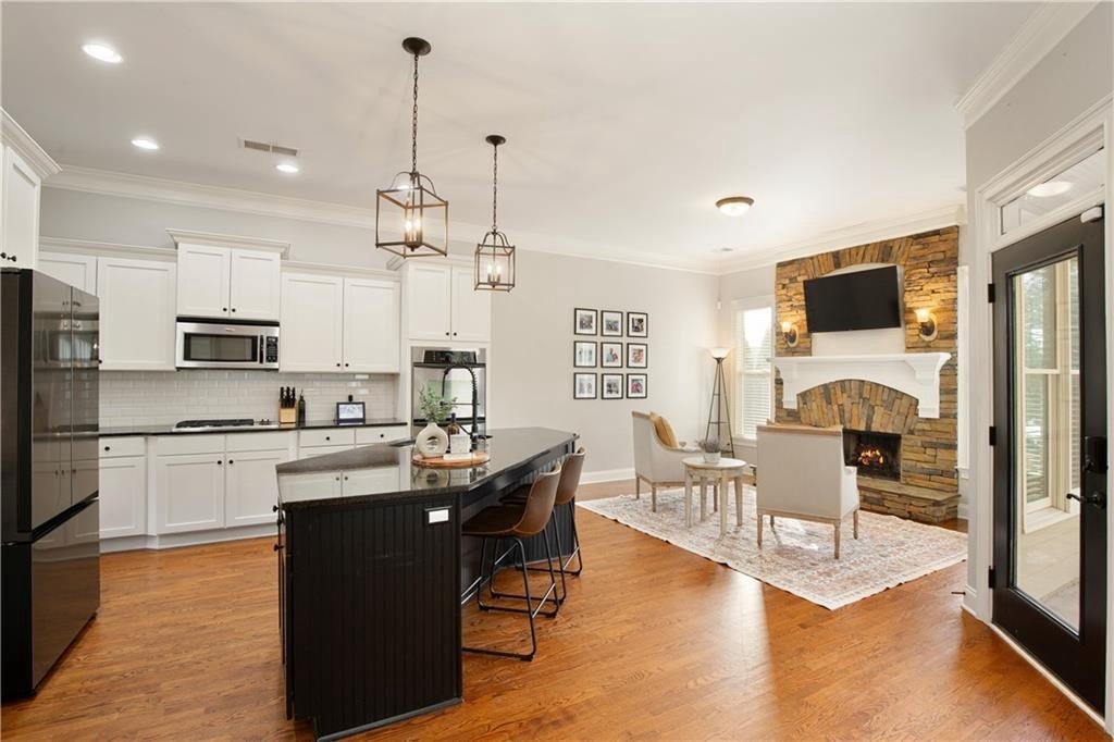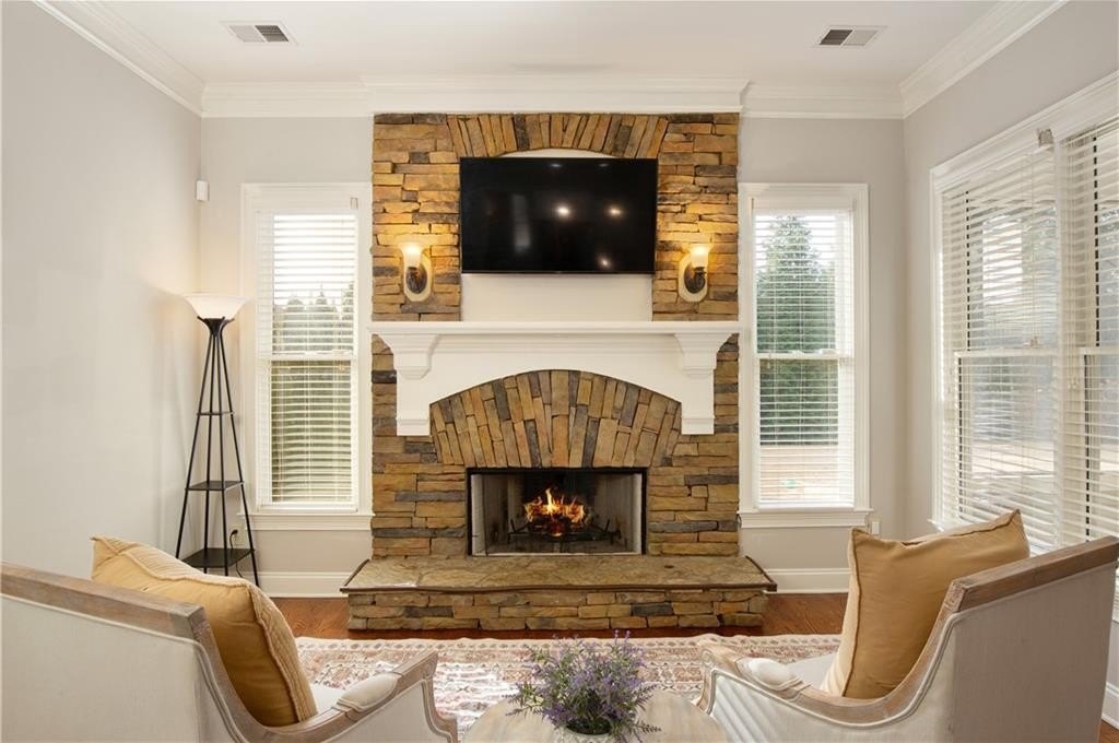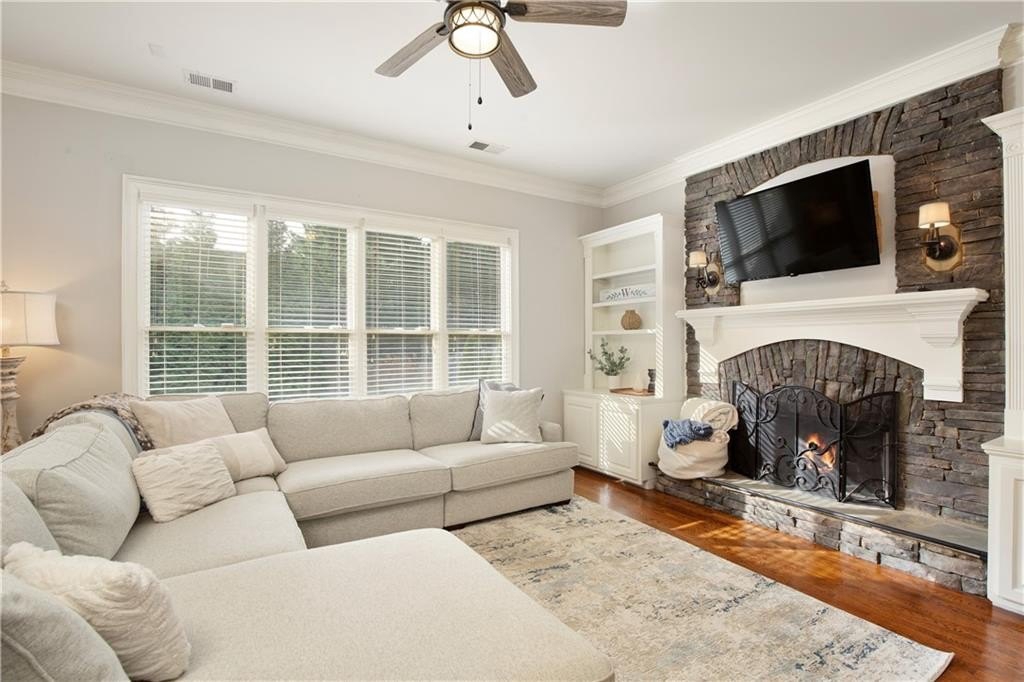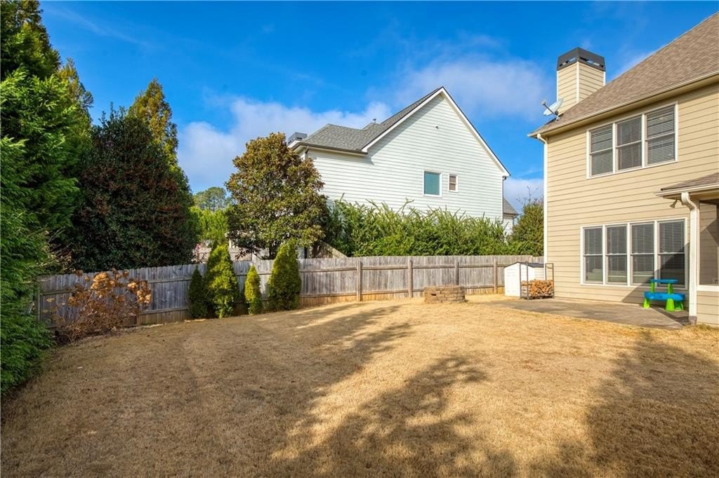 Located in the highly sought-after Silver City Elementary and North Forsyth High School district, this beautifully updated home sits in a quiet, family-friendly neighborhood with a community pool just a short walk away. Inside, you'll find a fantastic open floorplan designed for both everyday living and entertaining. The updated kitchen features a gas range, double ovens, abundant cabinetry, updated lighting, fresh paint, and wood floors, and opens seamlessly to the cozy keeping room with a stone fireplace and dining area. A separate, oversized family room offers another stone fireplace with built-in bookcases, creating multiple inviting living spaces on the main level. A formal dining room and convenient half bath complete the first floor. Step outside to enjoy true Georgia living with a screened-in porch, a large patio ideal for grilling and gathering, and a very flat, fully fenced backyard-perfect for play, pets, or entertaining. Upstairs, the spacious owner's suite is a true retreat with dual vanities, soaking tub, separate shower, and exceptionally large his-and-her closets that connect directly to the laundry room. Three additional bedrooms and a large secondary bathroom provide plenty of space for family or guests. With a newer roof, updated paint, a great community atmosphere, and walkability to the neighborhood pool, this home checks all the boxes for comfort, convenience, and top-tier schools.