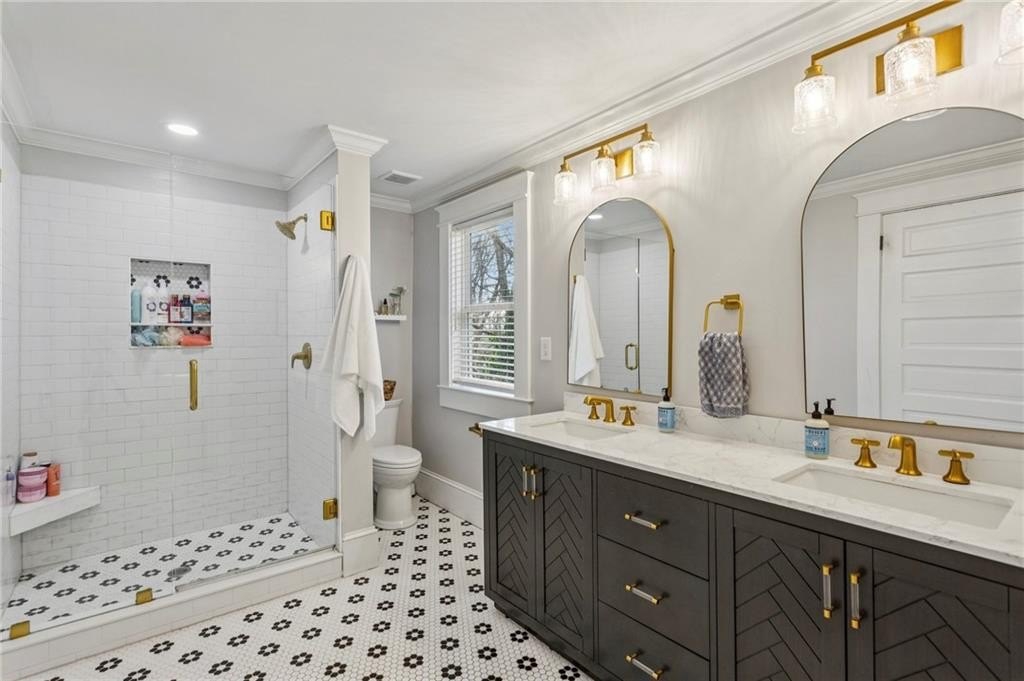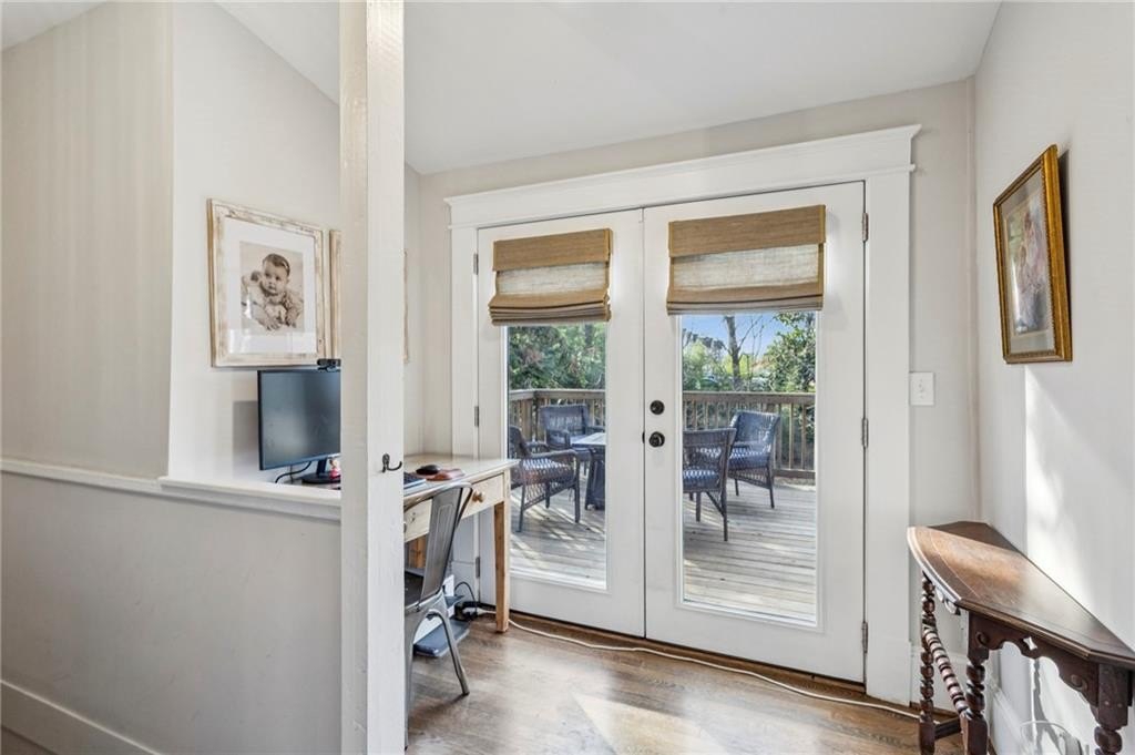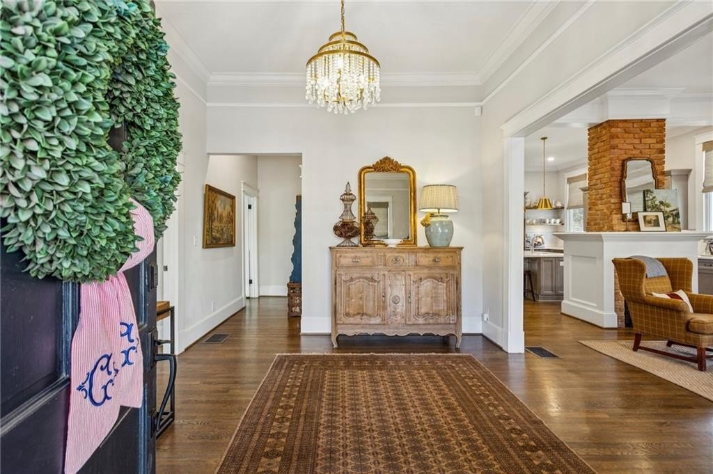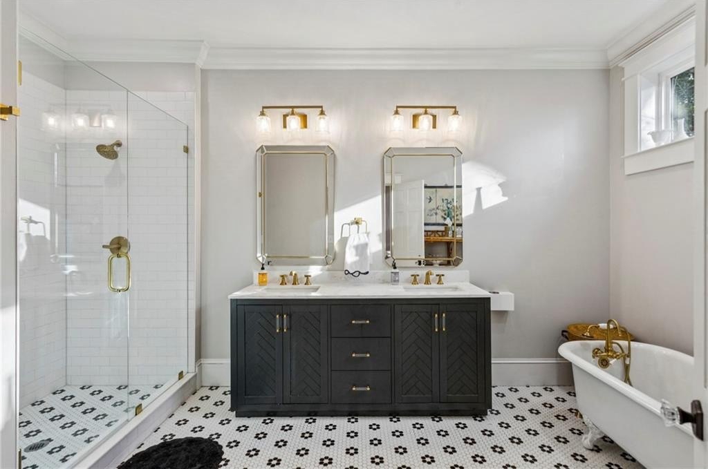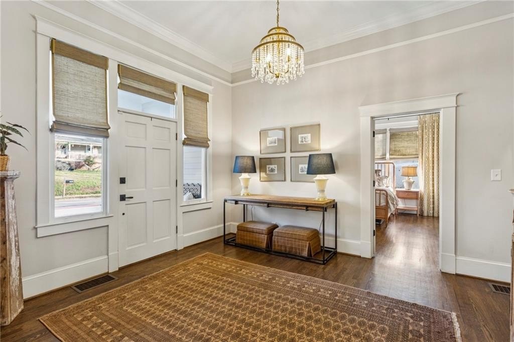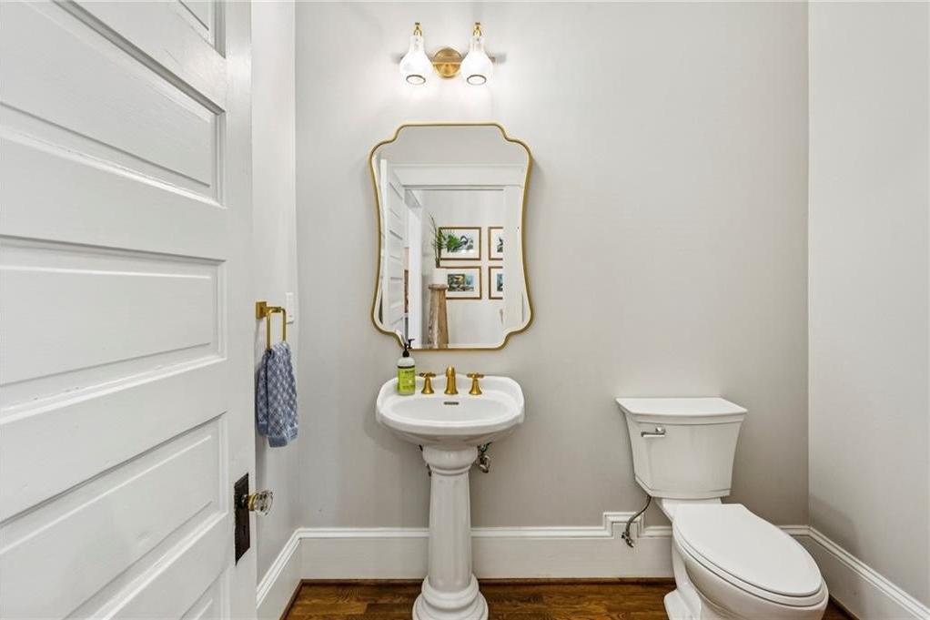 Historic Marietta bungalow built in 1906 and fully renovated two years ago, preserving its original charm while adding today's modern comforts. This home makes a striking first impression from the landscaped front yard to the brick walkway and covered front porch with copper gas lanterns. Inside, an open, inviting floor plan features 11-foot ceilings, hardwood flooring throughout, and large windows with custom woven shades and blinds. The family room features the original decorative double-sided fireplace, creating a warm and inviting focal point. The beautifully designed kitchen features custom cabinetry with soft-close drawers and doors, separate pantry cabinets, Quartz countertops, an oversized island with a breakfast bar, GE stainless steel appliances, including a gas cooktop, and brushed-brass lighting fixtures. A separate dining room sits just off the kitchen and includes a convenient half bath, perfect for entertaining. The owner's suite features two separate closets and a stunning en-suite bathroom with a double vanity, a ceramic-tile walk-in shower with a glass door, and a clawfoot soaking tub with an elegant floor-mounted brass tub filler and a hand-held sprayer. The oversized second bedroom includes double closets and an original decorative fireplace. It opens to a Jack-and-Jill bath with a double vanity and a ceramic tile walk-in shower, shared with the third bedroom, which is also accessible from the dining room. A separate laundry room with a utility sink adds everyday convenience. The unfinished daylight basement offers abundant storage or workshop space and can easily be finished into a recreation room or home office. The spacious attic also provides excellent potential for future expansion. Outdoors, enjoy a private, fenced backyard with mature trees and a deck ideal for relaxing or entertaining. The new driveway and parking pad accommodate 3 daily vehicles, and up to 8 for gatherings, with a new backyard gate that enhances privacy. Located on a charming street just steps from the Mountain to River (M2R) Trail, this home offers direct access to 13.5 miles of multi-use trails stretching from Kennesaw Mountain National Battlefield Park to the Chattahoochee River National Recreation Area. Nearby Larry Bell Park features baseball and softball fields, tennis and pickleball courts, playgrounds, a walking track, and picnic areas. Historic Marietta Square is just a one-mile walk or bike ride away, offering exceptional dining, bars, festivals, live music, theatre, and comedy shows. Own a beautifully restored piece of Marietta history and create lasting memories in this exceptional home!