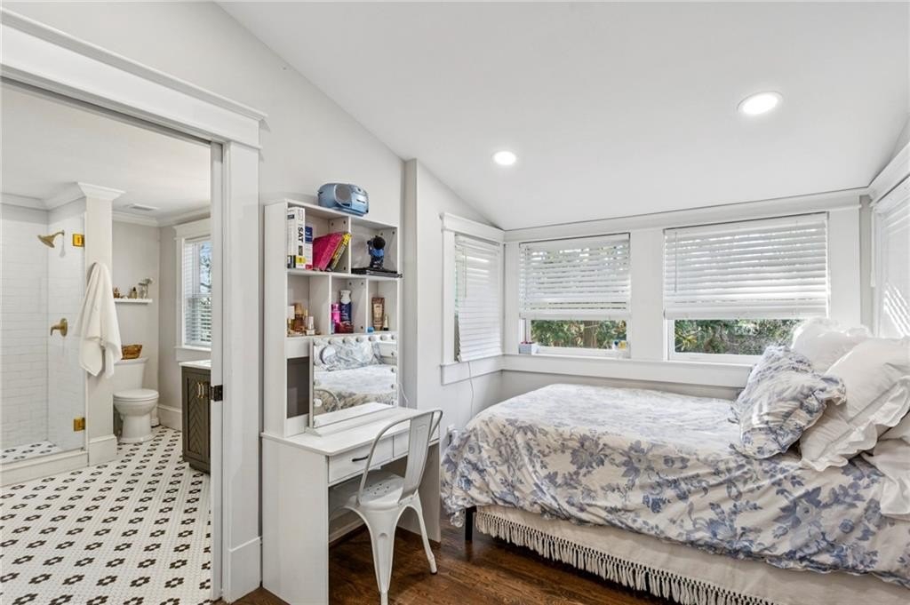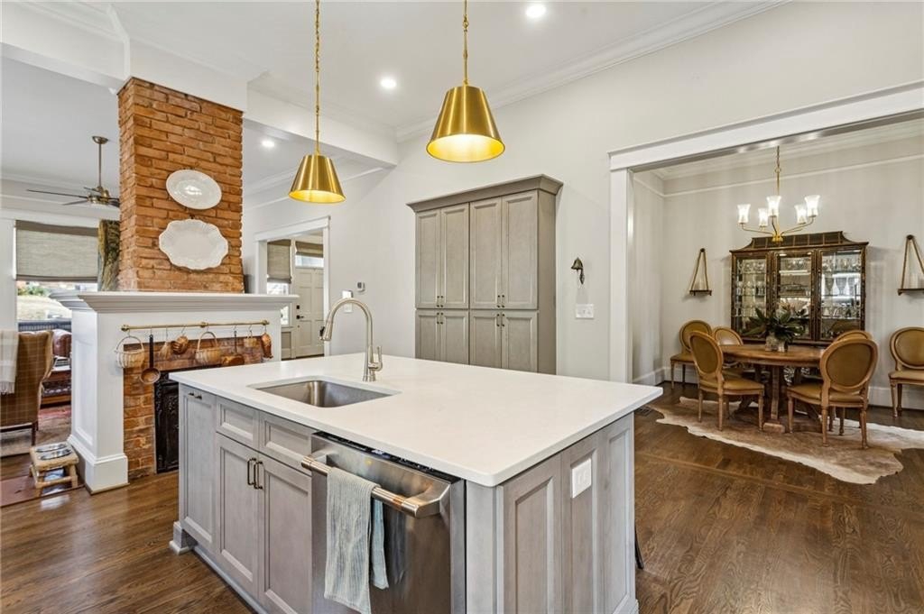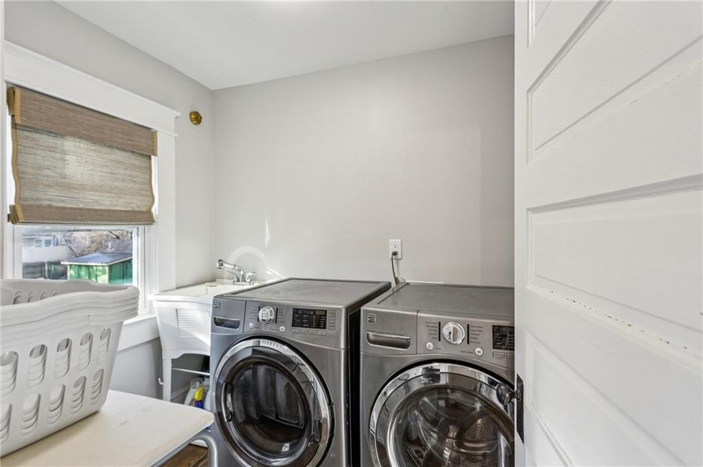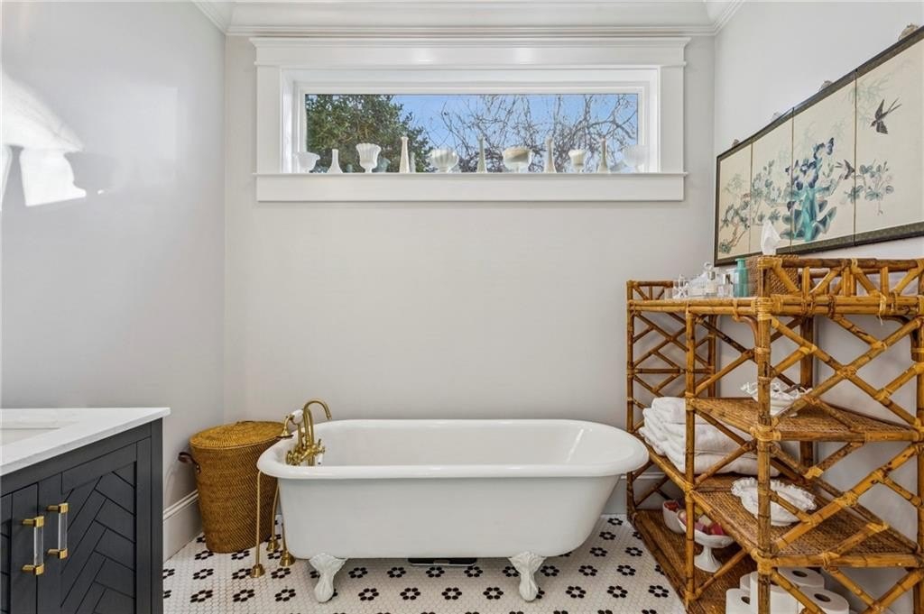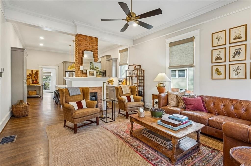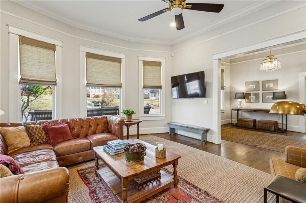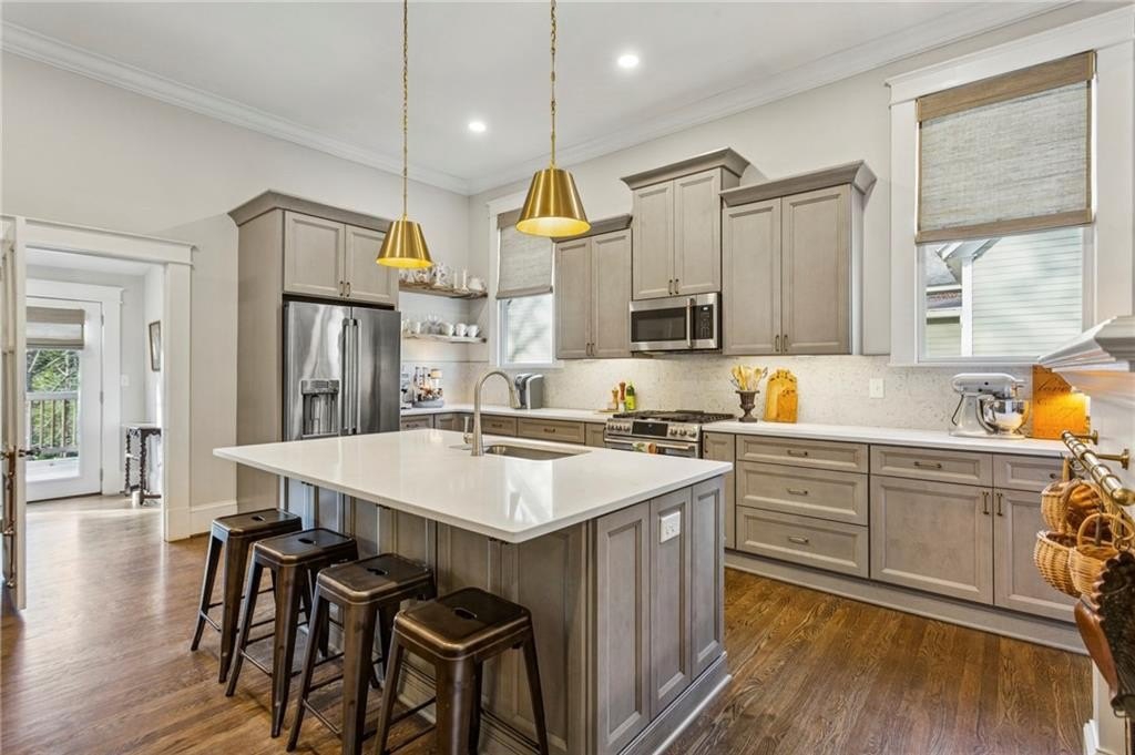 Historic Marietta bungalow built in 1906 and fully renovated two years ago, preserving its original charm while adding today's modern comforts. This home makes a striking first impression from the landscaped front yard to the brick walkway and covered front porch with copper gas lanterns. Inside, an open, inviting floor plan features 11-foot ceilings, hardwood flooring throughout, and large windows with custom woven shades and blinds. The family room features the original decorative double-sided fireplace, creating a warm and inviting focal point. The beautifully designed kitchen features custom cabinetry with soft-close drawers and doors, separate pantry cabinets, Quartz countertops, an oversized island with a breakfast bar, GE stainless steel appliances, including a gas cooktop, and brushed-brass lighting fixtures. A separate dining room sits just off the kitchen and includes a convenient half bath, perfect for entertaining. The owner's suite features two separate closets and a stunning en-suite bathroom with a double vanity, a ceramic-tile walk-in shower with a glass door, and a clawfoot soaking tub with an elegant floor-mounted brass tub filler and a hand-held sprayer. The oversized second bedroom includes double closets and an original decorative fireplace. It opens to a Jack-and-Jill bath with a double vanity and a ceramic tile walk-in shower, shared with the third bedroom, which is also accessible from the dining room. A separate laundry room with a utility sink adds everyday convenience. The unfinished daylight basement offers abundant storage or workshop space and can easily be finished into a recreation room or home office. The spacious attic also provides excellent potential for future expansion. Outdoors, enjoy a private, fenced backyard with mature trees and a deck ideal for relaxing or entertaining. The new driveway and parking pad accommodate 3 daily vehicles, and up to 8 for gatherings, with a new backyard gate that enhances privacy. Located on a charming street just steps from the Mountain to River (M2R) Trail, this home offers direct access to 13.5 miles of multi-use trails stretching from Kennesaw Mountain National Battlefield Park to the Chattahoochee River National Recreation Area. Nearby Larry Bell Park features baseball and softball fields, tennis and pickleball courts, playgrounds, a walking track, and picnic areas. Historic Marietta Square is just a one-mile walk or bike ride away, offering exceptional dining, bars, festivals, live music, theatre, and comedy shows. Own a beautifully restored piece of Marietta history and create lasting memories in this exceptional home!
