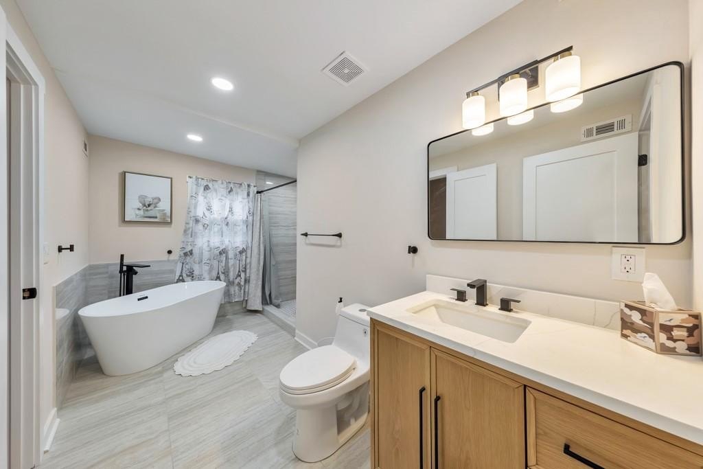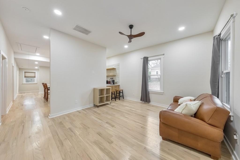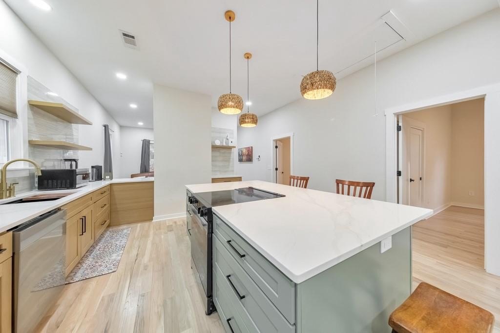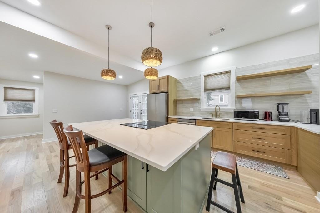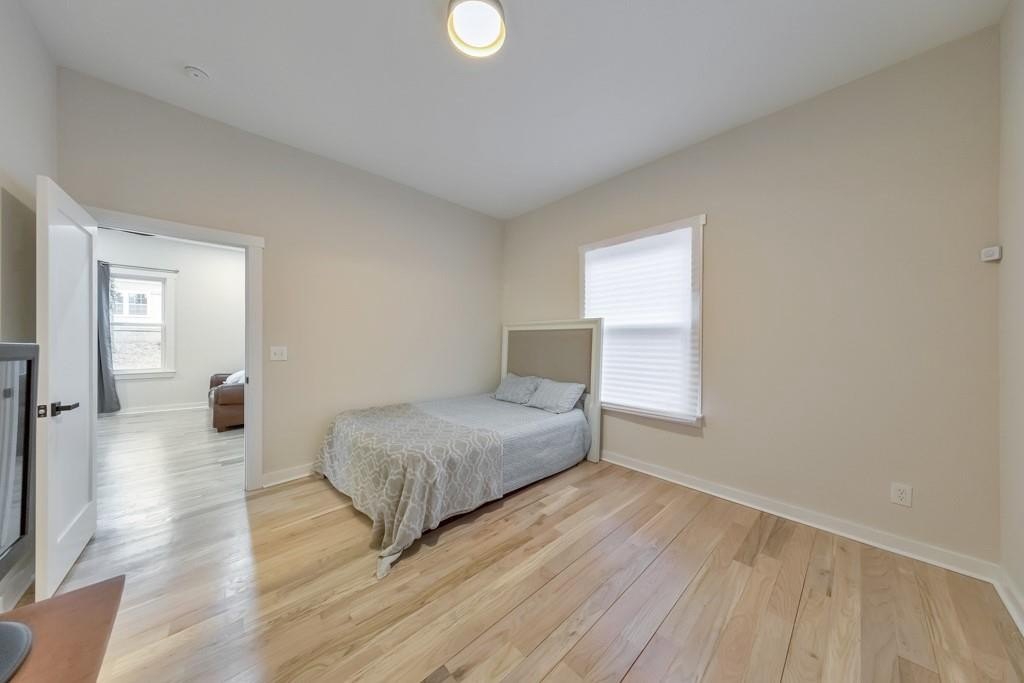 Welcome to this charming 3 bedroom, 2 bathroom cottage built in 1911, ideally located in the heart of historic East Point. Thoughtfully and beautifully remodeled, this home strikes the perfect balance between modern updates and preserved historic character, featuring 10-foot ceilings and solid oak hardwood floors throughout. A covered front porch invites you inside to the cozy living room, filled with warmth and timeless appeal. The modern kitchen is a true showstopper, offering a massive center island with seating for six, quartz countertops, floating shelves, abundant cabinet space, and a sunny breakfast area-perfect for everyday living and entertaining. The spacious primary suite includes a walk-in closet and a private ensuite bathroom with dual vanities and a walk-in shower. Two generously sized secondary bedrooms share a well-appointed hall bathroom featuring a walk-in shower and a separate soaking tub. Additional highlights include a separate laundry room, French doors leading to a floating patio in the side yard, and spacious front and back yards. A two-car parking pad adds convenience, while the prime location offers easy access to Downtown East Point, College Park, Hartsfield-Jackson International Airport, Downtown Atlanta, and major roadways-making this historic gem as practical as it is charming.