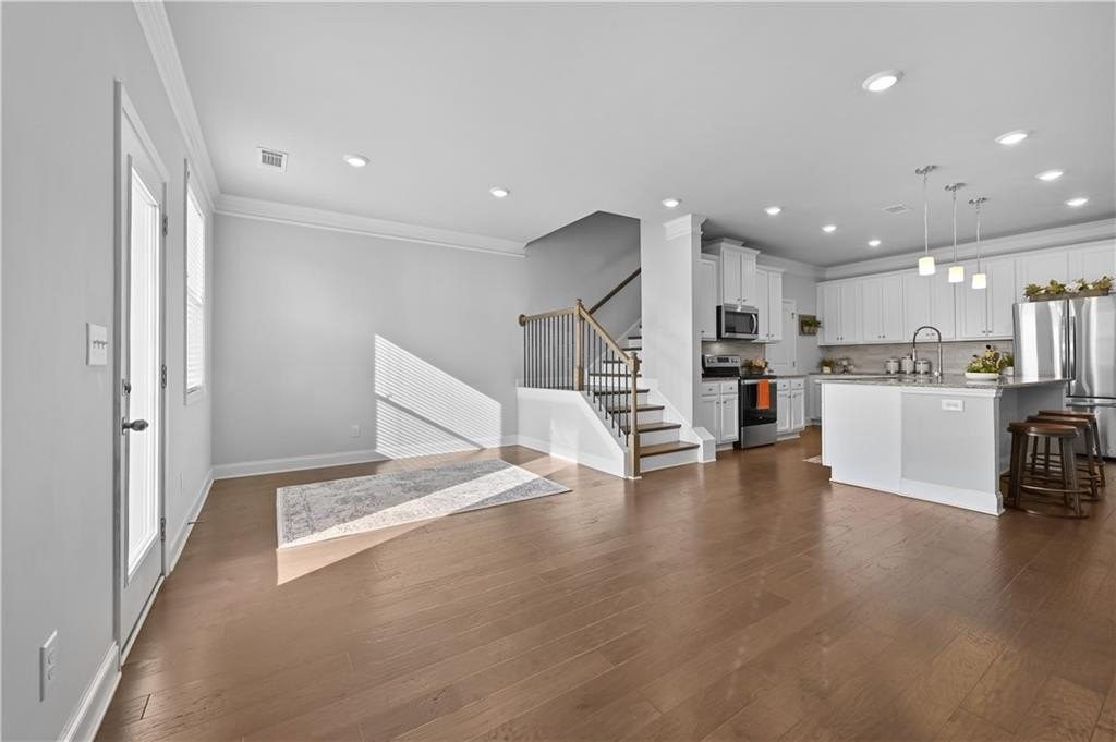 Welcome to a stunning modern townhome offering 3 bedrooms, 2.5 bathrooms, and a private 2-car garage, designed with both style and functionality in mind. The main level features beautiful hardwood floors and an open-concept layout connecting the great room, dining area, and a chef-inspired kitchen complete with white cabinetry, stainless-steel appliances, and a large center island with bar-stool seating-perfect for entertaining. Upstairs, all three bedrooms include walk-in closets, along with two full bathrooms and a dedicated laundry room for added convenience. Located just minutes from I-85 and GA-316, this home provides easy access to shopping, dining, and entertainment at Mall of Georgia, Costco, Publix, Target, and nearby restaurants like Minato Japanese, Chick-fil-A, and local favorites, making it an ideal blend of comfort, convenience, and modern living.