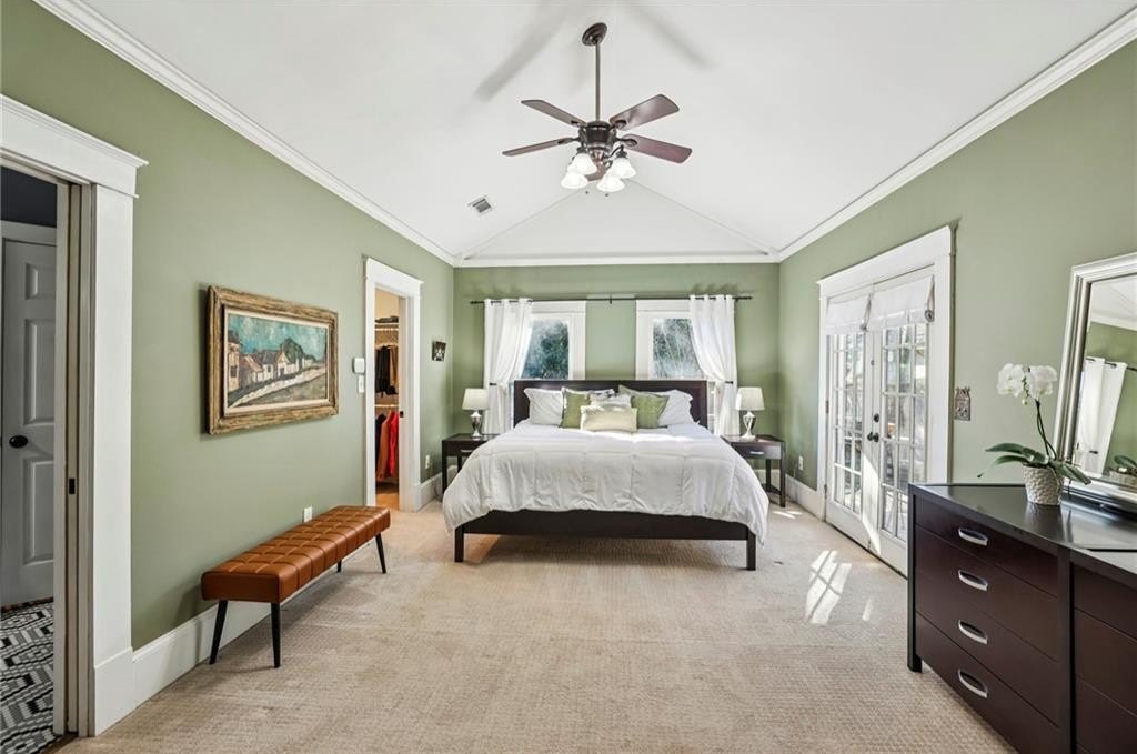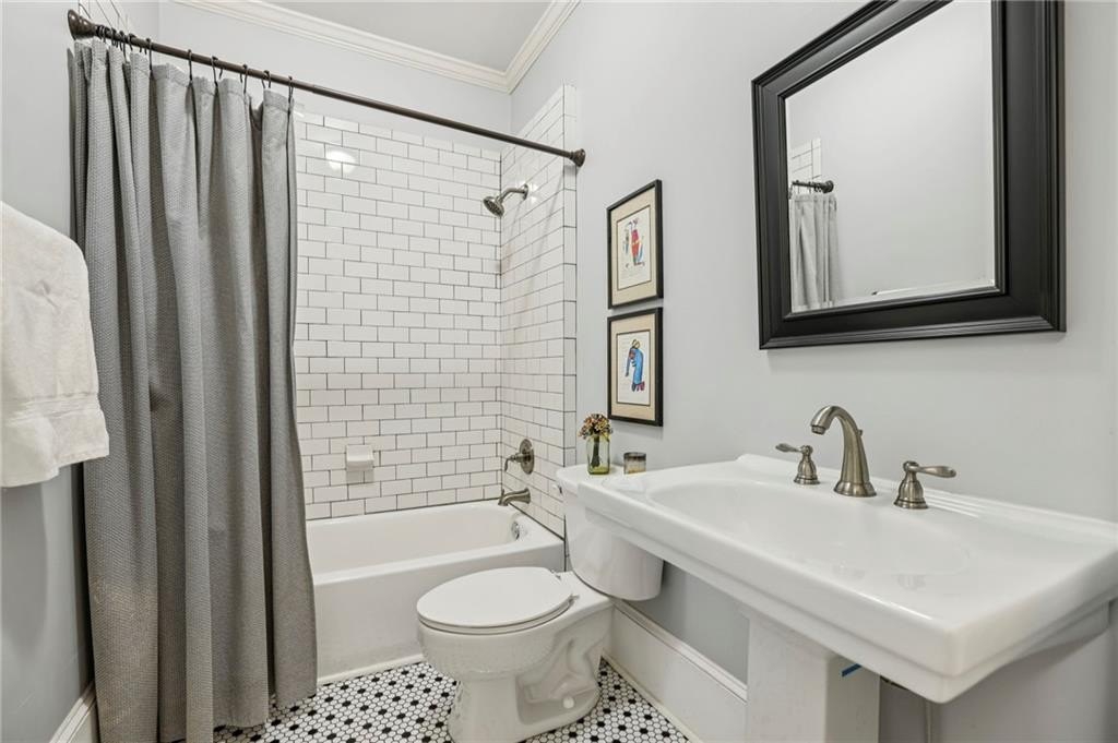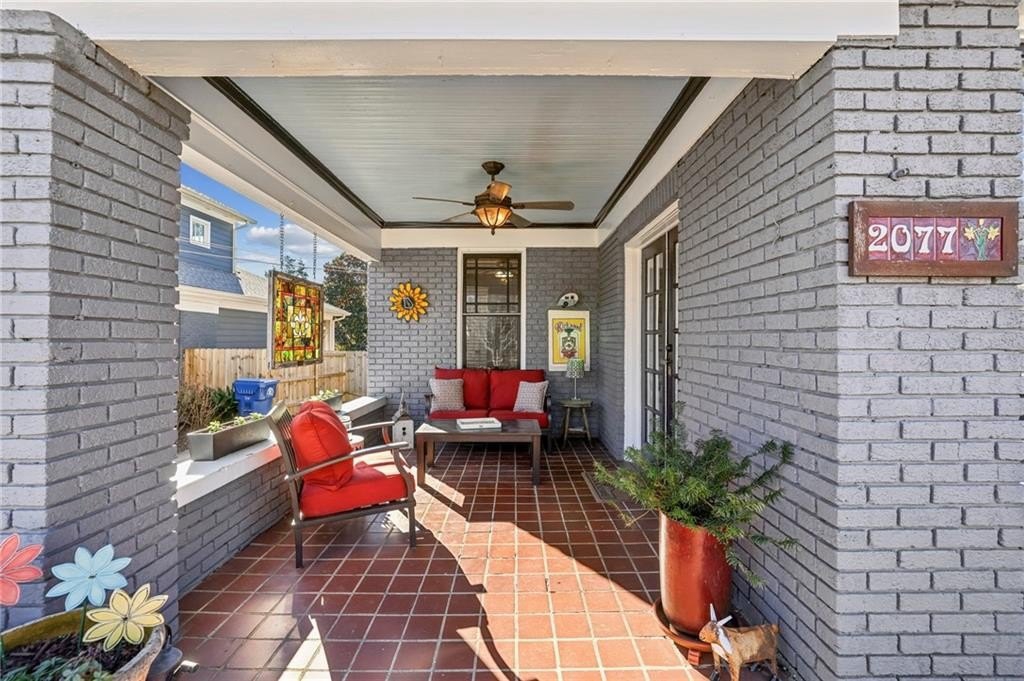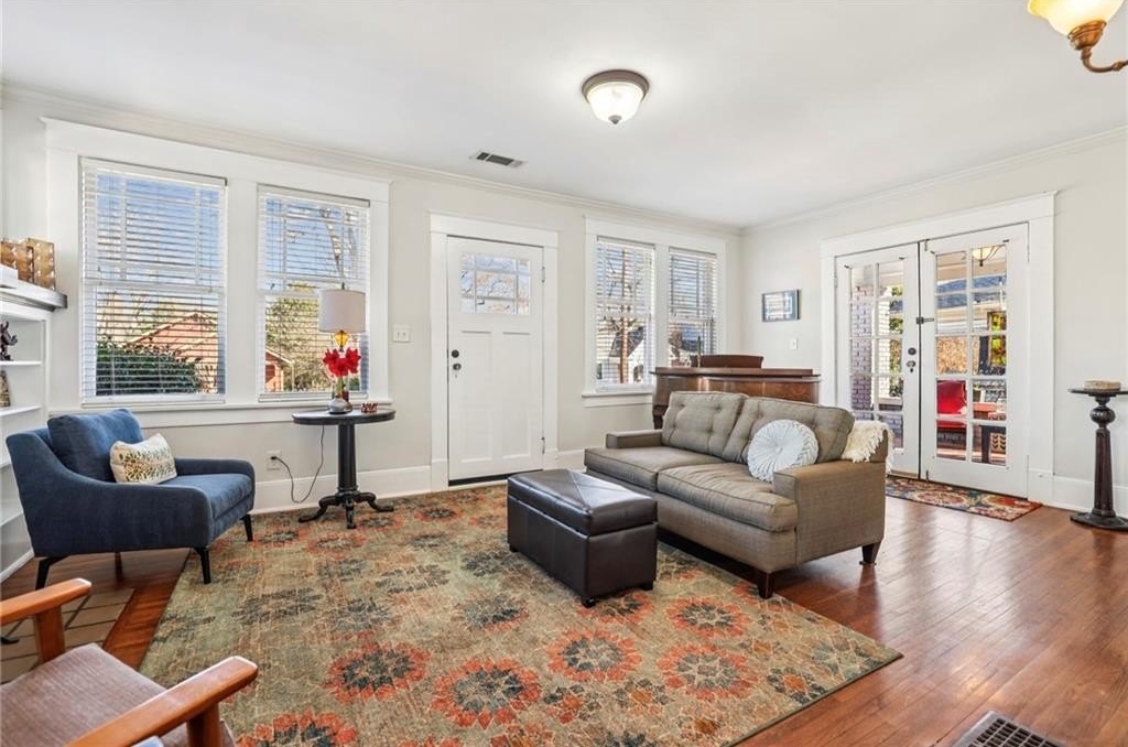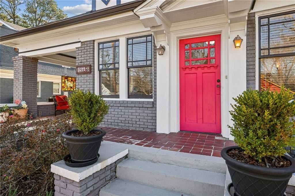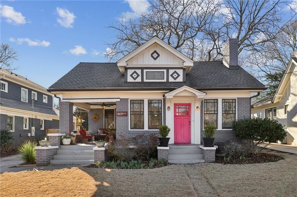 Porch-sitting charm included. This beautifully preserved 1930 brick bungalow sits in the heart of Kirkwood and blends classic Craftsman details and thoughtful period updates throughout. Painted a timeless medium gray, the exterior features decorative roofline sconces and a welcoming side porch entry-perfect for sipping tea and chatting with neighbors. The warmth and charm are immediately evident as you enter the home. A light-filled living room spanning the full width of the home and centered around a white brick fireplace flanked by built-ins and charming windows that set a timeless tone. The living room connects seamlessly to the dining area and kitchen through elegant French glass doors. Hardwood floors, crown molding, wide trim, and a statement chandelier anchor the dining space, while a raised breakfast bar opens to the kitchen. The kitchen offers abundant stained cabinetry, granite countertops, stainless steel appliances, a large pantry, and hexagon tile flooring. The main level boasts 10 ft ceilings and includes two secondary bedrooms-one with built-in shelving and a TV nook, the other generously sized with a walk-in closet-along with a beautifully updated hall bath featuring classic tile flooring and crisp white subway tile in the tub/shower. The oversized primary suite is a true retreat with vaulted ceilings, a walk-in closet, and French doors opening to the back patio. The primary bath features double vanities, a linen closet, tile floors, and an oversized subway-tiled shower with seating. Upstairs offers two additional bedrooms, and a full bath-ideal for guests, work-from-home space, or flexible living. Outside, enjoy a private, fenced backyard with mature landscaping and a cozy patio accessible from both the kitchen and primary suite. Location is everything and just 4 houses away from Bessie Branham Park, and a short walk to the library and all the restaurants, shops and gathering spots downtown Kirkwood has to offer. Classic, inviting, and full of character-this bungalow feels like home the moment you arrive.