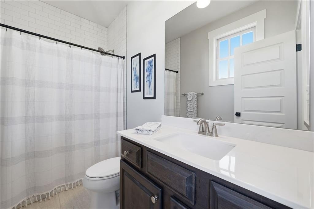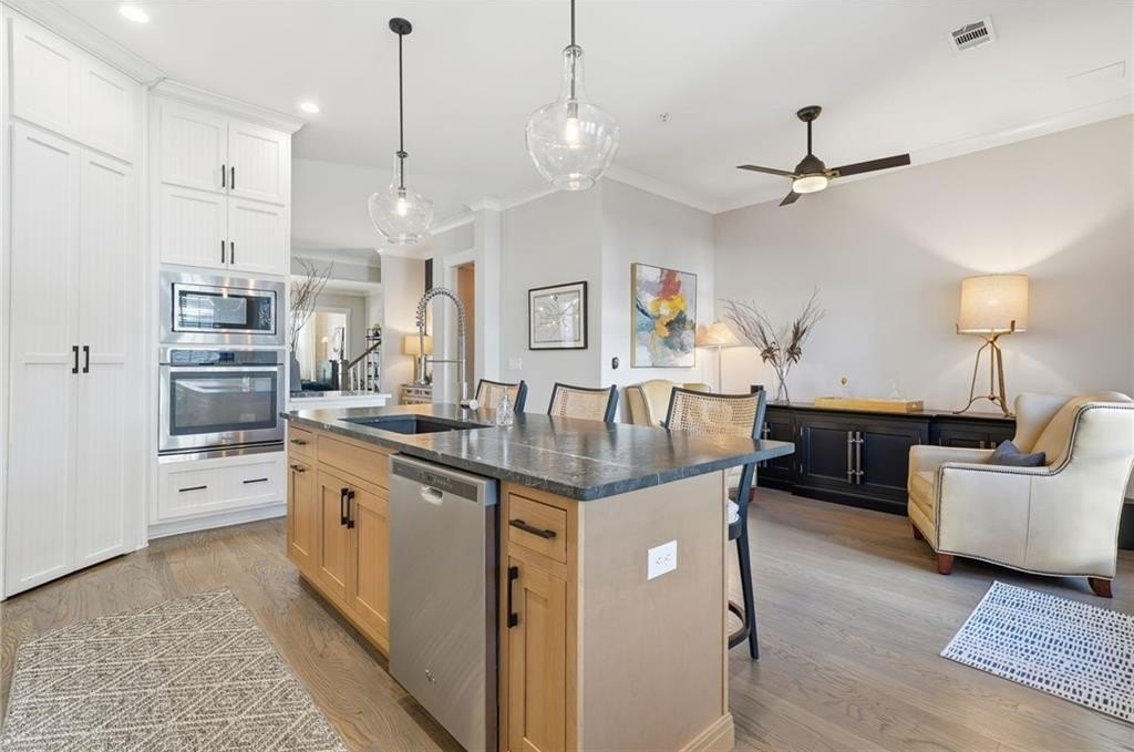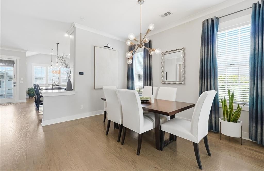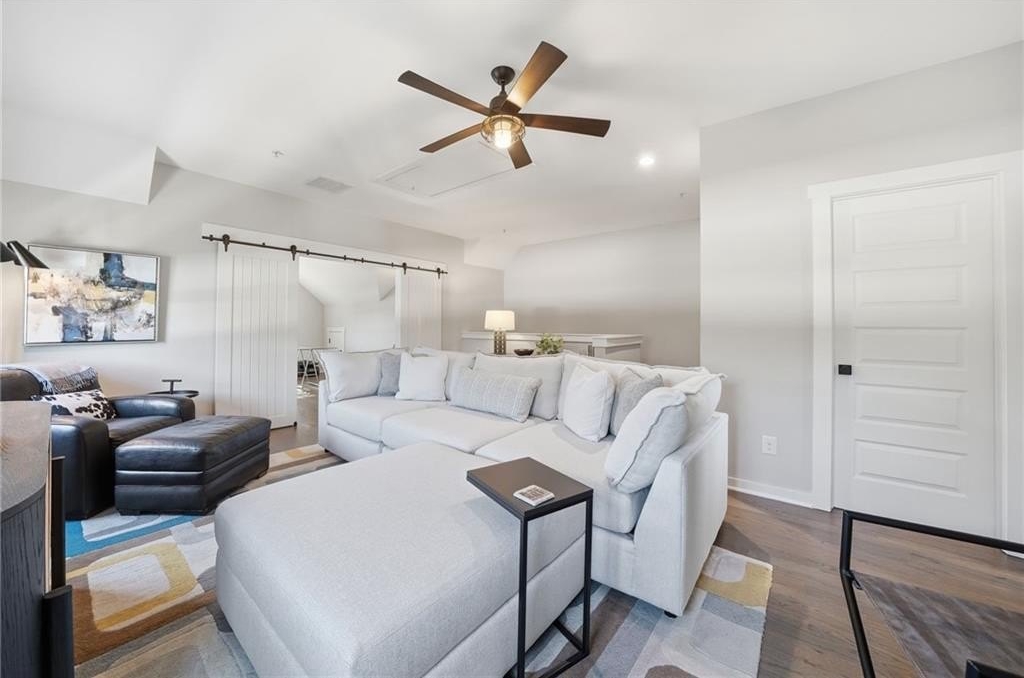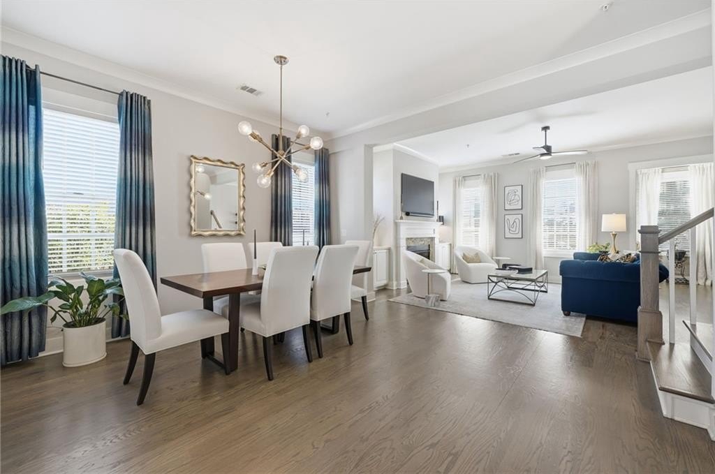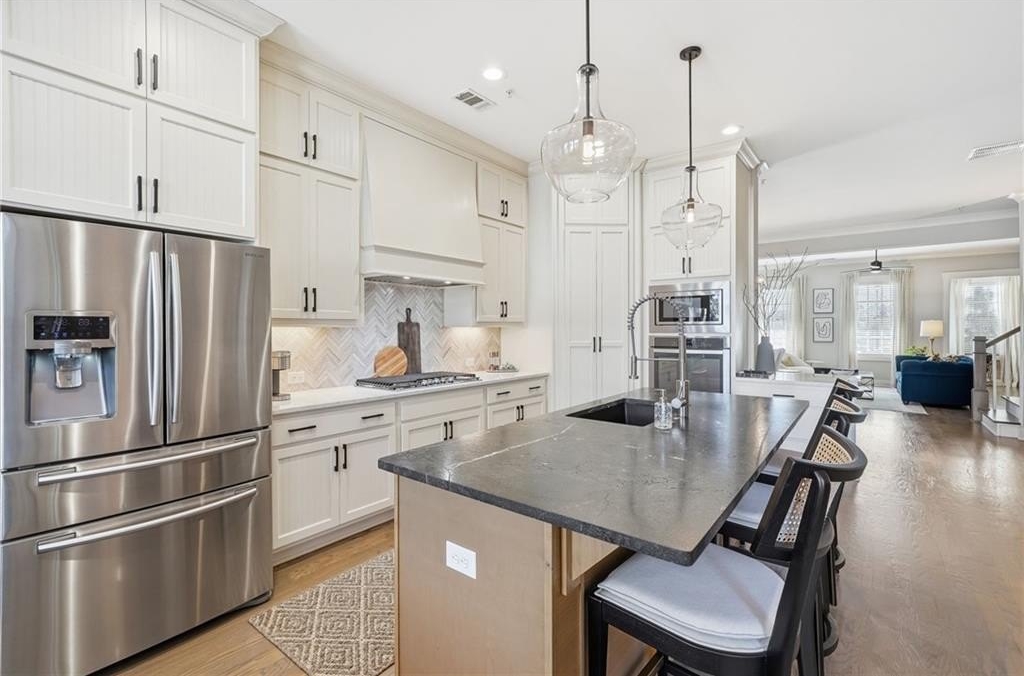 Gorgeous, move-in-ready end-unit townhome in Woodstock's best-selling and most sought-after community! The open main level includes a living area with gas fireplace and custom built-ins, spacious dining area, a functional yet beautiful kitchen, welcoming breakfast room, sitting/flex space, and powder room. Recent updates include a solid wood island topped with quartzite, updated lighting, refreshed door hardware, grass cloth-accented foyer, and a complete powder room makeover. Upstairs, the primary suite is a retreat of its own with dual vanities, soaking tub, tiled shower, and custom his-and-her closet systems. A second en-suite bedroom and a laundry room complete the second level. The third floor is a standout-ideal for a media room, guest suite, or multi-purpose flex space-offering a third en-suite bedroom and a private office or bonus room tucked behind stylish barn doors. An elevator pit is already in place for future convenience, offering long-term flexibility. Unlike other townhomes in the neighborhood, this home features a detached garage with gated access-a rare perk that adds security and includes a large storage area above. While located near a main road, the trade-off is unbeatable: a short, easy walk to vibrant Downtown Woodstock. Community amenities are extensive and social; you will love living here - the best of convenience, style, and lifestyle. Agent is related to seller.