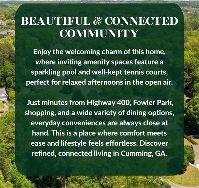 || CUL-DE-SAC LOT || HALF-ACRE SETTING || NEW GUTTERS + LEAF GUARDS || LIFETIME HVAC WARRANTY || BIG CREEK GREENWAY ACCESS || COMMUNITY POOL + TENNIS || NO RENT RESTRICTIONS || Tucked at the end of a quiet cul-de-sac, this well-maintained home delivers privacy, walkability, and long-term confidence in one of Cumming's most connected locations. The main level offers an easy, open flow designed for everyday living and comfortable entertaining, with HARDWOOD FLOORS, a separate dining room with bay window, and a family room that connects naturally to the kitchen and breakfast space. The kitchen features sleek dark GRANITE COUNTERS, stainless steel appliances, a center island, and clear sightlines to the family room, with direct access to the back deck. Upstairs, the primary suite feels spacious and composed, with a tray ceiling, WALK-IN CLOSET, double vanity, soaking tub, and separate shower, while a partly finished basement with bath stub provides storage now and real room to grow later. Life here extends outdoors. The back deck looks out to wooded views and a PRIVATE YARD where kids and grandkids can play freely, while mornings and evenings are framed by quiet and tree cover rather than rooftops. Just minutes away, BIG CREEK GREENWAY access at Fowler Park connects you to miles of walking, running, and cycling trails, plus tennis courts, athletic fields, dog parks, and open green space-making daily movement and outdoor time part of your routine, not a weekend plan. This home shows clear pride of ownership. Updates include fresh exterior and deck paint, a new hot water heater, new gutters with leaf guards, professionally cleaned roof and carpets, a whole-home water filtration system, and active termite protection with annual inspections. The HVAC systems are covered by a transferable LIFETIME PARTS-AND-LABOR MAINTENANCE CONTRACT with twice-yearly service. A NEGOTIABLE HOME WARRANTY adds an extra layer of security. Community amenities include pool, tennis, and pickleball with a low $440/year HOA and NO RENT RESTRICTIONS-ideal for families or investors alike. Convenient to GA 400, Northside Forsyth Hospital, shopping, dining, and LAKE LANIER within 15 minutes, this location balances nature access with everyday ease. Homes offering this level of privacy, trail access, and mechanical peace of mind are increasingly rare. Schedule your showing to experience the WOODED SETTING, GREENWAY CONNECTION, and lifestyle that only comes together in person.