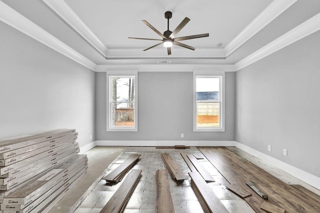 NEW CONSTRUCTION!! MOVE IN READY!! FINAL OPPORTUNITIES! Master on Main plus extra bedroom on main! Fabulous New Construction with Modern Farmhouse touches throughout. Quiet enclave of 17 new construction "Master on Main" homes in City of Holly Springs. Opening the front door you are greeted by a spacious, open floorplan with thoughtful design and warm, wood flooring. The designer kitchen features Quartz countertops, custom cabinetry, large breakfast island, Upgraded Stainless steel appliances, including double ovens, gas cooktop, custom vent-hood, in-island microwave and custom cabinetry. The vaulted family room with coffered ceilings is adjacent to the kitchen and leads to the covered rear porch. Master on main is spacious and features a luxurious, spa-like Owner's bath with custom cabinetry, zero-entry shower and walk in closet. Additional bedroom on the main could be used as guest bedroom or home office. Upstairs find two additional bedrooms and full bath. Enjoy morning or afternoon time on your covered front or reach porches. Dedicated natural gas hookup for grill or firepit on the rear porch. Homes feature all No-Rot HardiPlank construction on exterior siding and trim, irrigation system, TiffTuff shade tolerant Bermuda sod.