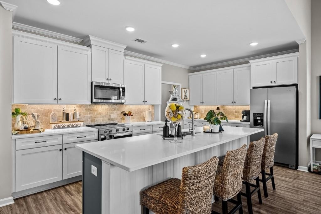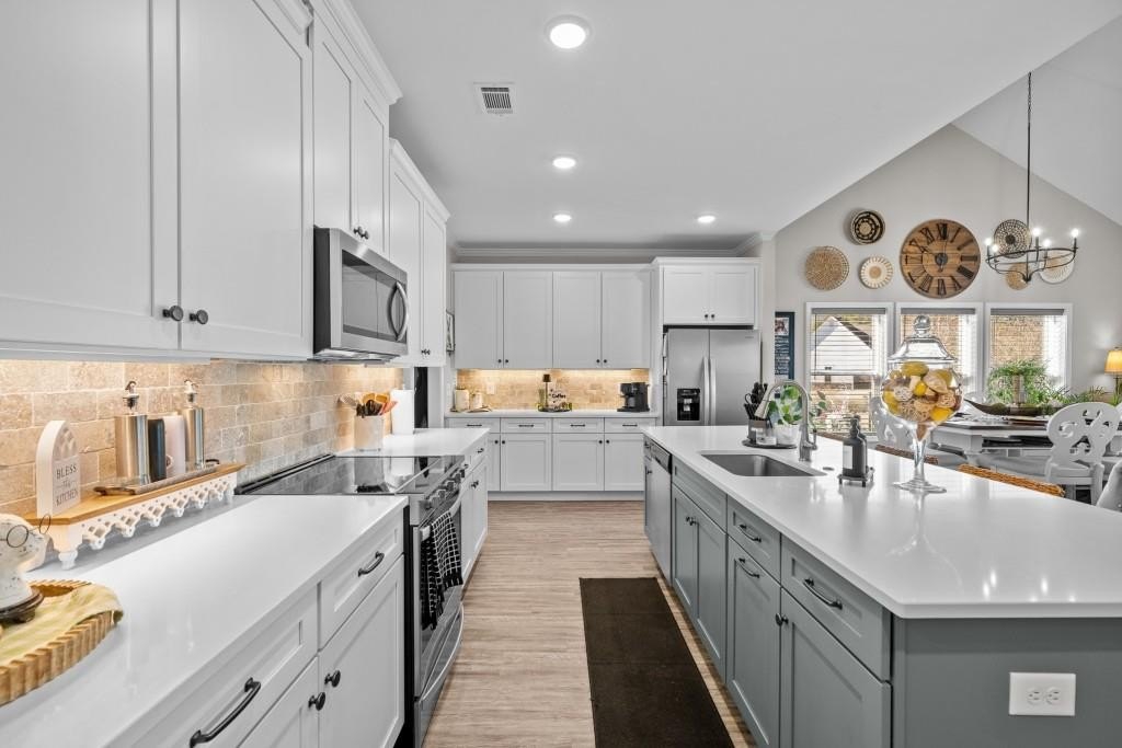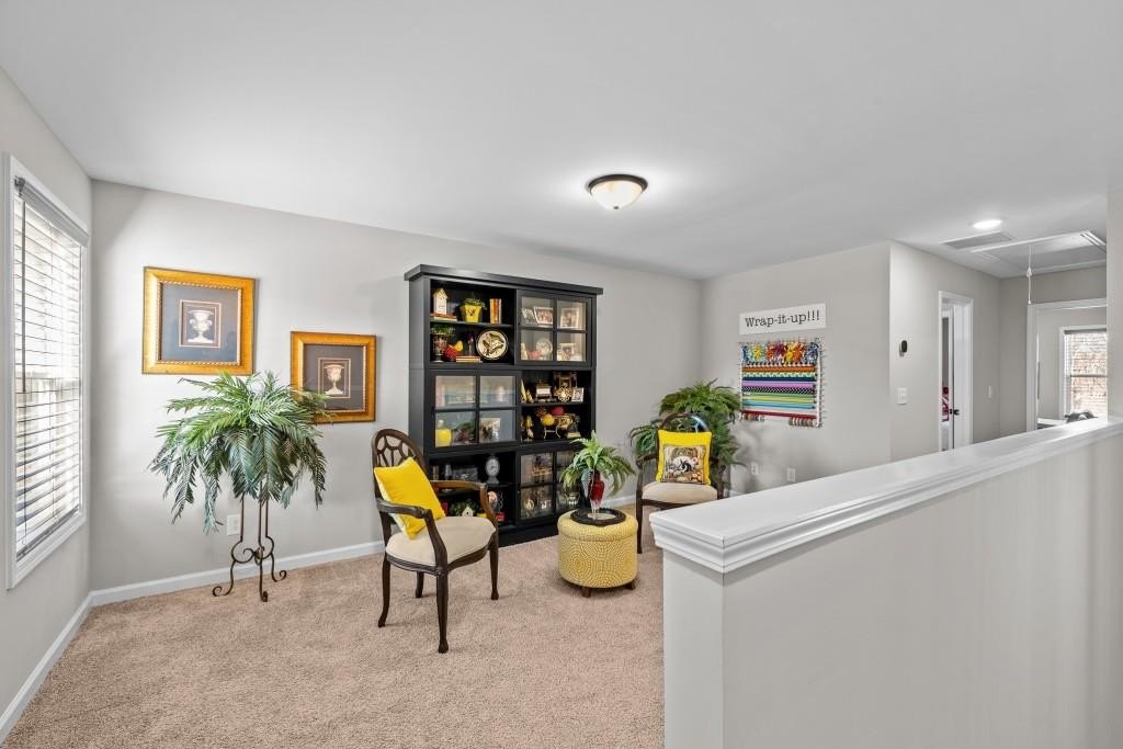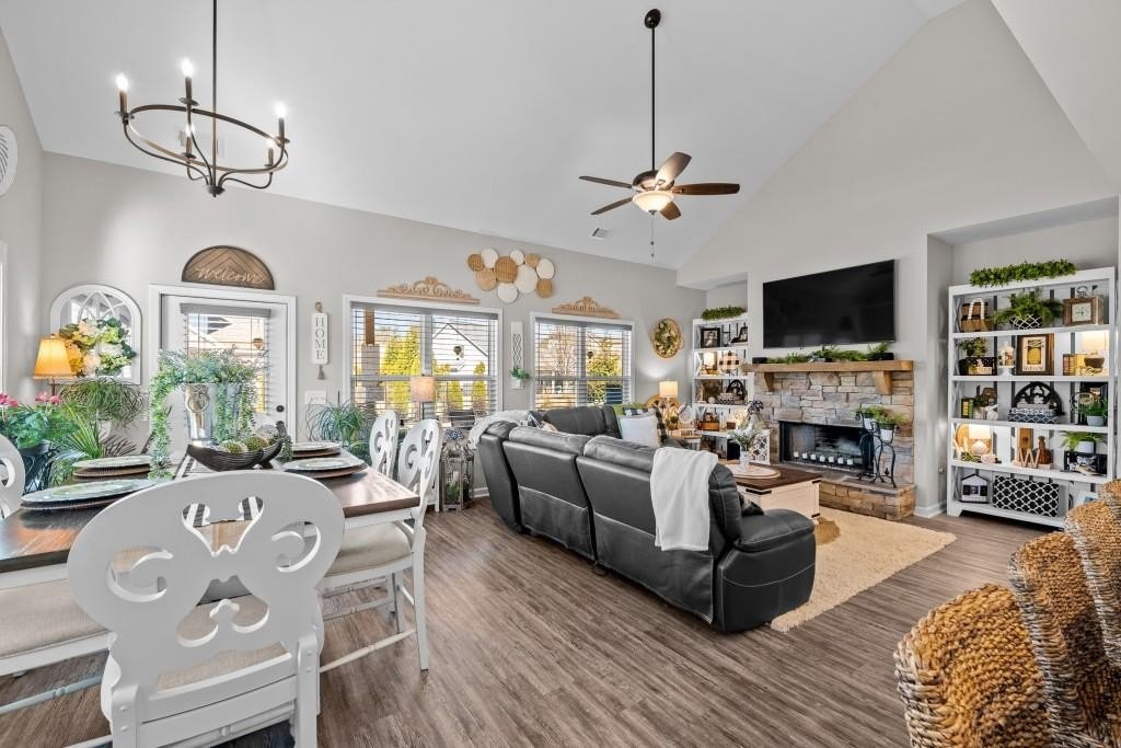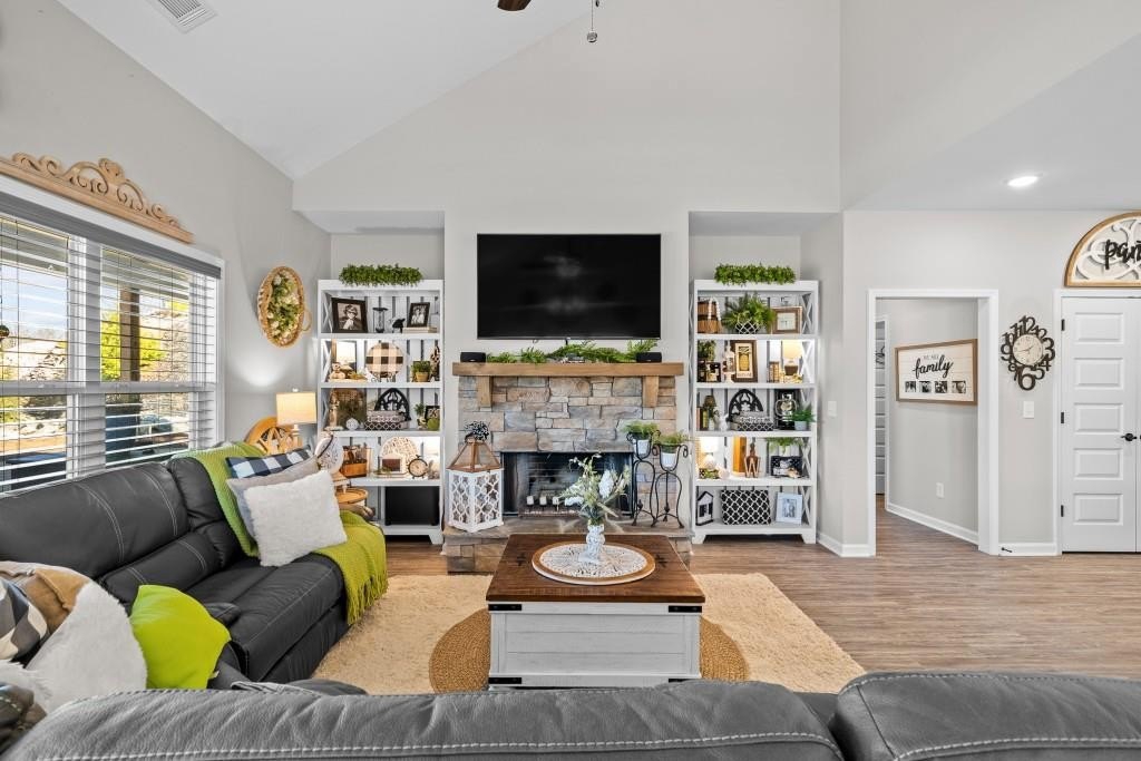 Welcome home to this beautifully built Craftsman-style residence, perfectly positioned on a quiet cul-de-sac with mountain views and within walking distance of the golf course and clubhouse in the sought-after Lake Arrowhead community. From the moment you arrive, the setting invites you to slow down and enjoy the lifestyle this gated community is known for. Step inside to a welcoming foyer, where a hall closet provides convenient storage. Just off the entry is a main-level bedroom and full bathroom, ideal for guests, a teen suite, or in-law living. As you move forward, the home opens into a bright and airy open concept living space, anchored by a spacious kitchen designed for both everyday living and entertaining. The kitchen features quartz countertops, under-cabinet lighting, an oversized island with the sink, and is pre-wired for pendant lighting. A separate food pantry offers excellent storage, and the flow into the dining and family areas keeps everyone connected. The primary suite on the main level is thoughtfully placed near the laundry room for added convenience. The primary bathroom offers an oversized shower, a private toilet room with a built-in jewelry/necklace holder behind the door, and a well-designed walk-in closet with shoe shelving and hanging storage. Matte black fixtures throughout the home add a modern, cohesive touch. Off the kitchen and leading toward the garage is a practical mudroom/drop zone, perfect for daily comings and goings. Step outside to the back patio to enjoy a wood-burning outdoor fireplace with built-in shelving, creating a cozy space for relaxing or entertaining, while nearby plant window boxes add charm to the outdoor setting. Upstairs, you'll find a versatile loft area that leads to two additional bedrooms, one full bathroom, a closet large enough to step into, and an additional partially finished room with built-in shelves currently being used for storage. One of the two upstairs bedrooms features corner windows with mountain views and is currently being used as an office but could easily serve as a bedroom. The other bedroom features a large walk-in closet and attic access for additional storage, while the full bathroom is conveniently accessible from the loft. Located in Lake Arrowhead, residents enjoy access to hiking trails, the lake and marina, pickleball and tennis courts, Red Cloud Park, a dog park, Highlands Golf Course, clubhouse amenities, and a full calendar of social activities. Whether you're looking for a full-time residence or a mountain retreat, this home offers comfort, quality construction, and a true lifestyle experience