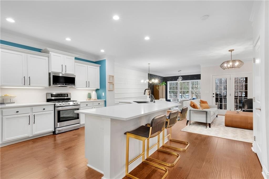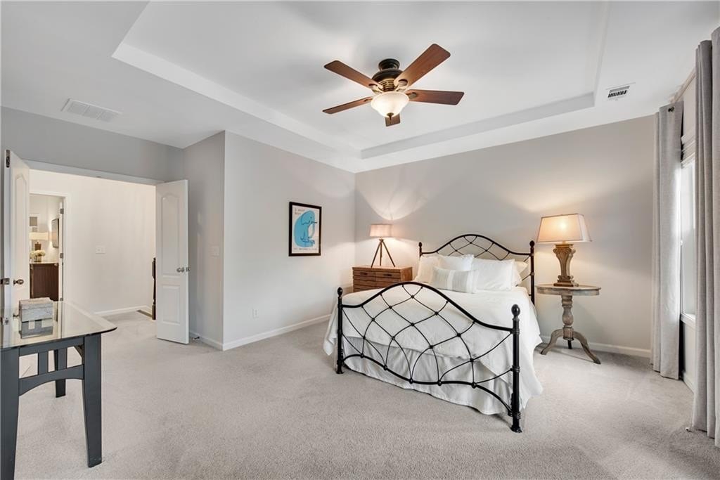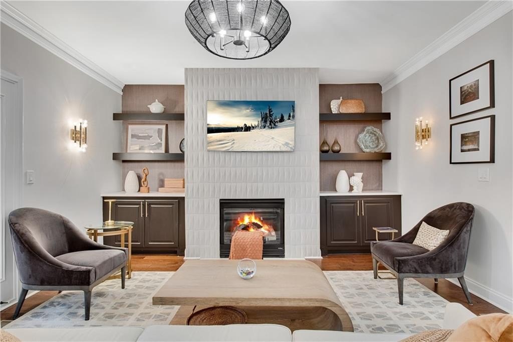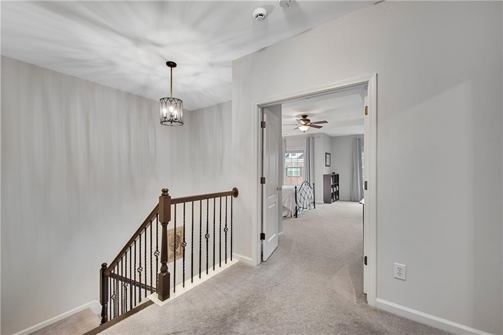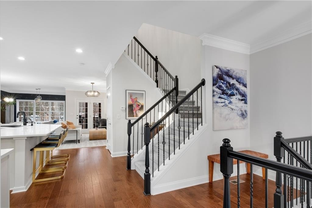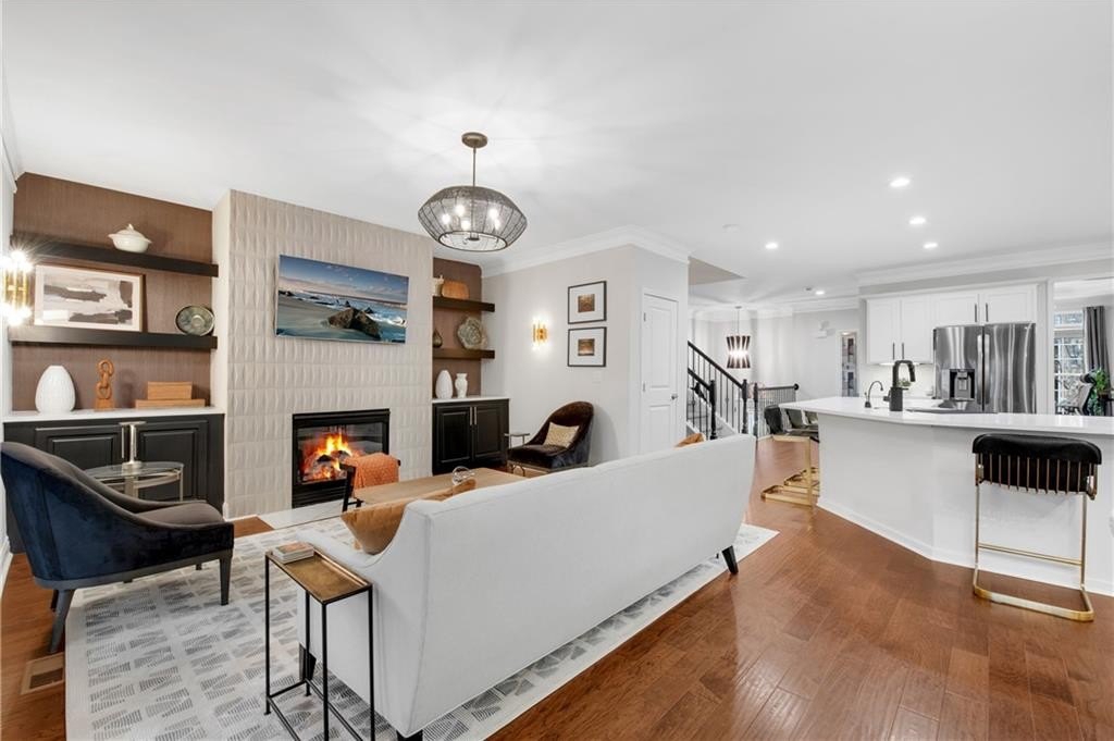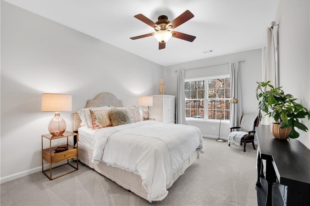 DESIGNER RETREAT IN CONVENIENT NEIGHBORHOOD near every major hub in Alpharetta. Step into modern elegance and discover this beautifully renovated townhome featuring a sophisticated interior and premium, on trend finishes. The open concept main level renovation offers 5" hand scraped hardwood floors, a bright new kitchen, elegant lighting and specialty trim. Designer kitchen showcases quartz counters and a matching quartz backsplash, black granite sink, large island with seating, instant hot water dispenser, stainless steel appliances and opens to a breakfast room with a stunning feature wall. The keeping room, featuring custom, hand painted walls, is the perfect lounge to enjoy your evening cocktails. Fireside family room has beautiful tile surround, custom built ins with matching quartz counters, floating shelves and a french door to the inviting screened porch overlooking the wooded back yard. Spacious dining room with trey ceiling can also be used as a study or additional sunny, relaxing space. The stylish powder room with designer wall coverings, quartz counters and chic gold fixtures complements the main floor's sophisticated design. The upper level boasts two master suites separated by the laundry room and storage for separation and privacy. The primary master suite features a trey ceiling, separate sitting area with views of the lush, private back yard and ceiling fan. The en-suite bathroom boasts a large soaking tub, dual vanities and a separate shower along with a custom closet. The laundry room provides ample storage with extra cabinets and generous hanging space. The terrace level can serve as a separate suite, with large bedroom, walk-in closet and family room that can be used as a media room, rec room, gym or office with a patio to enjoy the wooded landscape. One of the largest floor plans in the community. LAKE DEERFIELD offers a maintenance free lifestyle, community pool & lakeside amenities. It is less than ten minutes to Avalon, Downtown Alpharetta, Halcyon - making it easy to satiate your desire for shopping, dining and entertainment. It is only 5 minutes to 400 - exit 11 and the new McGinnis Ferry exit, everything is within reach! *NO RENTAL RESTRICTIONS*