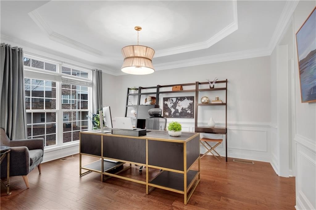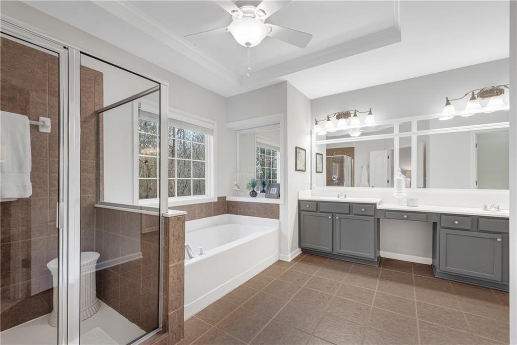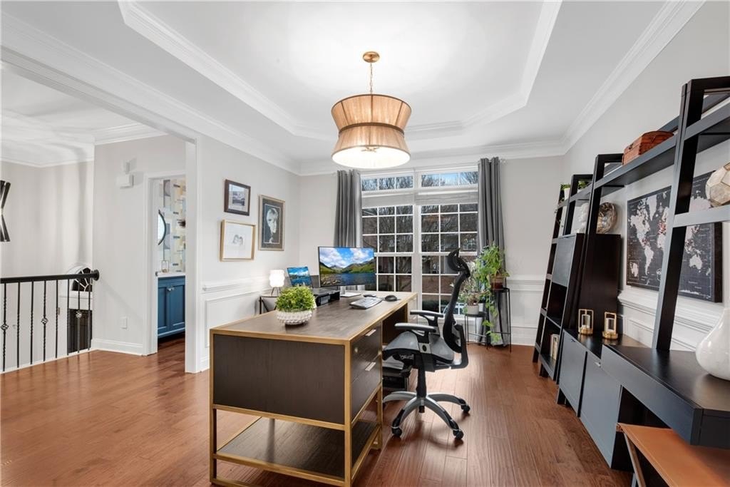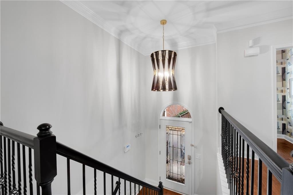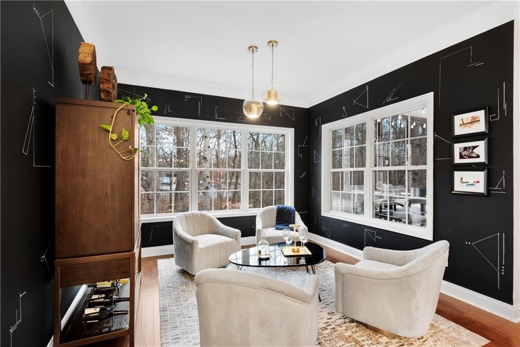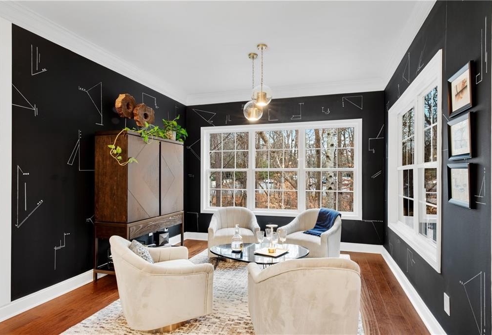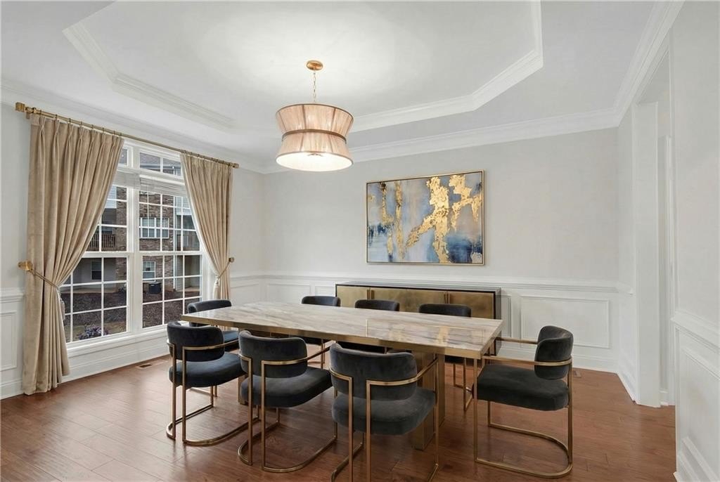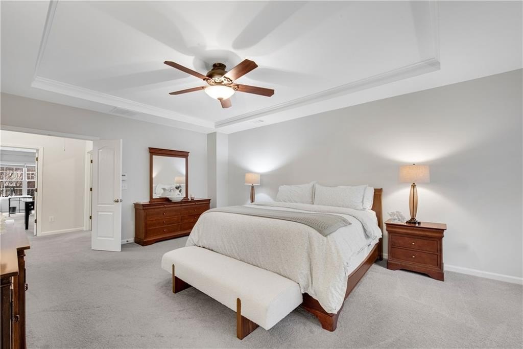 DESIGNER RETREAT IN CONVENIENT NEIGHBORHOOD near every major hub in Alpharetta. Step into modern elegance and discover this beautifully renovated townhome featuring a sophisticated interior and premium, on trend finishes. The open concept main level renovation offers 5" hand scraped hardwood floors, a bright new kitchen, elegant lighting and specialty trim. Designer kitchen showcases quartz counters and a matching quartz backsplash, black granite sink, large island with seating, instant hot water dispenser, stainless steel appliances and opens to a breakfast room with a stunning feature wall. The keeping room, featuring custom, hand painted walls, is the perfect lounge to enjoy your evening cocktails. Fireside family room has beautiful tile surround, custom built ins with matching quartz counters, floating shelves and a french door to the inviting screened porch overlooking the wooded back yard. Spacious dining room with trey ceiling can also be used as a study or additional sunny, relaxing space. The stylish powder room with designer wall coverings, quartz counters and chic gold fixtures complements the main floor's sophisticated design. The upper level boasts two master suites separated by the laundry room and storage for separation and privacy. The primary master suite features a trey ceiling, separate sitting area with views of the lush, private back yard and ceiling fan. The en-suite bathroom boasts a large soaking tub, dual vanities and a separate shower along with a custom closet. The laundry room provides ample storage with extra cabinets and generous hanging space. The terrace level can serve as a separate suite, with large bedroom, walk-in closet and family room that can be used as a media room, rec room, gym or office with a patio to enjoy the wooded landscape. One of the largest floor plans in the community. LAKE DEERFIELD offers a maintenance free lifestyle, community pool & lakeside amenities. It is less than ten minutes to Avalon, Downtown Alpharetta, Halcyon - making it easy to satiate your desire for shopping, dining and entertainment. It is only 5 minutes to 400 - exit 11 and the new McGinnis Ferry exit, everything is within reach! *NO RENTAL RESTRICTIONS*