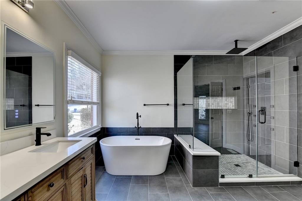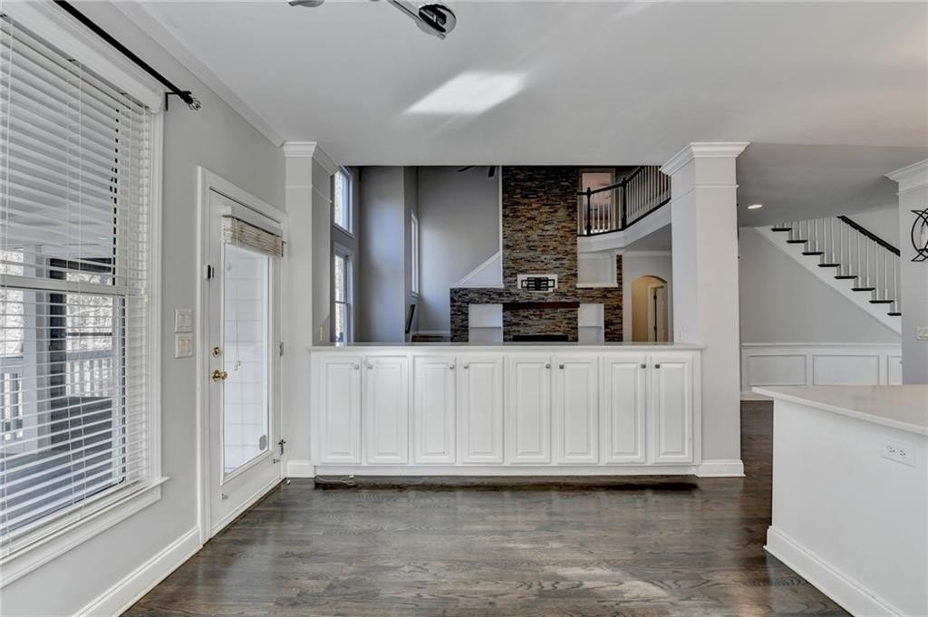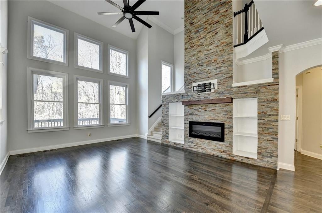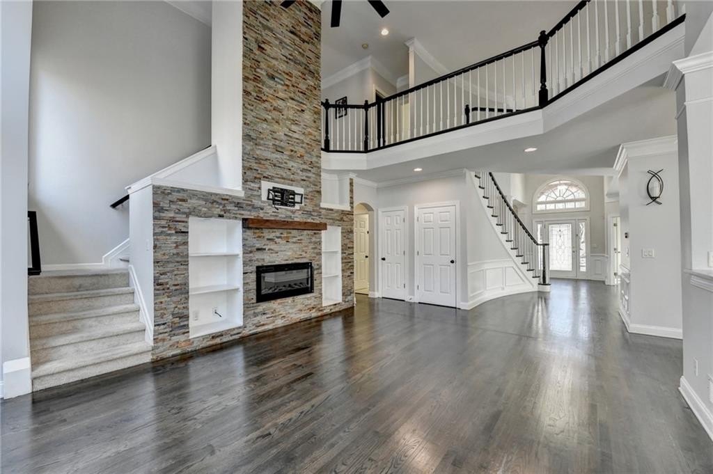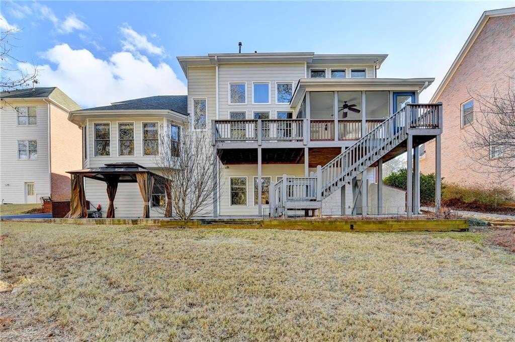 Sought after prestigious WINDWARD COMMUNITY, MASTER ON MAIN, upgraded, meticulously maintained 7-bedroom, 4.5-bath home on a cul-de-sac in Alpharetta. The primary suite on the main level offers a spacious retreat with double vanities, separate shower, soaking tub with custom tile, and a large walk-in custom closet. Neutral interior colors, gleaming hardwood floors, and thoughtful upgrades throughout reflect pride of ownership. A welcoming two-story foyer opens to a formal living room and home office and a separate formal dining room, ideal for entertaining. The family room features soaring ceilings, a wall of windows providing abundant natural light and a fireplace. The gourmet kitchen includes custom cabinetry, stainless steel appliances, cooktop, quartz countertops, a large center island, and views to the covered deck and level, wooded, useable backyard with an extended patio. The second level offers five generously sized bedrooms and two full bathrooms. The finished terrace level includes a bedroom and full bath, along with flexible space ideal for a media room, gym, study, or recreation area. Enjoy a private, wooded backyard offering a peaceful outdoor setting. Windward residents enjoy access to Lake Windward for boating and fishing, the Sports Park, and the optional Windward Lake Club with swim and tennis amenities. Conveniently located near top-rated ALPHARETTA HIGH & WEBB BRIDGE MIDDLE, The Greenway, LIFETIME FITNESS, Avalon, Halcyon, NEW TRADER JOE'S, Alpharetta City Center, dining, shopping, and GA-400. NEW UPDATED KITCHEN! UPDATED MASTER BATH, POWDER ROOM AND GUEST BATH!!! NEW ROOF(2021)! NEW LIGHT FIXTURES! FRESHLY REFINISHED FLOORS! CHANGED CARPET TO LVP FLOORS UPSTAIRS.