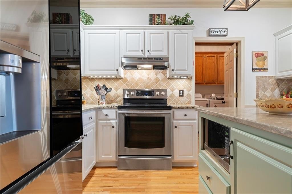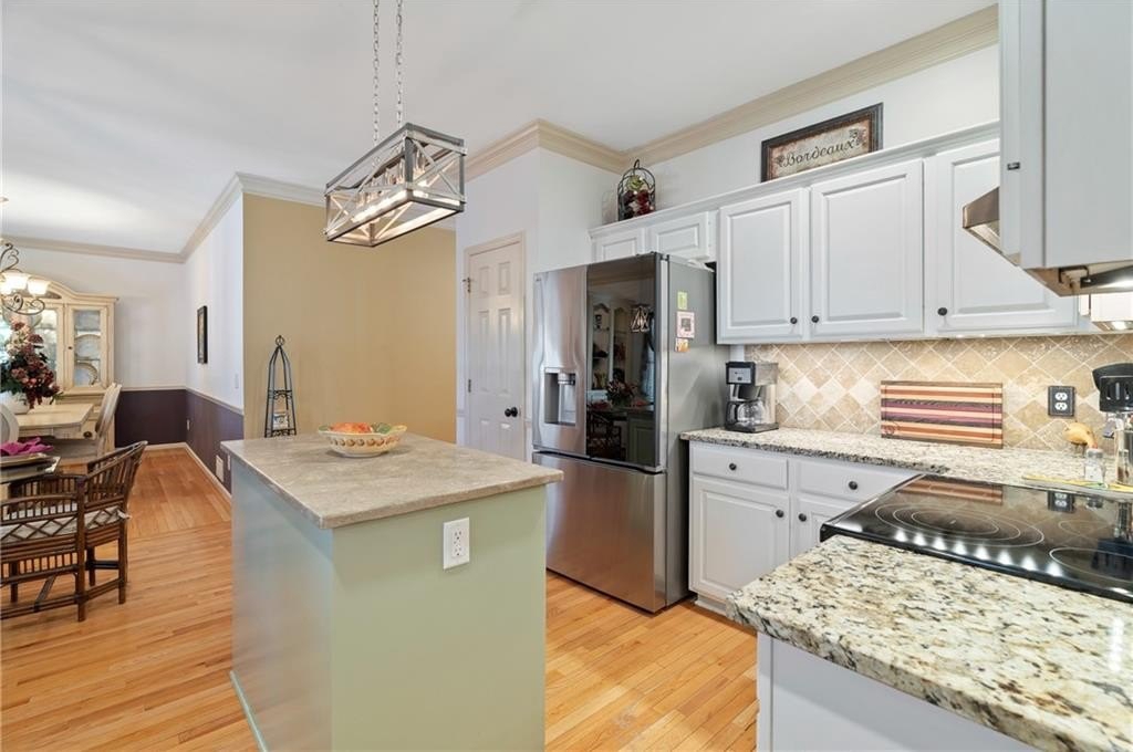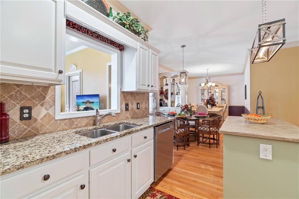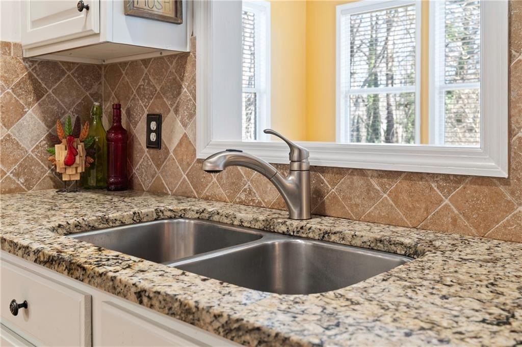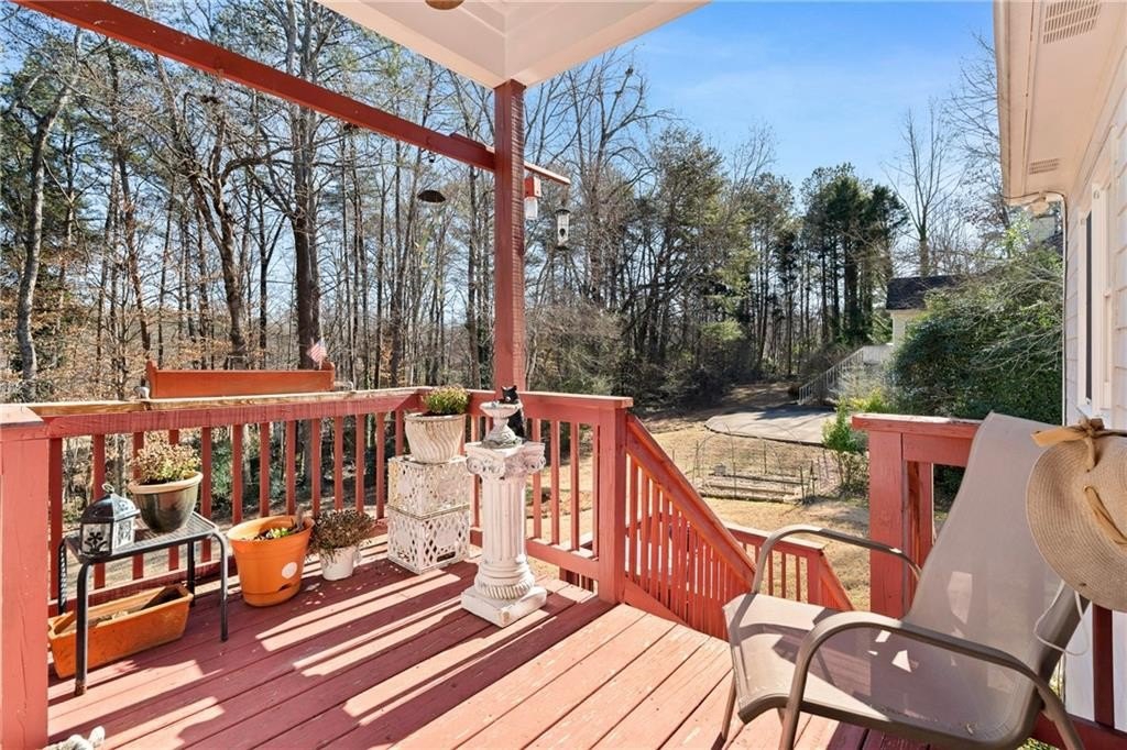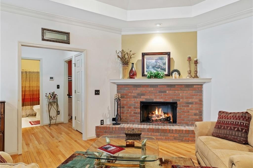 Beautifully maintained 4-bedroom, 3-bath brick-front home nestled on a private, wooded 0.59-acre lot. A welcoming front porch leads into a bright, open interior featuring gleaming hardwood floors throughout the home, tray ceilings, and abundant natural light throughout. The living room is anchored by a charming brick fireplace, creating a warm and inviting gathering space. The well-appointed kitchen offers white cabinetry, stone countertops, stainless steel appliances, and a sunny eat-in area, perfectly suited for everyday living and entertaining. There is a separate dining room area perfect for hosting large gatherings. There is additional sunroom that provides flexible spaces for hosting, working from home, or relaxing. The primary suite is conveniently located on the main level and features a private sitting area, spa-like en suite bath with dual vanities, a soaking tub, separate shower, and a spacious walk-in closet. There are also 2 spacious secondary bedrooms on the main level. The basement offers a private in-law suite featuring a kitchenette, full bath and media room that could be converted to another bedroom! Step outside to enjoy the back deck overlooking a large, flat backyard surrounded by mature trees and beautiful landscaping. With established green space, raised vegetable garden, blueberry bushes, fig tree, and exceptional privacy, this backyard is ideal for outdoor living, entertaining, or simply unwinding in nature. This home seamlessly blends comfort, functionality, and serene outdoor living on over half an acre. This exceptional property offers the perfect combination of timeless charm, thoughtful living spaces, and a peaceful, private setting-an ideal place to call home.
