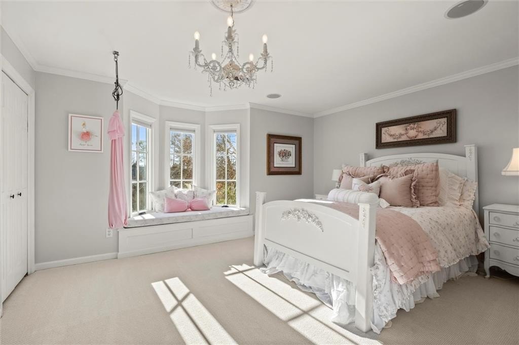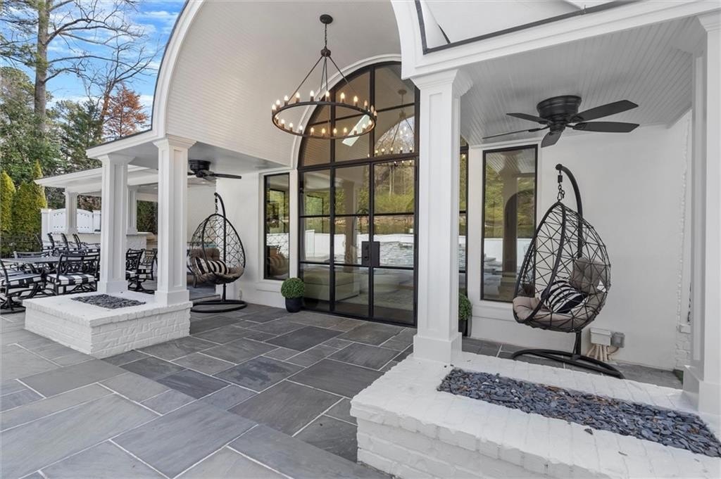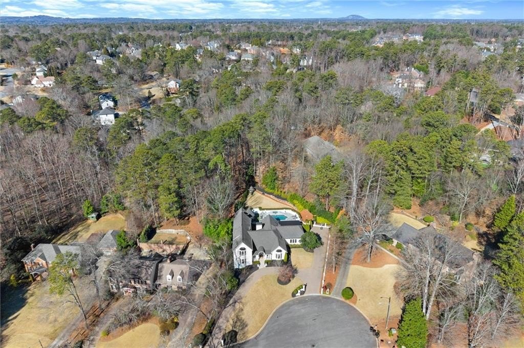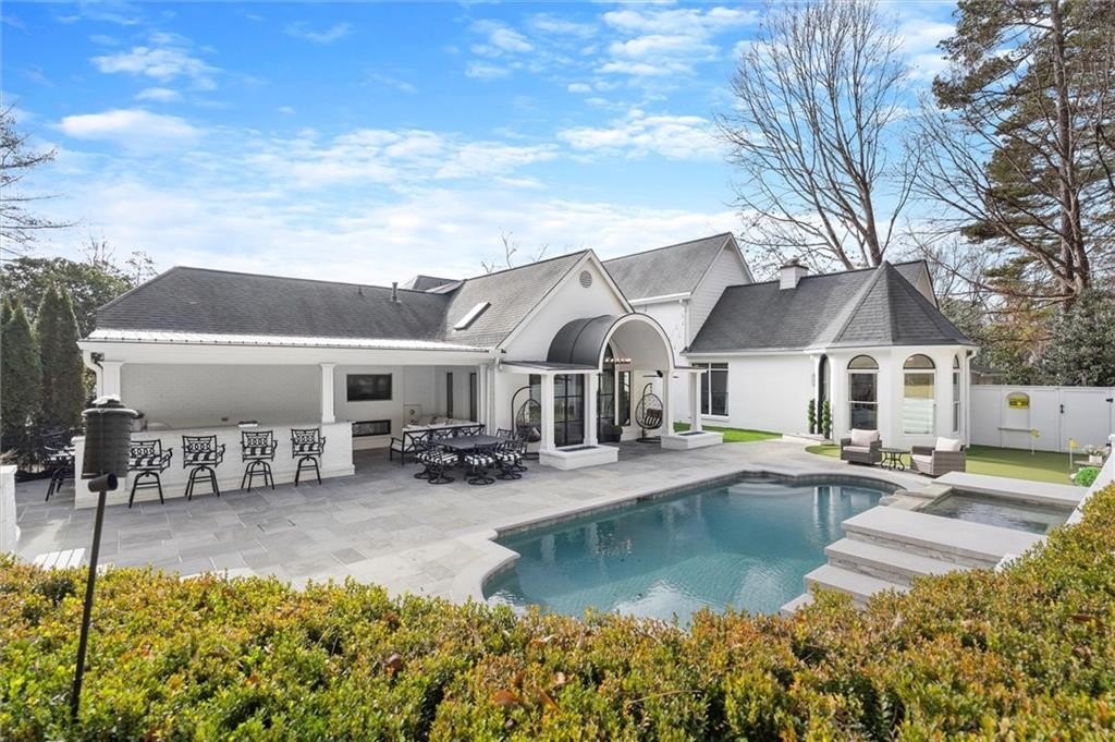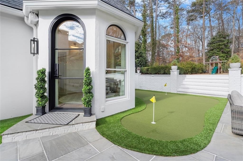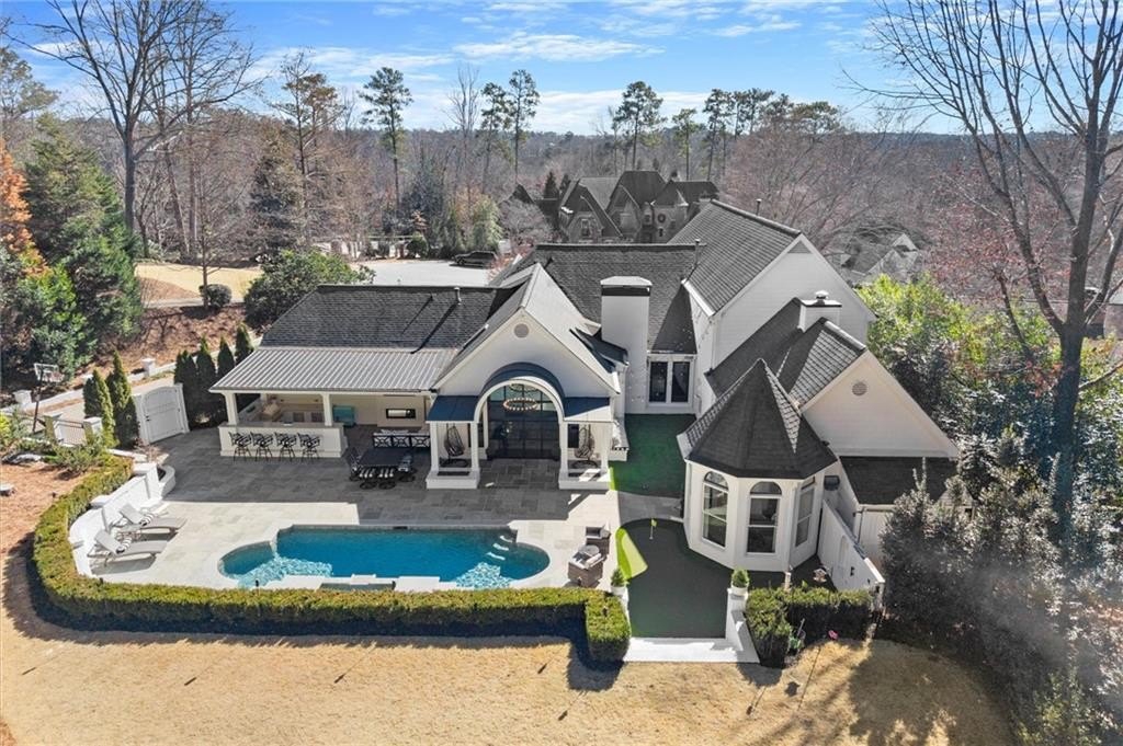Tucked away on a quiet cul-de-sac in the prestigious Atlanta Country Club community and located within Cobb County's top-rated school district, this custom-designed, all-brick residence (stucco on top) is a true entertainer's retreat. Thoughtfully positioned on a beautifully landscaped half-acre+ flat lot, the home offers exceptional privacy, generous separation from neighboring properties, and a rare sense of both exclusivity and community. The resort-style backyard renovation is nothing short of spectacular. Designed for year-round enjoyment, it features a walkout level saltwater, heated pool and spa with WiFi-controlled, multicolored lighting and flagstone decking, a private putting green, an expansive outdoor kitchen and grilling area, and plenty of flat, grassy space-all fully fenced and surrounded by lush landscaping for total seclusion. Whole-home audio with four independent outdoor zones completes this exceptional outdoor living experience. A circular paver driveway and ample parking provide ease for everyday living and effortless entertaining. Inside, the home showcases solid construction and timeless design, lovingly maintained by the current owner, who grew up in the residence. The floor plan seamlessly blends formal and casual spaces, ideal for both intimate gatherings and larger celebrations. A gracious foyer opens to expansive main living and dining areas adorned with hardwood floors and abundant natural light, creating a warm yet refined atmosphere. The kitchen is both functional and elegant, featuring white cabinetry, a large center island, Thermador double ovens, and a Viking gas cooktop, perfect for cooking and hosting simultaneously. The kitchen flows into a light-filled sunroom with built-in bookshelves and striking steel doors, overlooking the tranquil backyard oasis and pool. The main-level primary wing is a private sanctuary. Along the way, you'll pass a spacious walk-in laundry room. The primary suite offers stunning pool views, a separate private movie room with a double-sided fireplace, and an adjoining circular office with beautiful pitched ceiling-both overlooking the putting green and amazing backyard. The spa-like primary bath includes a corner jetted tub, separate shower, double vanities, two walk-in closets, and a dedicated shoe closet. Also on the main level is a well-appointed private guest suite with a walk-in shower, ideal for visitors. Upstairs, brand-new carpeting leads to two spacious bedrooms connected by a Jack-and-Jill bath. The terrace level expands the living space further with a gym, theater area, playroom, an additional bedroom and full bath, plus abundant unfinished storage. Notable upgrades include a whole-home PowerShare backup generator, Tesla electric car charger, new windows, fresh paint, new carpet. Atlanta Country Club is one of the area's premier private golf clubs, yet notably has no homeowners association and no mandatory club membership. Residents enjoy proximity to The Avenue East Cobb, shopping and dining, Cochran Shoals Riverwalk, Truist Park and The Battery, with quick access to I-75 and GA-400 for convenient travel to Buckhead and beyond. Enjoy a country club lifestyle-or simply the exceptional convenience of this sought-after East Cobb community-with access to top-rated public schools (Sope Creek, Dickerson, and Walton), premier entertainment, outdoor recreation, healthcare, and low Cobb County property taxes.