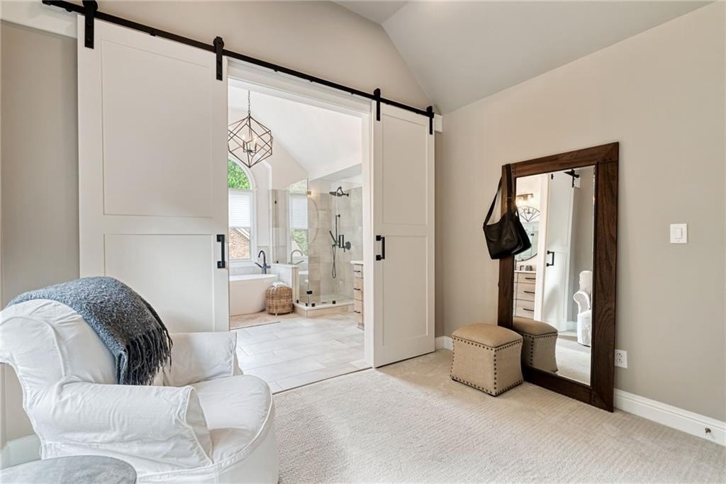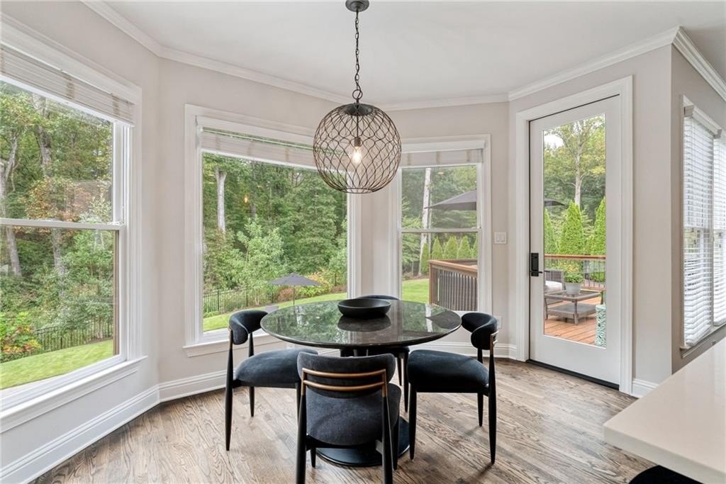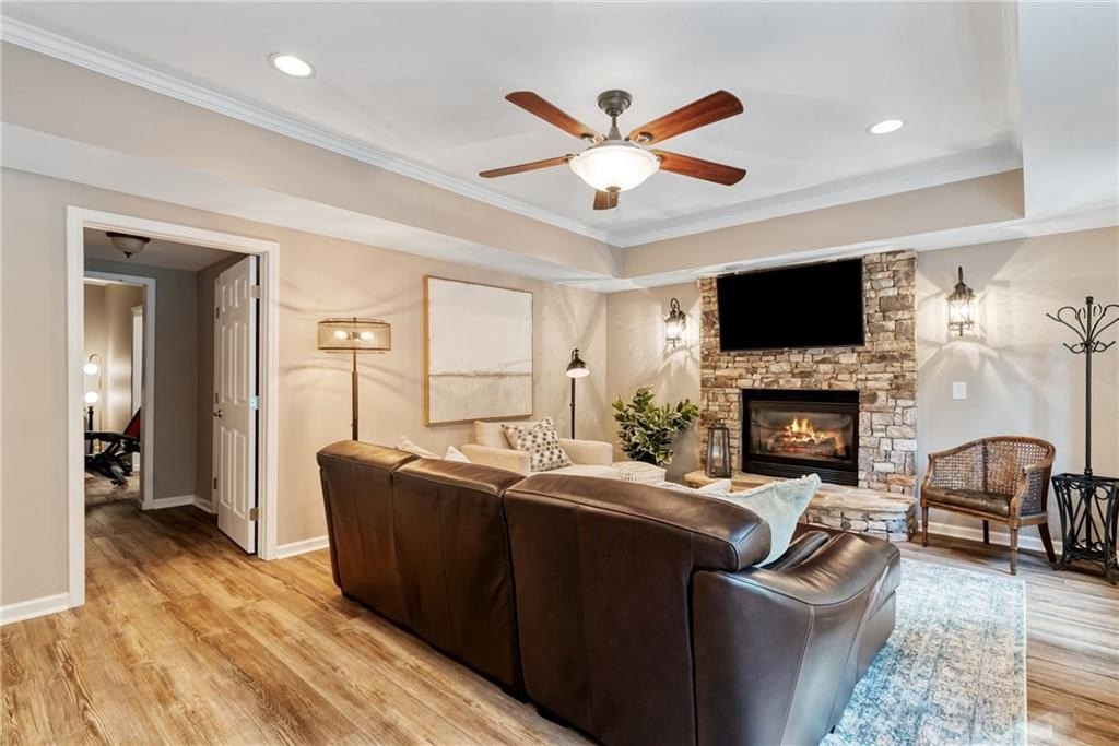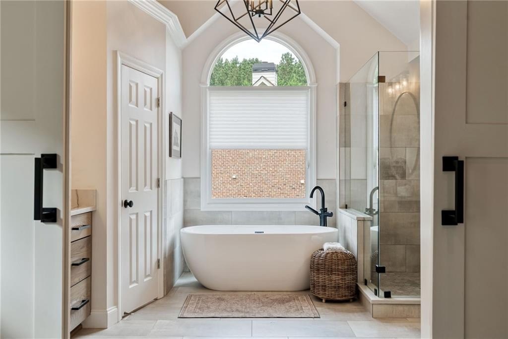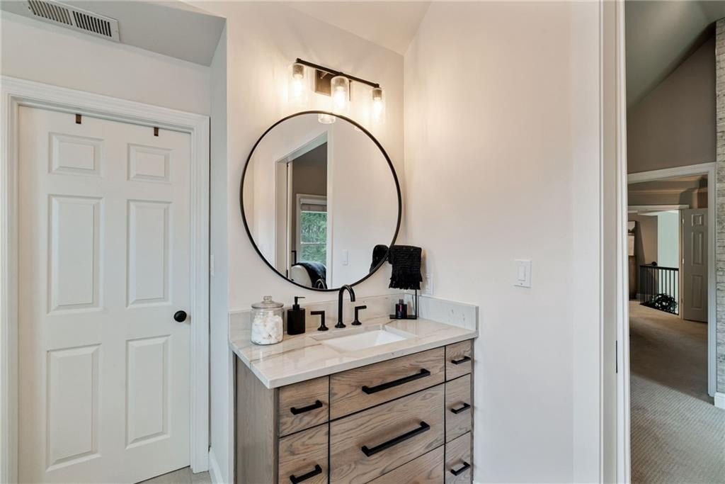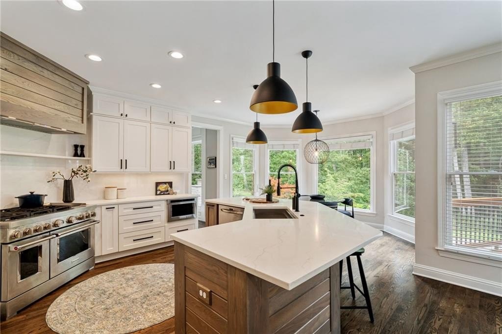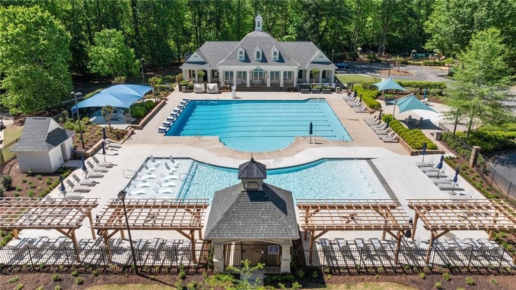 GORGEOUS BACKYARD OASIS JUST IN TIME FOR SUMMER! This 3 SIDE BRICK executive home has a RENOVATED KITCHEN AND MASTER BATH! Gorgeous designer touches throughout the home! 3 YO HEATED SALT WATER POOL w/ waterfall and tanning ledge, STACKED STONE OUTDOOR FIREPLACE and FLAT, LANDSCAPED, FENCED PRIVATE YARD make this one a stand out! EXPANSIVE WRAP AROUND SIDE AND REAR DECKS are perfect for friends and family gatherings. High trey ceilings and great views overlooking the wooded backyard are an additional bonus. The main floor has a 2 story foyer & living area with floor to ceiling windows. Enjoy this open floor plan with fully renovated kitchen featuring custom white oak island & range hood, quartz countertops, stainless steel KitchenAid appliances including a 6 burner gas freestanding range with double oven. Formal dining room and home office flex space round out the main level. UPSTAIRS you will find a RENOVATED MASTER SUITE WITH A DOUBLE SIDED FIREPLACE open to the master bedroom and the master spa bath with custom white oak cabinets. This space has a private sitting / dressing area as well. 3 additional secondary bedrooms (each with direct access to a full bathroom) complete this floor. ALL SECONDARY BATHROOMS HAVE BEEN UPDATED as well. The TERRACE LEVEL features a kitchenette / bar area, gym, several finished flex spaces, secondary home office - perfect for entertaining (or multi-generational living in-law suites) & a full bedroom and bathroom suite. The family / TV room has raised tray ceilings and another stacked stone fireplace and WALK OUT ACCESS FROM THE BASEMENT TO THE POOL DECK. GREAT CUSTOM, ENCLOSED STORAGE AREA under the deck! All new fixtures and modern lighting with center island. Most windows replaced 2021, hardwoods refinished, garage floor has epoxy finishes. Residents enjoy premier amenities including a junior Olympic pool and a second zero entry pool that was added just a couple of years ago. Enjoy miles of scenic walking trails through a private nature preserve along the Chattahoochee River, and a full sports complex with six lighted tennis courts, outdoor half court basketball, baseball field, soccer field, and sand volleyball. 2 fishing lakes, a fenced playground and updated clubhouse with fitness room round out the amenity package.