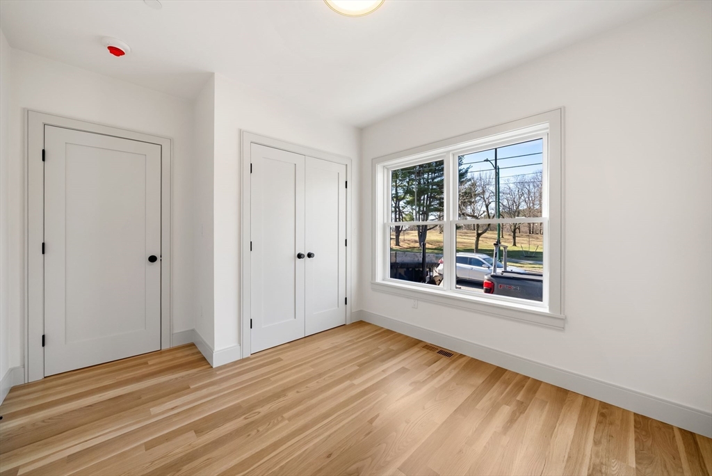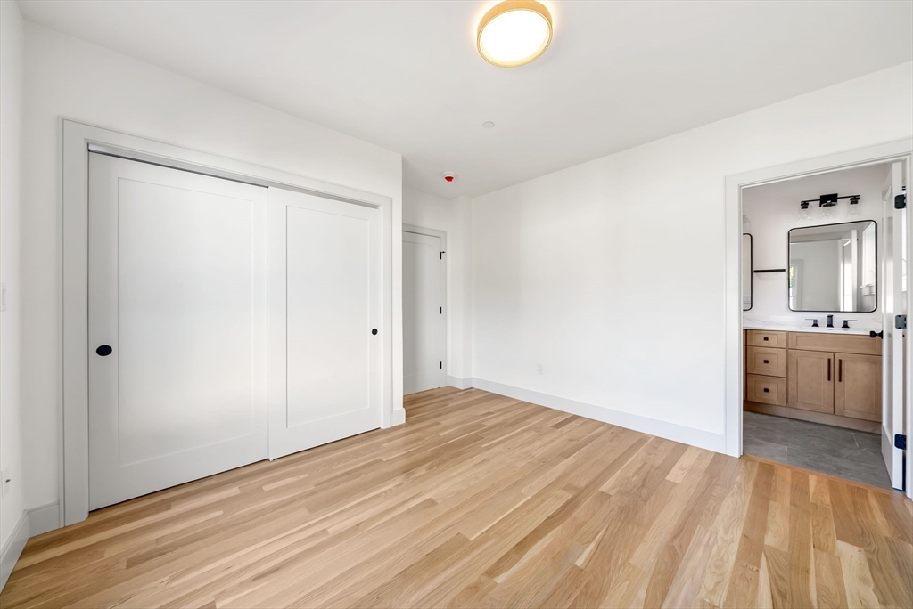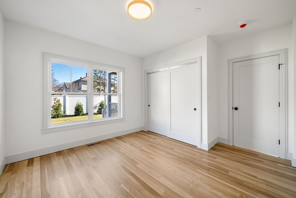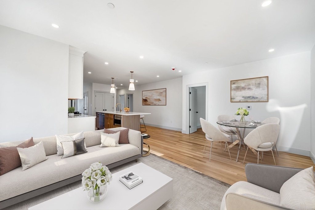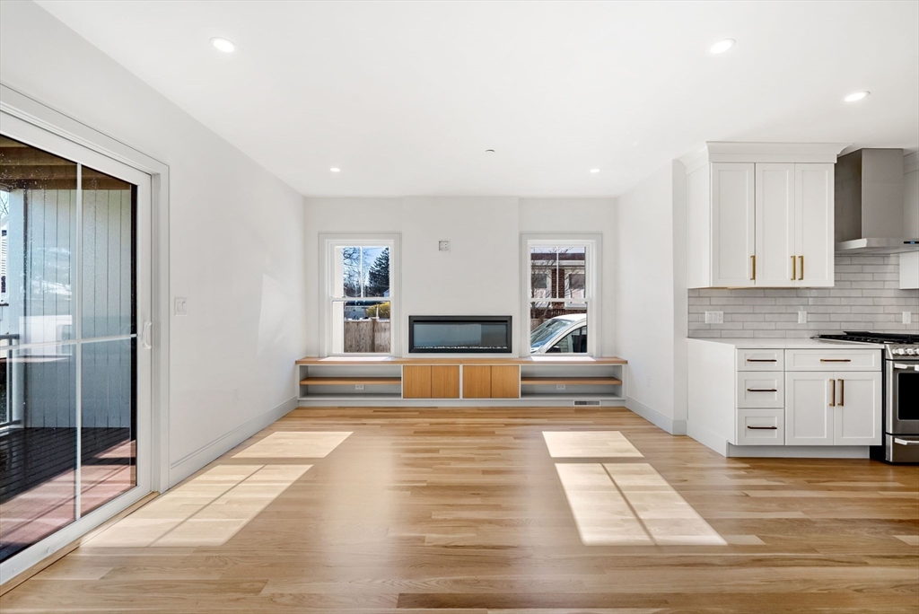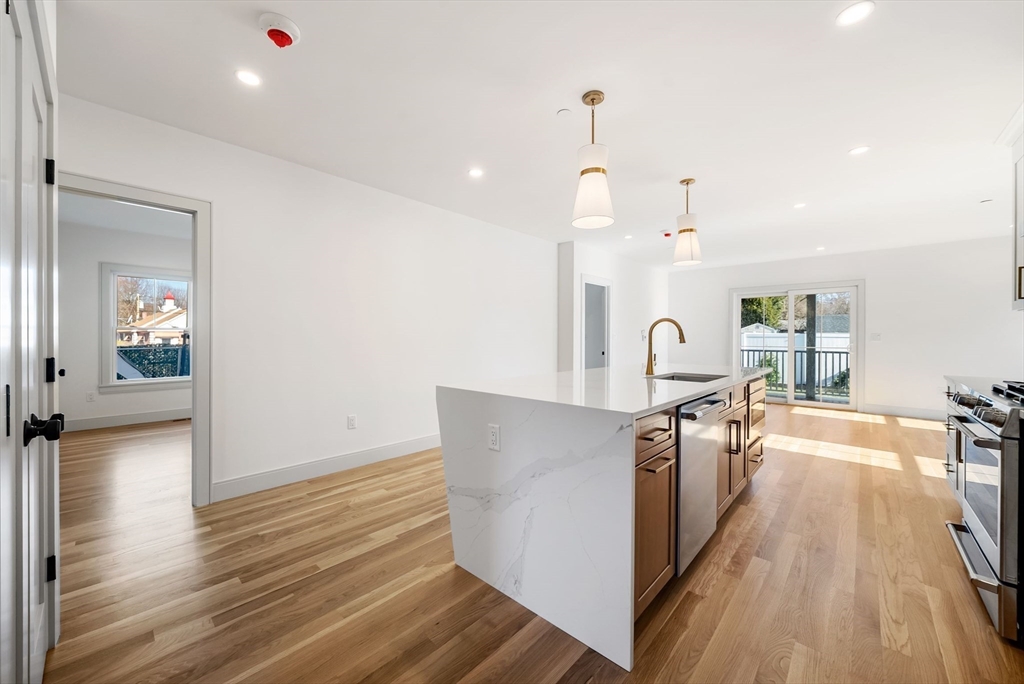 Perfectly positioned across from Spot Pond, this newly constructed 3-bedroom, 2-bath luxury residence offers a refined blend of elevated design and natural beauty. This direct-entry first-floor home is thoughtfully crafted with custom finishes throughout, showcasing white oak flooring, bespoke cabinetry, and elegant quartz surfaces in both the kitchen and baths. The open-concept layout is designed for modern living and effortless entertaining, highlighted by stunning custom-designed living room built-ins anchored by a sleek, modern fireplace. A private ~200 sq ft deck extends the living space outdoors, while select rooms capture partial pond views, bringing a serene backdrop indoors. Ideally located just moments from the trails of Middlesex Fells Reservation and Stone Zoo, with convenient access to Interstate 93, this residence offers an exceptional lifestyle of both tranquility and connectivity complete with two off-street parking spaces and dedicated storage.