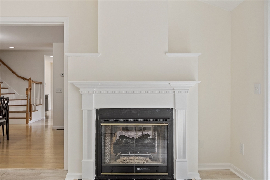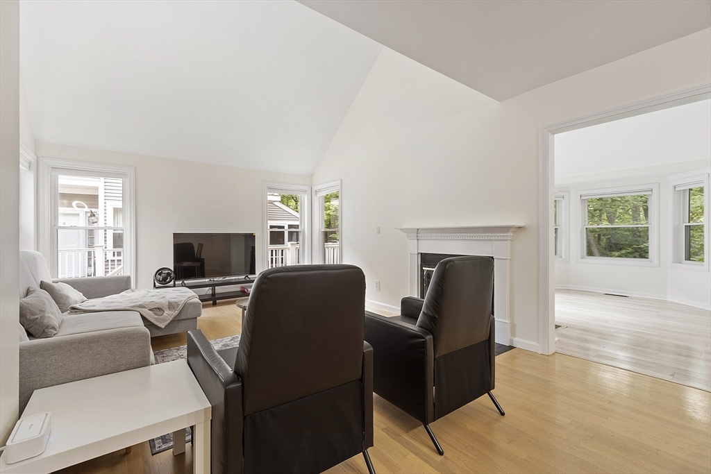 One of the largest units in this desirable complex. Walk into the updated kitchen with wall oven, cooktop, dishwasher, microwave. The light filled nook allows for a wonderful place for your morning coffee. The generous sized living room/dining room has a two sided fireplace to add that ambience for your gatherings. On the other side of the fireplace is a wonderful sitting room that leads to a deck that overlooks the private woods. Just off the sitting room is your cathedral master bedroom with ensuite. The second floor has 2 generous sized bedrooms and full bath. The stairs lead to a skylit bonus room. The lower level is finished with plenty of room full bath. One car garage with storage and additional parking in front of your unit. Guest parking is just across the way.