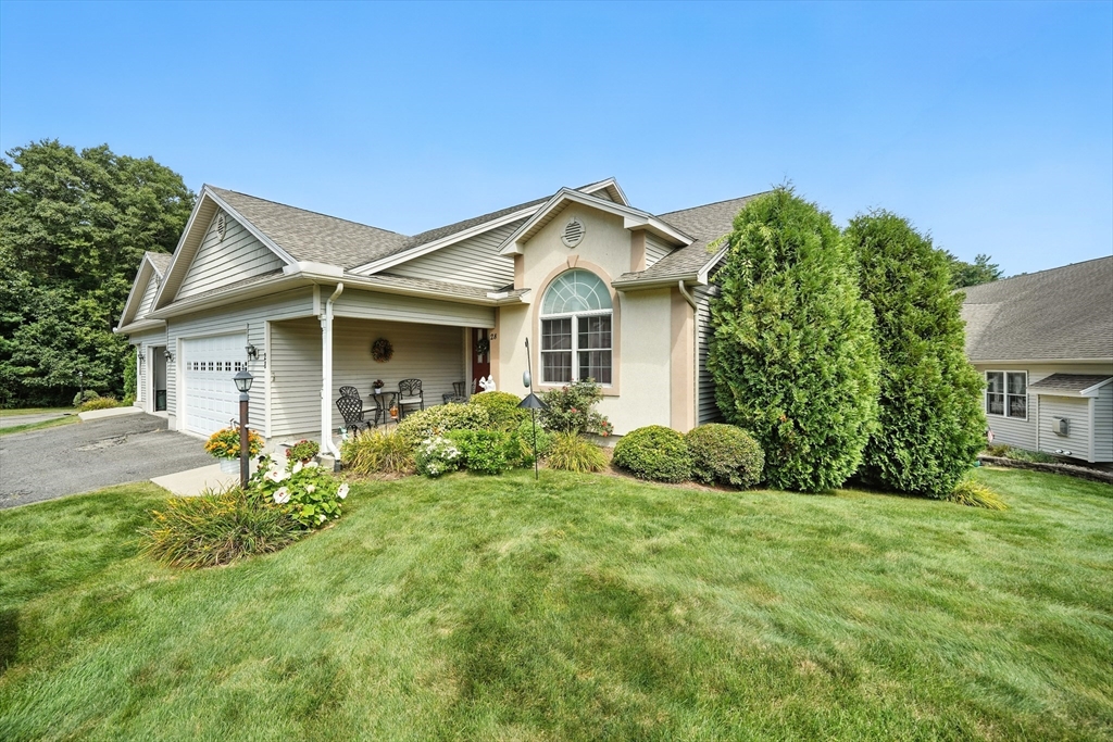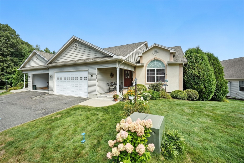 Welcome to Quaboag Heights, a premier 55+ community! This beautifully appointed condo offers 2 bedrooms, a private office, and a versatile bonus room with walkout access to a patio. The open-concept layout features vaulted ceilings, abundant natural light, and high-end custom finishes throughout. Enjoy spacious walk-in closets, generous storage, and a 2-car garage with epoxy flooring, gas heating, and a dedicated workshop area. Outdoor living shines with two patios and a deck, perfect for entertaining or relaxing. Designed for comfort and convenience, this low-maintenance home blends style, functionality, and community living at its best.