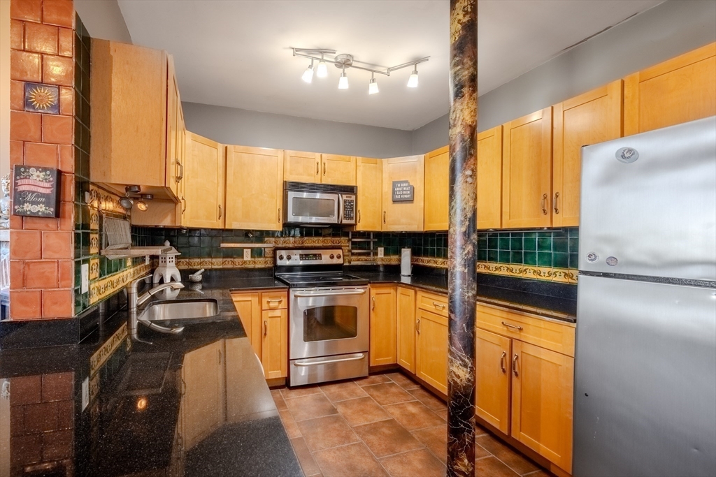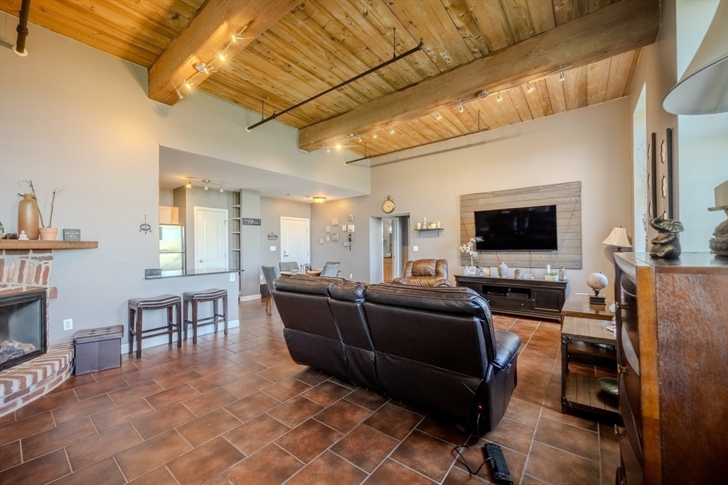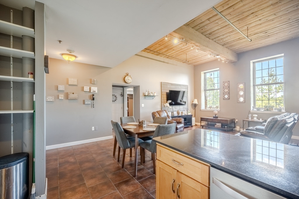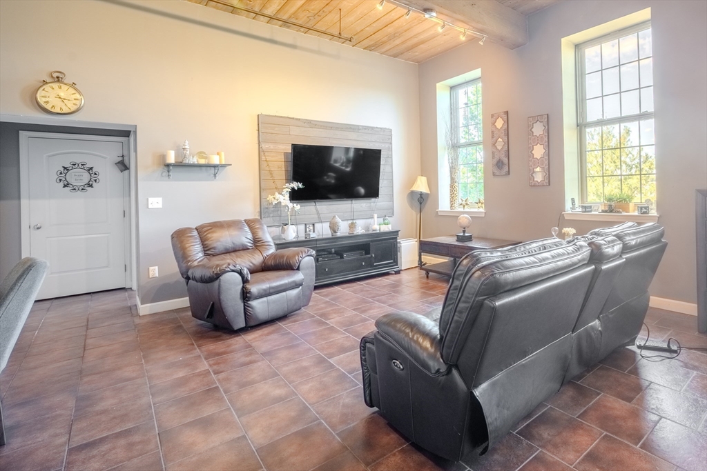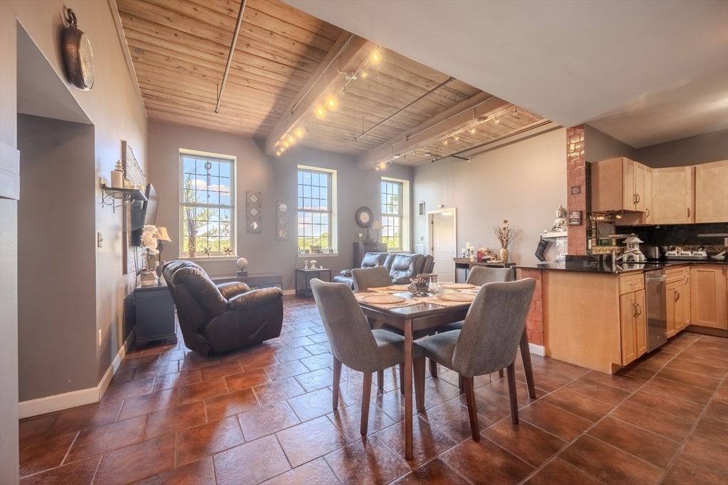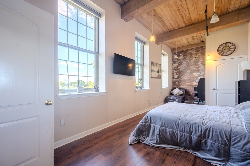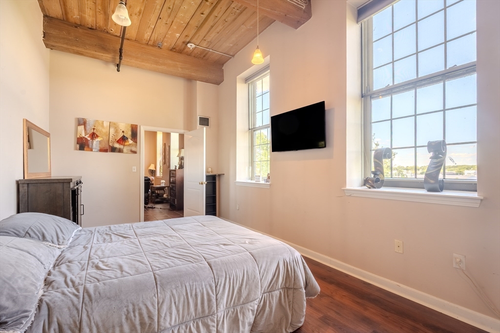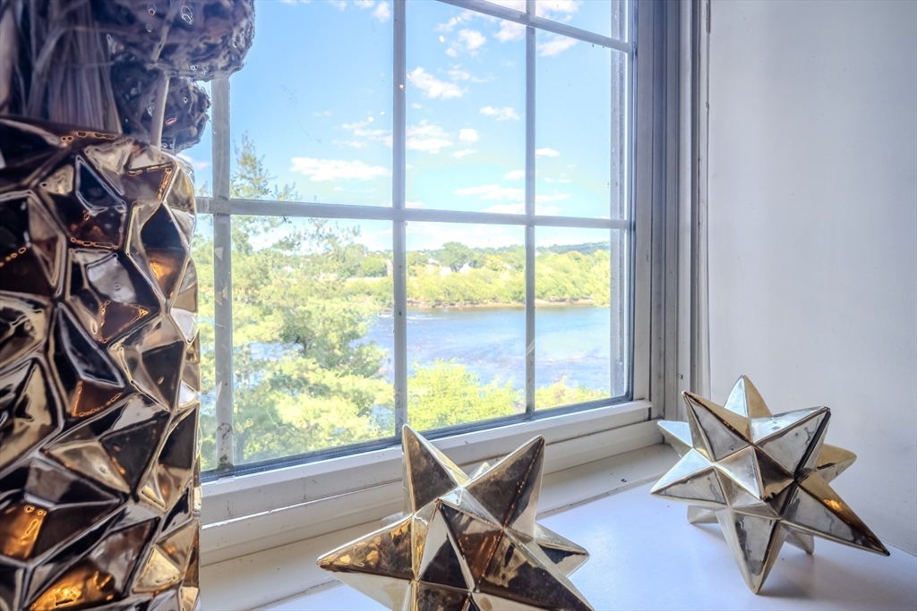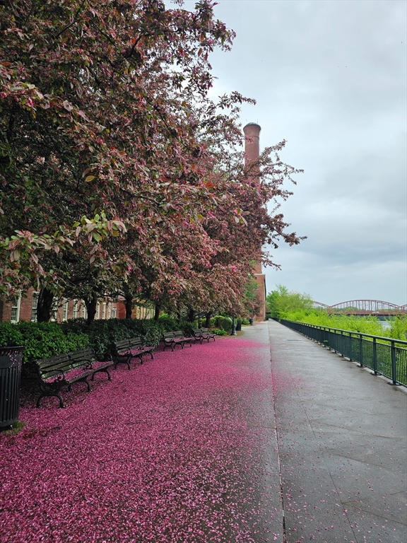 Desirable 4th-floor unit with stunning river views—one of the largest in the complex at 1,491 sq ft! This spacious 2 bed, 2 full bath condo at Renaissance on the River features soaring 14’ ceilings, exposed brick and beam, and oversized mill windows that flood the space with natural light. The open-concept layout includes a modern kitchen with granite counters and stainless appliances, a generous living/dining area, and a private primary suite with ample closet space and full bath. Central A/C, in-unit laundry, and one deeded parking space add everyday convenience. Enjoy elevator access, fitness center, secure entry, and professional management. Ideally located in the Hamilton Canal District, close to downtown dining, UMass Lowell, the Tsongas Center, and the commuter rail. A rare opportunity to own a sunlit, upper-floor unit with character, comfort, and panoramic views.