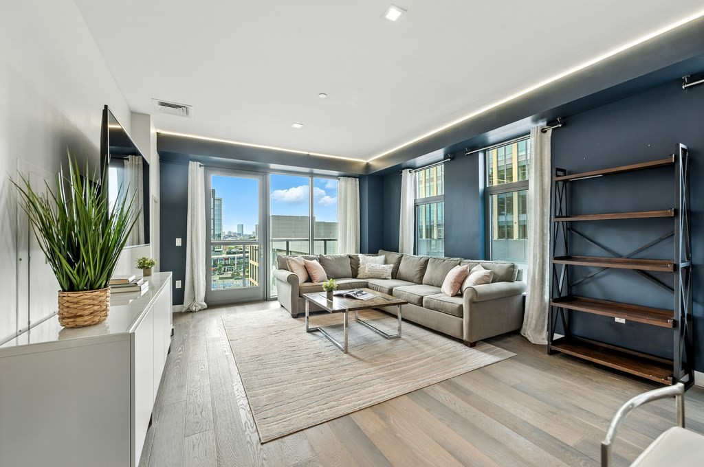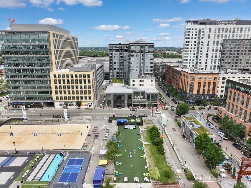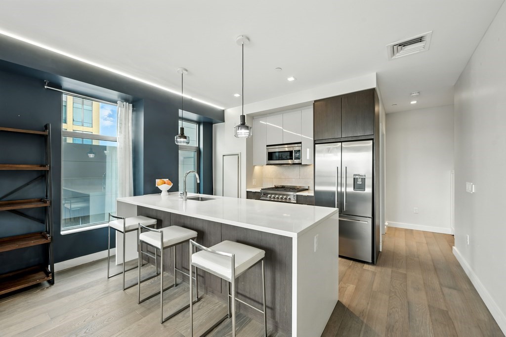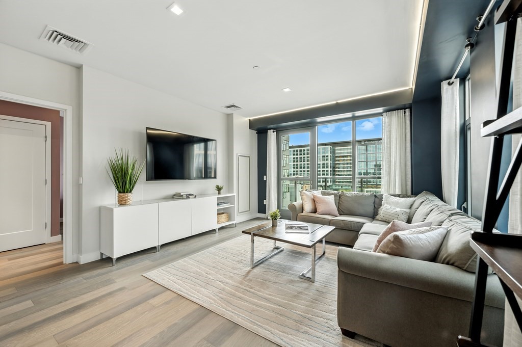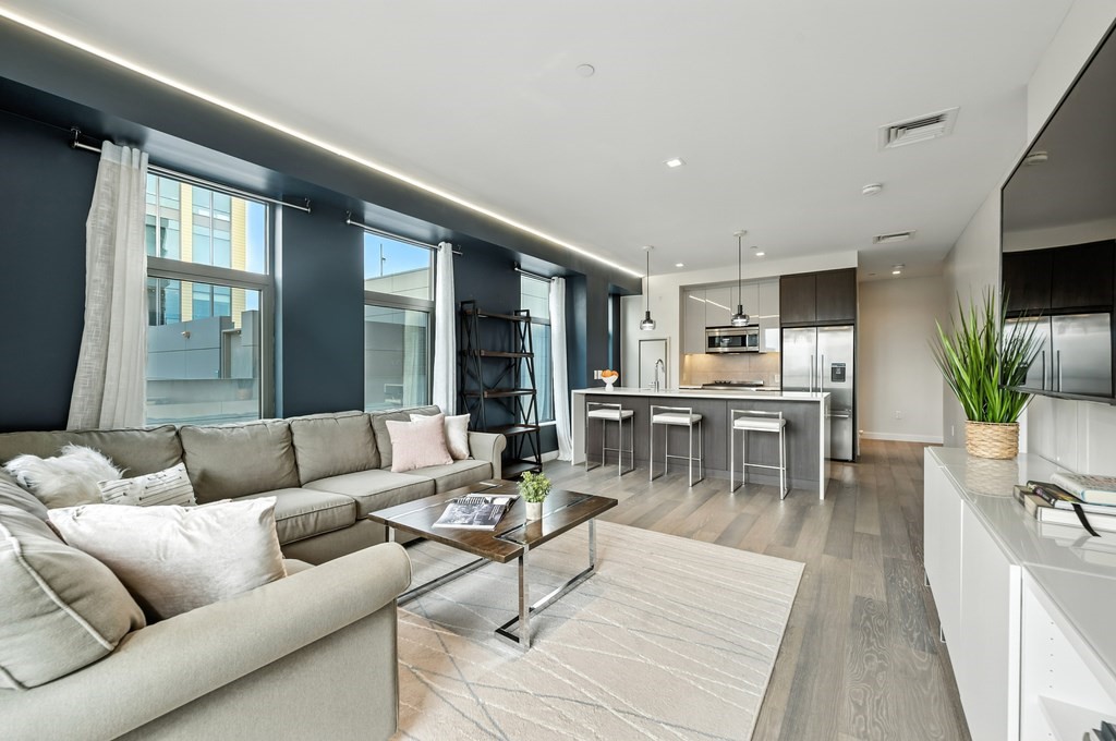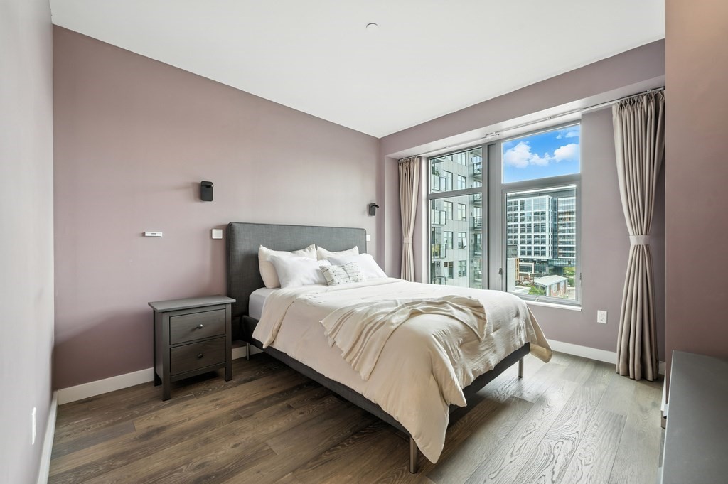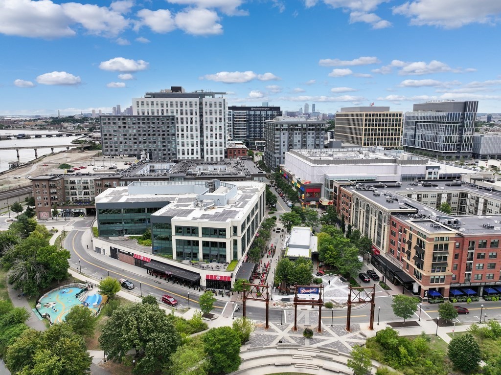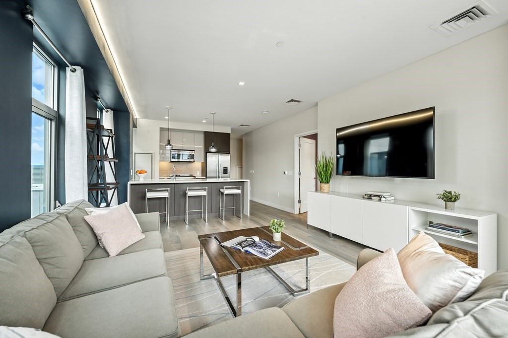 Welcome to Alloy Condominiums, a 2018 concierge elevator building in vibrant Assembly Row. This stunning 2-bed, 2-bath corner unit offers a southwest exposure with floor-to-ceiling windows and a private balcony showcasing sweeping city views, including the Hancock Tower. The modern kitchen features stainless steel appliances and a peninsula perfect for dining or entertaining. The spacious primary suite includes a walk-in closet and sleek en-suite bath with a walk-in shower. A second full bath and versatile guest bedroom/home office complete the layout. Hardwood floors and in-unit laundry provide everyday convenience. Enjoy luxury living with amenities like a concierge, clubroom with direct access to roof deck with lounge chairs. Also enjoy a state-of-the-art gym and indoor pool — shared with the Row Hotel. One deeded garage parking near the elevator. Close to shopping, cafes & restaurants, Trader Joe’s, and the Orange Line T—only 3 stops to Boston. Move right in!
