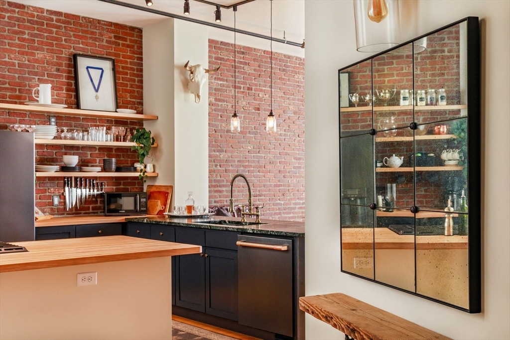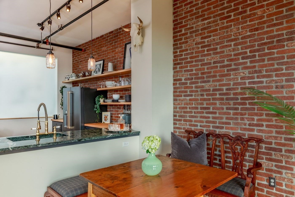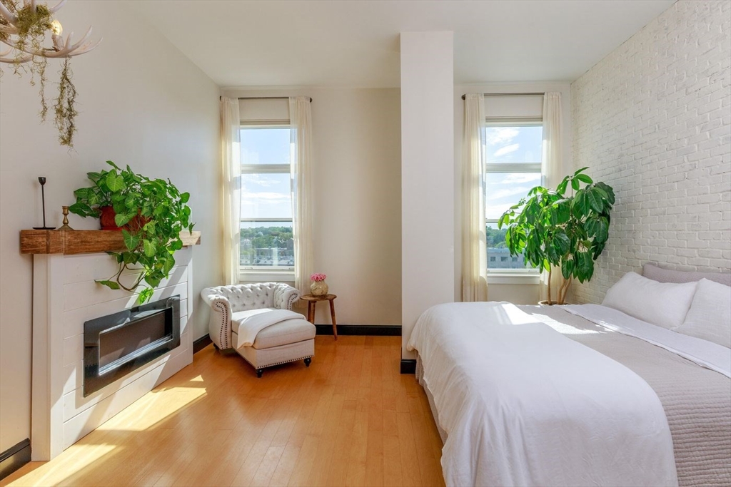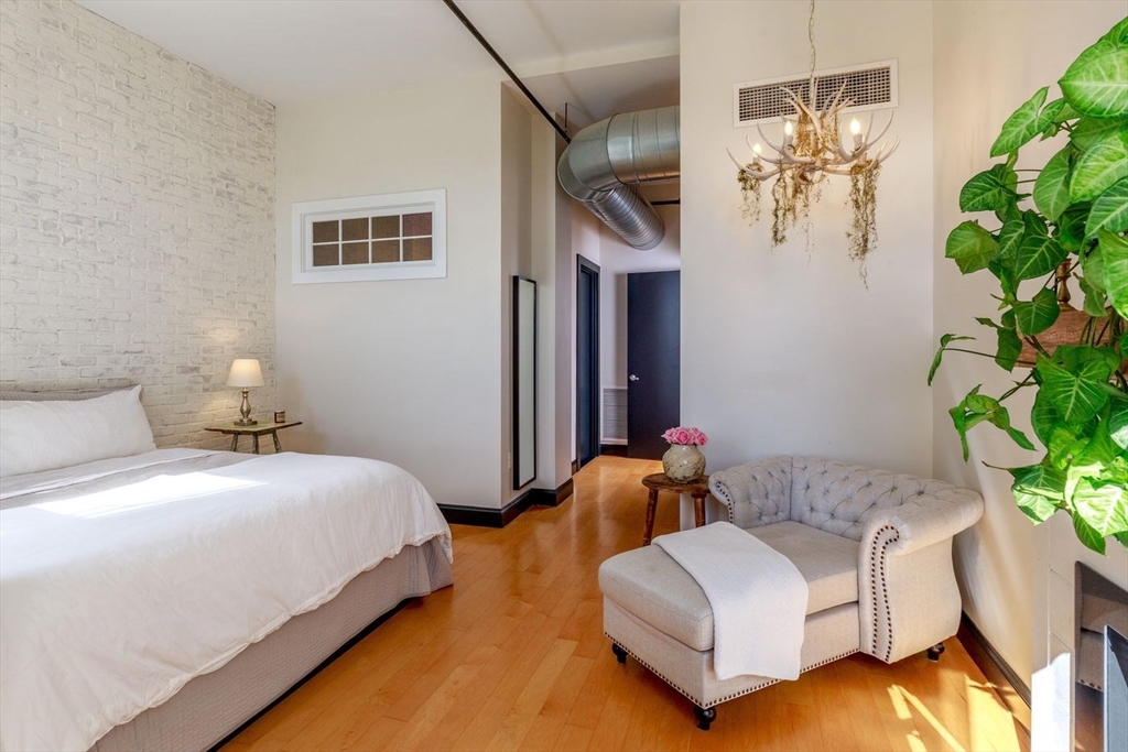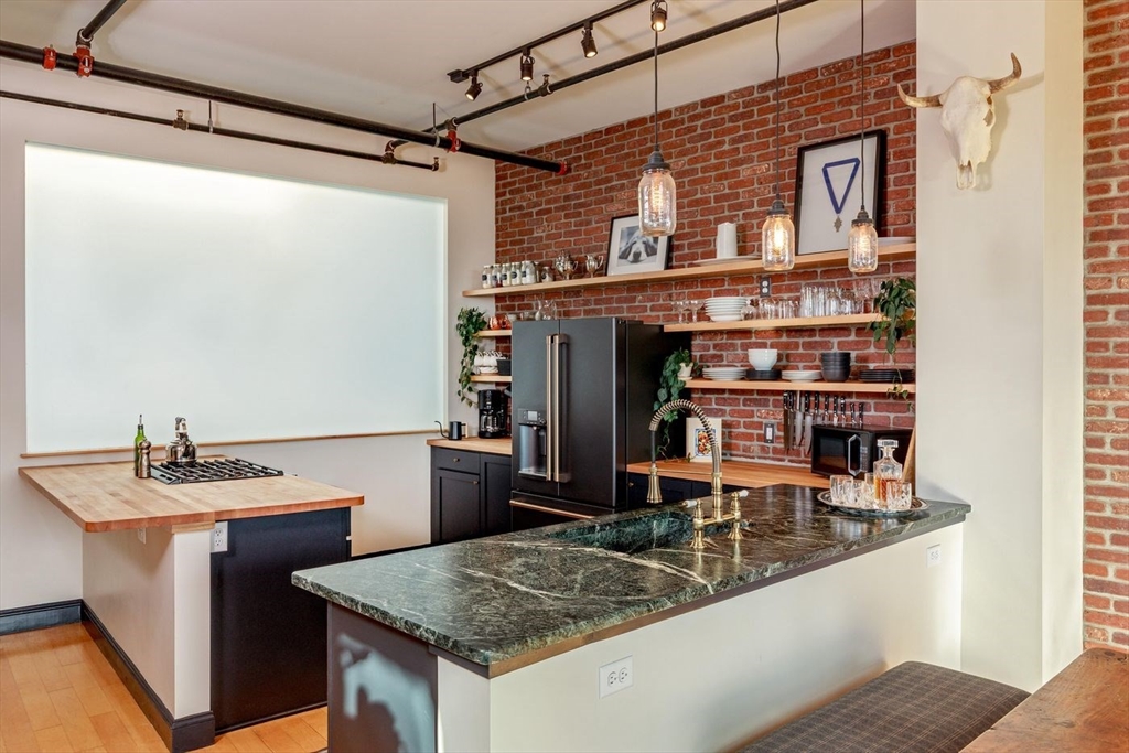 Derby Lofts rare 1,520± SF corner penthouse with 161± SF private balcony in Downtown Salem, just 5 blocks to commuter rail and minutes to the Boston Harbor Ferry. Enjoy the best sunsets in Salem from soaring 10’+ ceilings, dramatic windows, and sweeping city views. A 2024 kitchen renovation features new appliances, maple butcher block counters, a soapstone wet zone with custom sink, open shelving, custom cabinetry with pull-outs, exposed brick, and industrial lighting. Living/dining area with floor-to-ceiling custom bookcase and ladder. Primary suite with 2023 spa-inspired bath—walk-in shower, marble hex tile, new vanity, fixtures, and lighting—plus lime-washed brick accent, chandelier reading nook, and electric fireplace. Balcony with new decking. Building amenities include 2 elevators, skylit atrium, and secure entry. Two covered garage parking spaces available by lease (first-come, first-served). Shops, dining, PEM, waterfront, and arts venues at your doorstep.