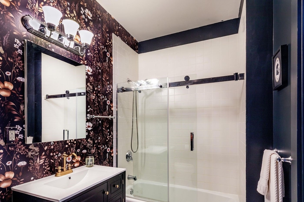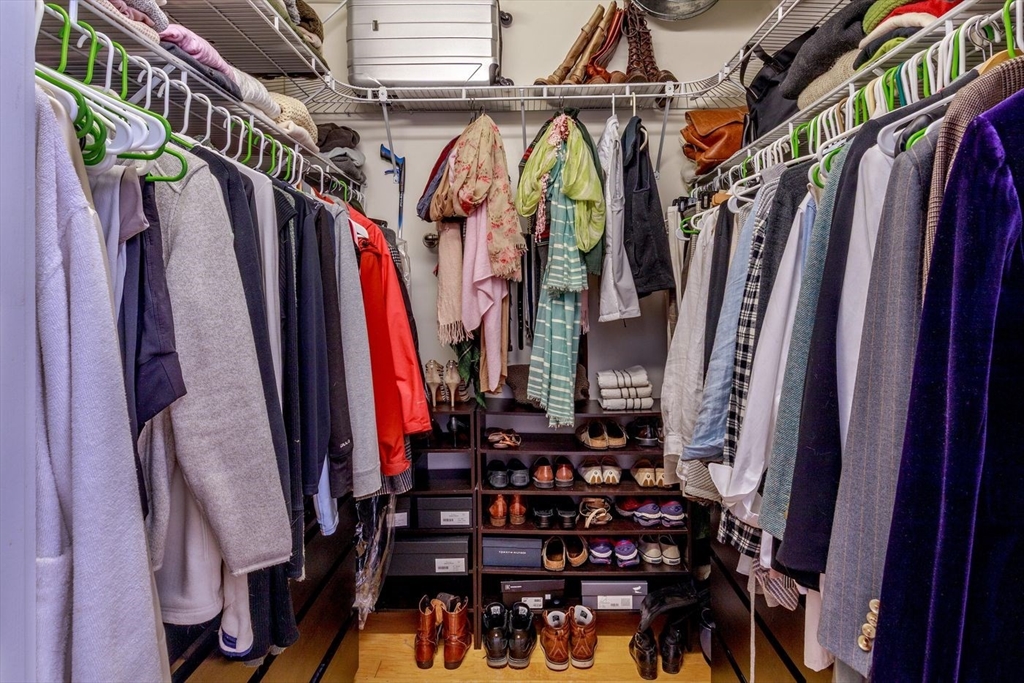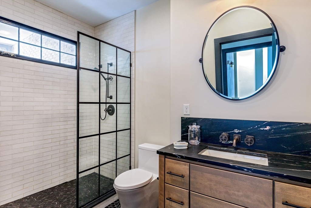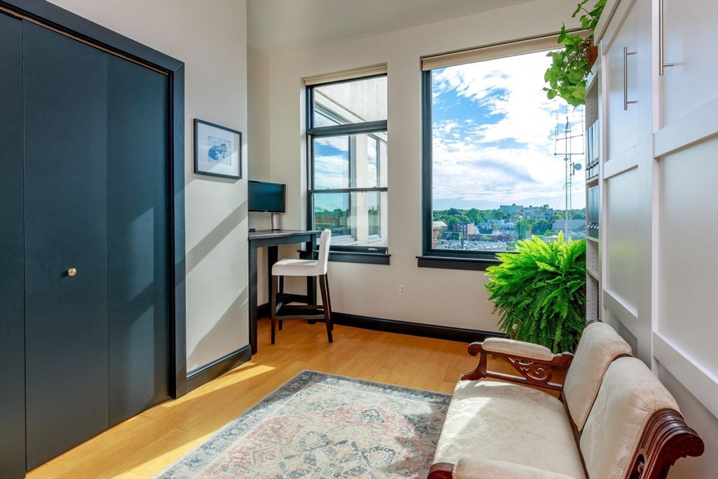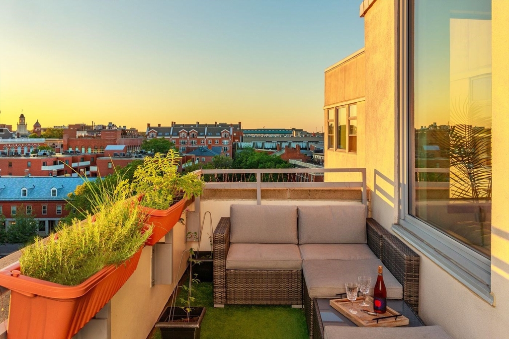 Derby Lofts rare 1,520± SF corner penthouse with 161± SF private balcony in Downtown Salem, just 5 blocks to commuter rail and minutes to the Boston Harbor Ferry. Enjoy the best sunsets in Salem from soaring 10’+ ceilings, dramatic windows, and sweeping city views. A 2024 kitchen renovation features new appliances, maple butcher block counters, a soapstone wet zone with custom sink, open shelving, custom cabinetry with pull-outs, exposed brick, and industrial lighting. Living/dining area with floor-to-ceiling custom bookcase and ladder. Primary suite with 2023 spa-inspired bath—walk-in shower, marble hex tile, new vanity, fixtures, and lighting—plus lime-washed brick accent, chandelier reading nook, and electric fireplace. Balcony with new decking. Building amenities include 2 elevators, skylit atrium, and secure entry. Two covered garage parking spaces available by lease (first-come, first-served). Shops, dining, PEM, waterfront, and arts venues at your doorstep.
