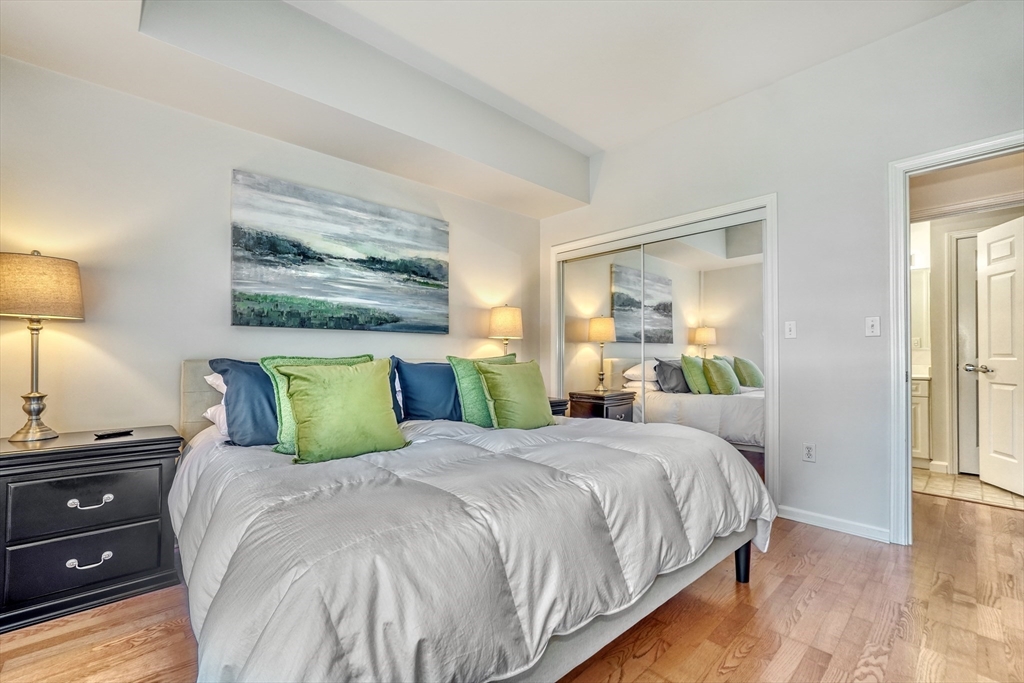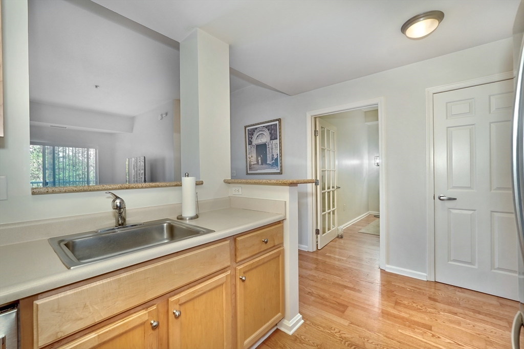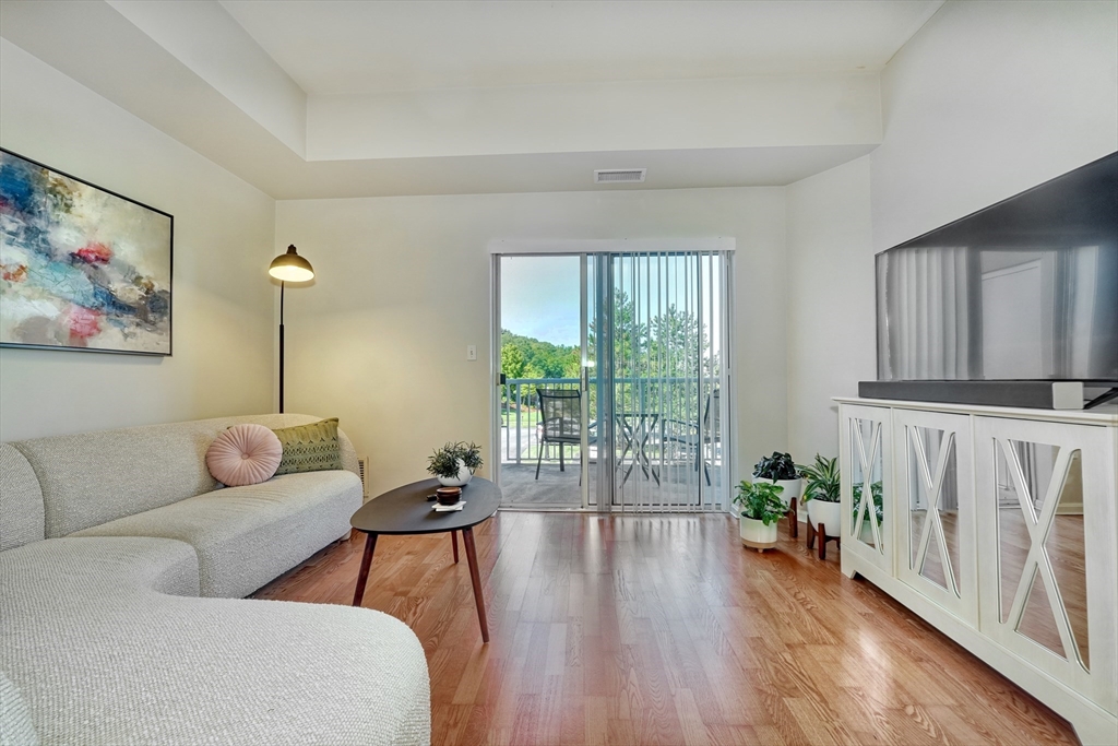 Beautifully updated move-in ready one bedroom condo with a bonus office/den at the sought after Ironwood on the Green!. This spacious and sunny home boasts warm wood floors throughout & features a spacious open living room and dining room combo with sliders to the private balcony! The primary bedroom is bright & roomy too & the kitchen offers nice site lines to the outside! The bonus/ flex room works well as an office but could also be a guest bedroom! In-unit laundry, all new kitchen appliances in 2020, HVAC new in 2023, and water heater in 2024. Located in the building that has the inviting in-ground pool right outside the front door along with community room, gym & library! Great commuting location too, as Rts. 95, 1, 128 are close by! Elevator and 1 car parking and the golf course is right out the door too!