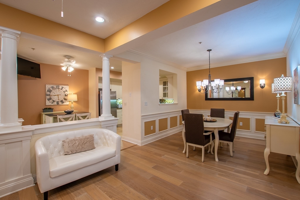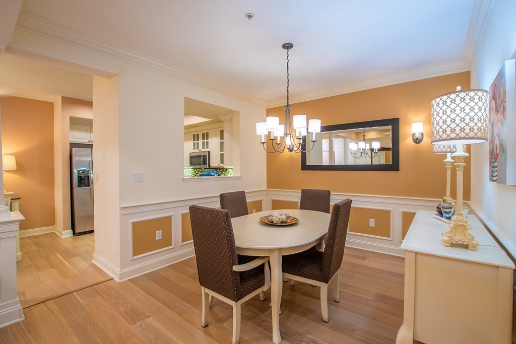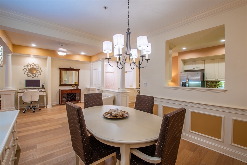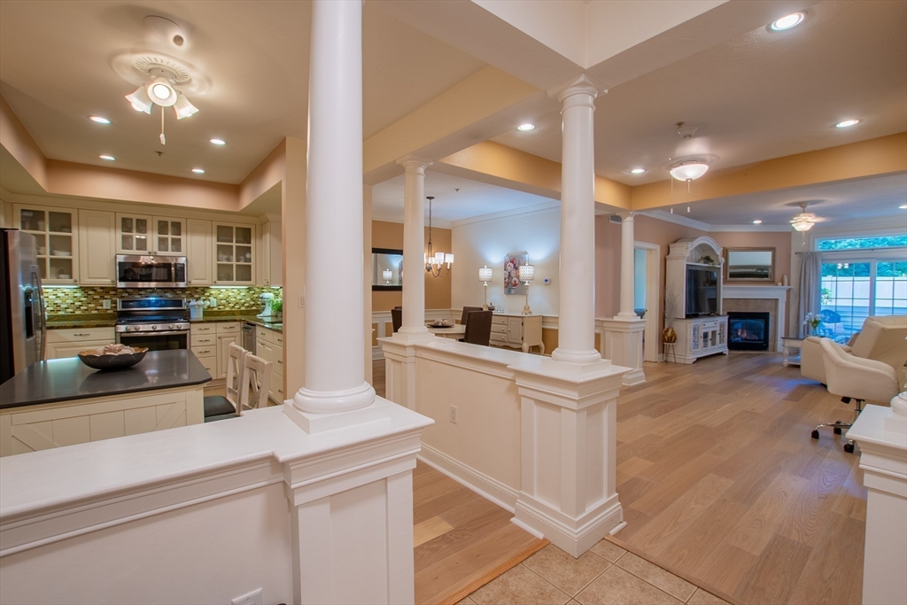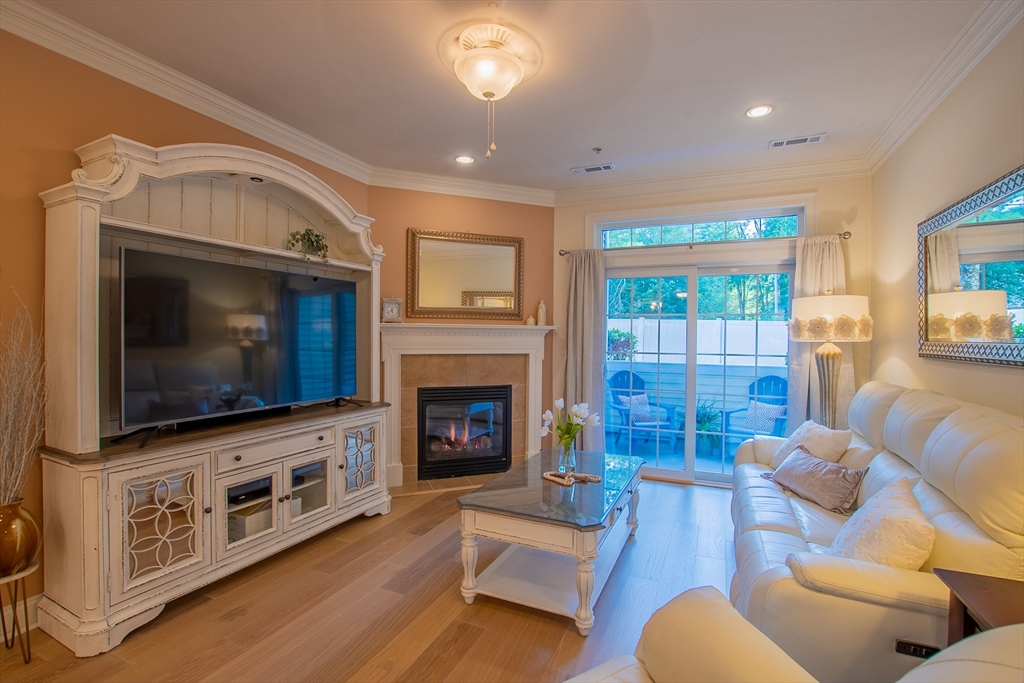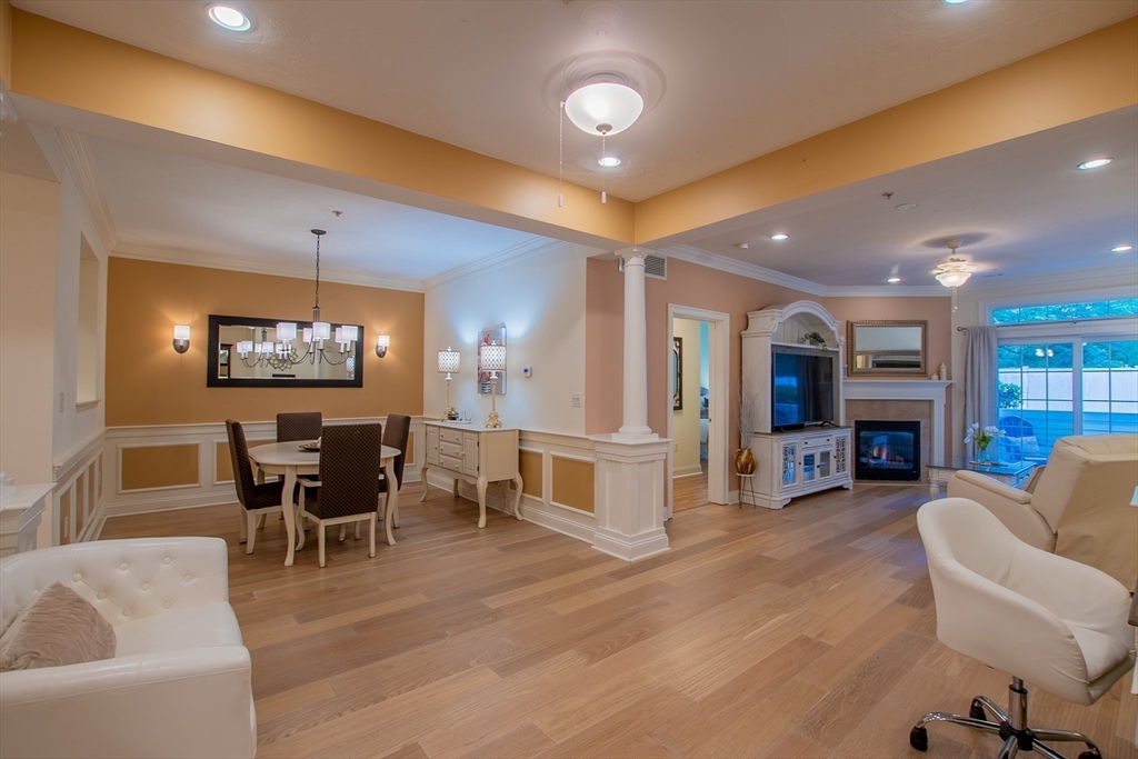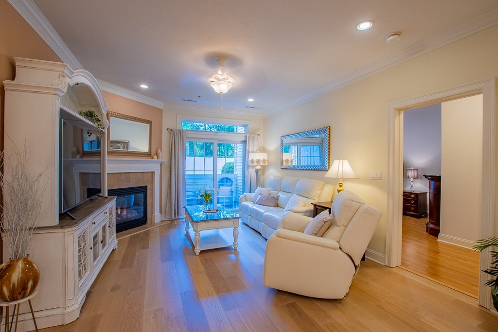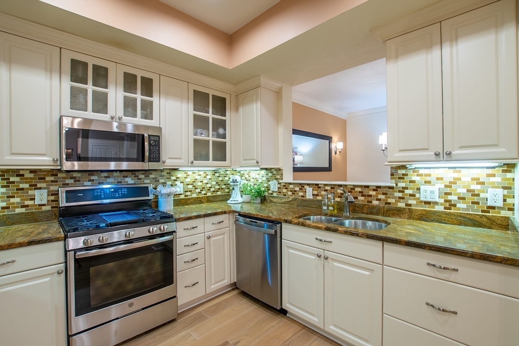 Beautifully maintained two-bedroom, 2.5-bath condo in desirable Bedford. This spacious unit features an updated kitchen with tiled backsplash, granite countertops and stainless steel appliances. The open-concept living and dining area showcases enhanced woodwork, including crown molding and wainscoting, plus updated flooring throughout. The generous primary suite offers two walk-in closets and an en suite bath with whirlpool tub and double vanity. The second bedroom has a private full bath. Additional highlights include in-unit laundry, gas fireplace, central A/C, covered patio, and two assigned garage parking spaces. Conveniently located near Route 128/95, shops, restaurants, and Bedford’s top-rated schools—ideal for professionals, downsizers, or anyone seeking a move-in-ready home with low-maintenance and single-level living full of sophistication.